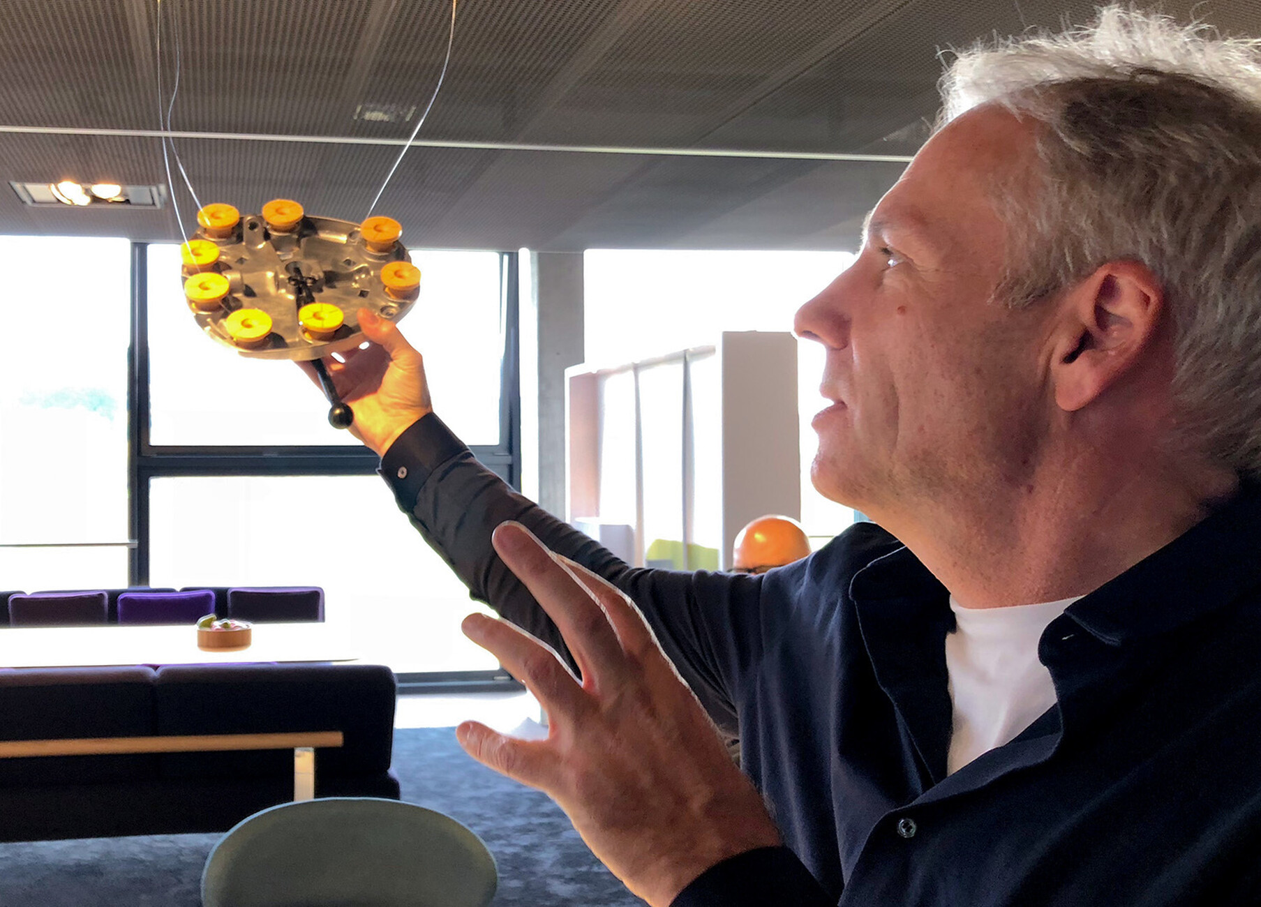 Dietiker’s installation likewise caused a stir: Inspired by a swimming pool, it represented a stage-worthy setting. Here the chairs, surrounded by soap bubbles and bathed in blue light, floated in large plastic balls above visitors’ heads. Under the watchful eye of the pool attendant, visitors were allowed to traverse this fantasy space, though jumping in was strictly forbidden. By contrast, Création Baumann used projections to present its industrial facilities in a dramatic light and permitted visitors a peek through the keyhole with a tour of its in-house design studio and refurbishing workshop. For Girsberger, the designer duo Greutmann Bolzern presented the swivel chair “Simplex 3D,” which permits intuitive movements thanks to its 3D mechanism. “We wanted to design a chair that makes casual sitting possible,” explains Urs Greutmann-Bolzern. Similarly flexible was the design by Atelier Oi for Girsberger: The lounge range “Velum” includes single armchairs, two- and three-seaters, and combined with oak panels and textile covers creates a cozy micro space for focused work and confidential discussions. “You can determine how far apart you wish to sit from the other person thanks to the space-defining elements,” says Aurel Aebi.