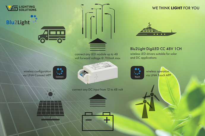 In the form of “Blu2Light”, Vossloh-Schwabe has launched an LED driver for battery systems and solar luminaires that is ideal for use in networked solar-powered streetlights. The system is also optimally suited for off-grid island systems like those used for boats or caravans. Its flexibility proves itself at various levels: It is the first open Bluetooth system with mesh functionality, meaning any LED module can be connected up. This avoids device multiplicity, and the number of electronic components can be drastically reduced.