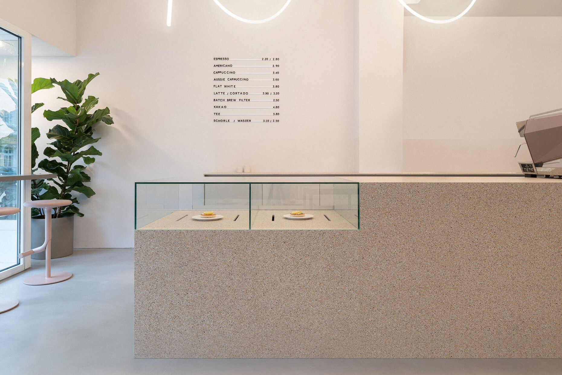 You realized the Van Dyck café in Cologne as a “Modbar” – a brand of La Marzocco, which has the espresso machine partly above counter and the rest tucked away beneath it. How does this technical solution alter the interior design of the café?