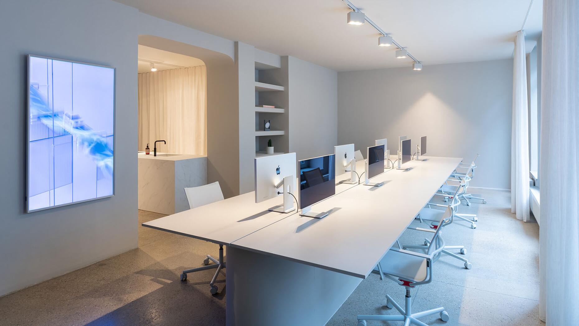 Designstudio Gerdesmeyer Krohn: In line with the manufacturer’s identity, our guiding idea here was innovation and quality. Hemro wanted a multi-purpose show space: So we designed a large space that can be divided into three zones. These can be separated from one another using curtains. The first section is really quite fancy: a Modbar with a meeting space. It’s a place to come together, drink a coffee at the table, and work on a laptop. Adjacent to it is a brand space-cum-showroom, where the new grinders and grinding components, for example, are presented. The highlight is a minimalist shelving system with a lighting concept which creates an ideal setting for the grinders. Behind that there is an academy space with two identically sized islands where using cutting-edge technology and in a lab-like atmosphere company staff members and Hemro partners receive top-notch training in preparing espresso and filter coffee. A modern and timeless interior has resulted from this combination of streamlined shapes, a variety of high-quality materials, and subtle colors.