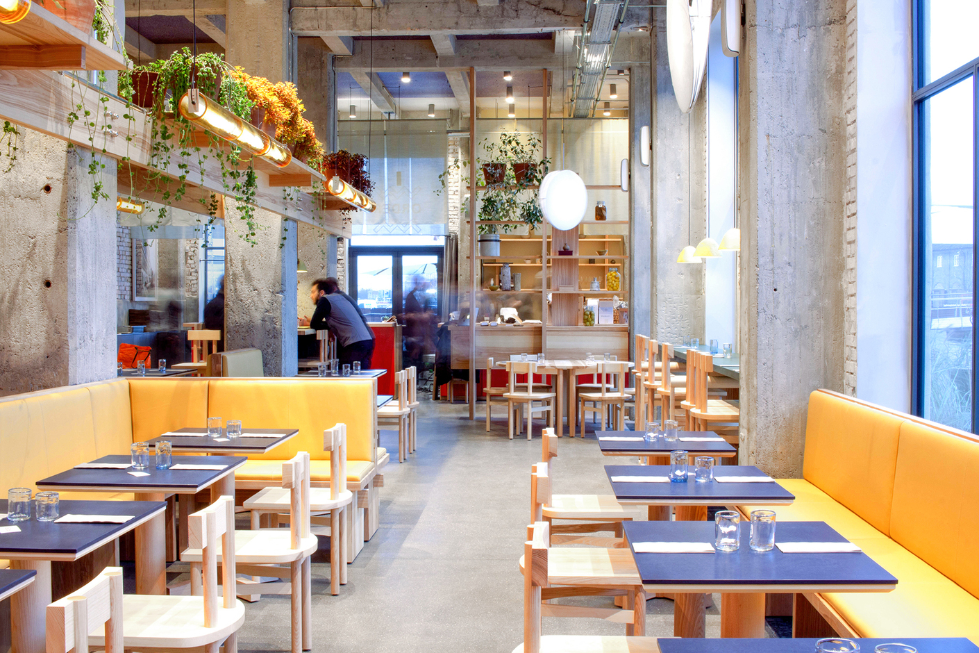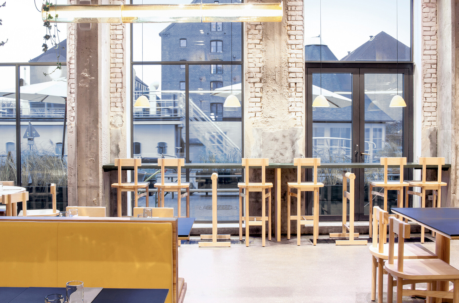 A suitable setting was provided in the spatial concept courtesy of Copenhagen-based Spacon & X. The necessary inspiration is provided by the restaurant’s relaxed gourmet cuisine and that venerable Japanese institution the izakaya, a kind of convivial bar. The interdisciplinary designers divided up the 500 m² of warehouse space available into different zones. The resulting atmosphere is an intimate one, thanks to the benches used throughout the entire establishment, which have been covered in a warm yellow hue. The architects simultaneously chose to focus on the walls, not all of which have been plastered, and on this industrial building’s characteristic concrete pillars, connected by a wooden bridge. This forms a kind of floral bridge adorned by tubs of plants, which divides up the space, as well as relativizing the height of the ceiling.