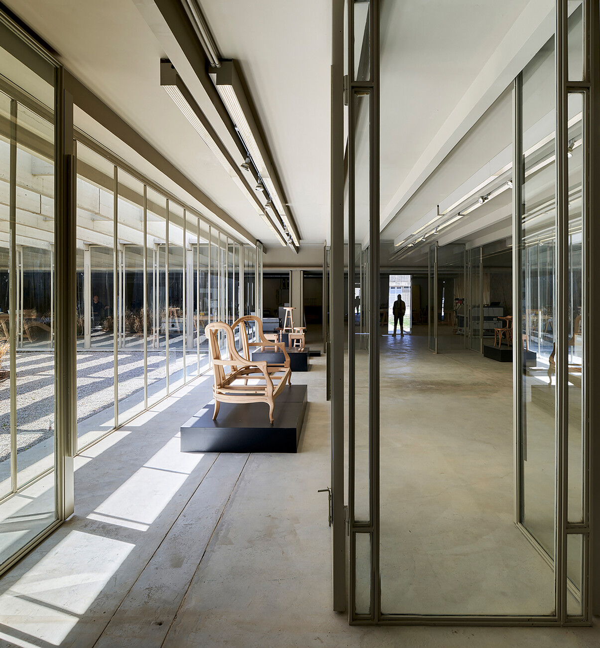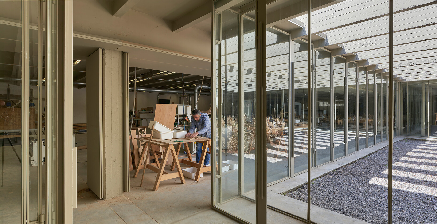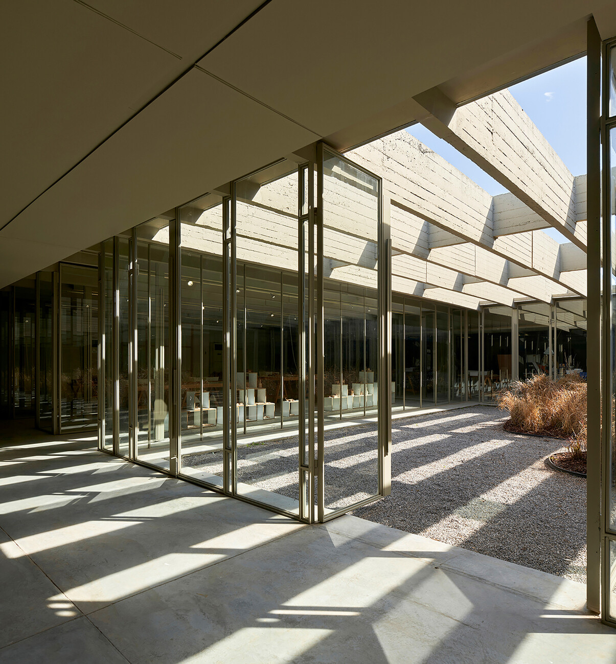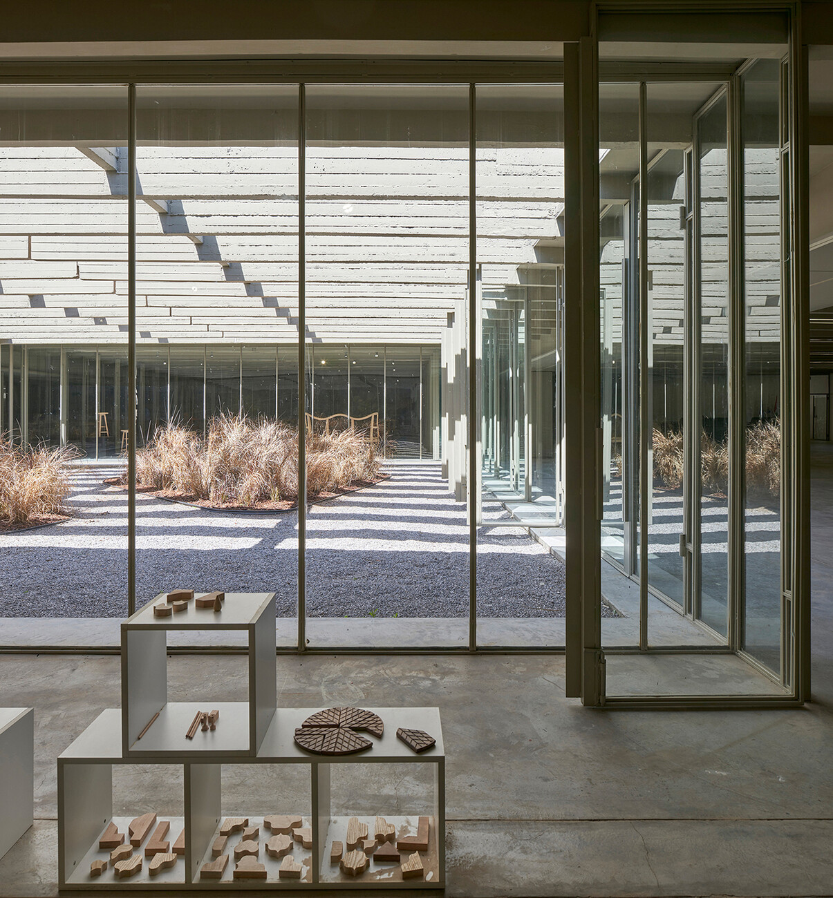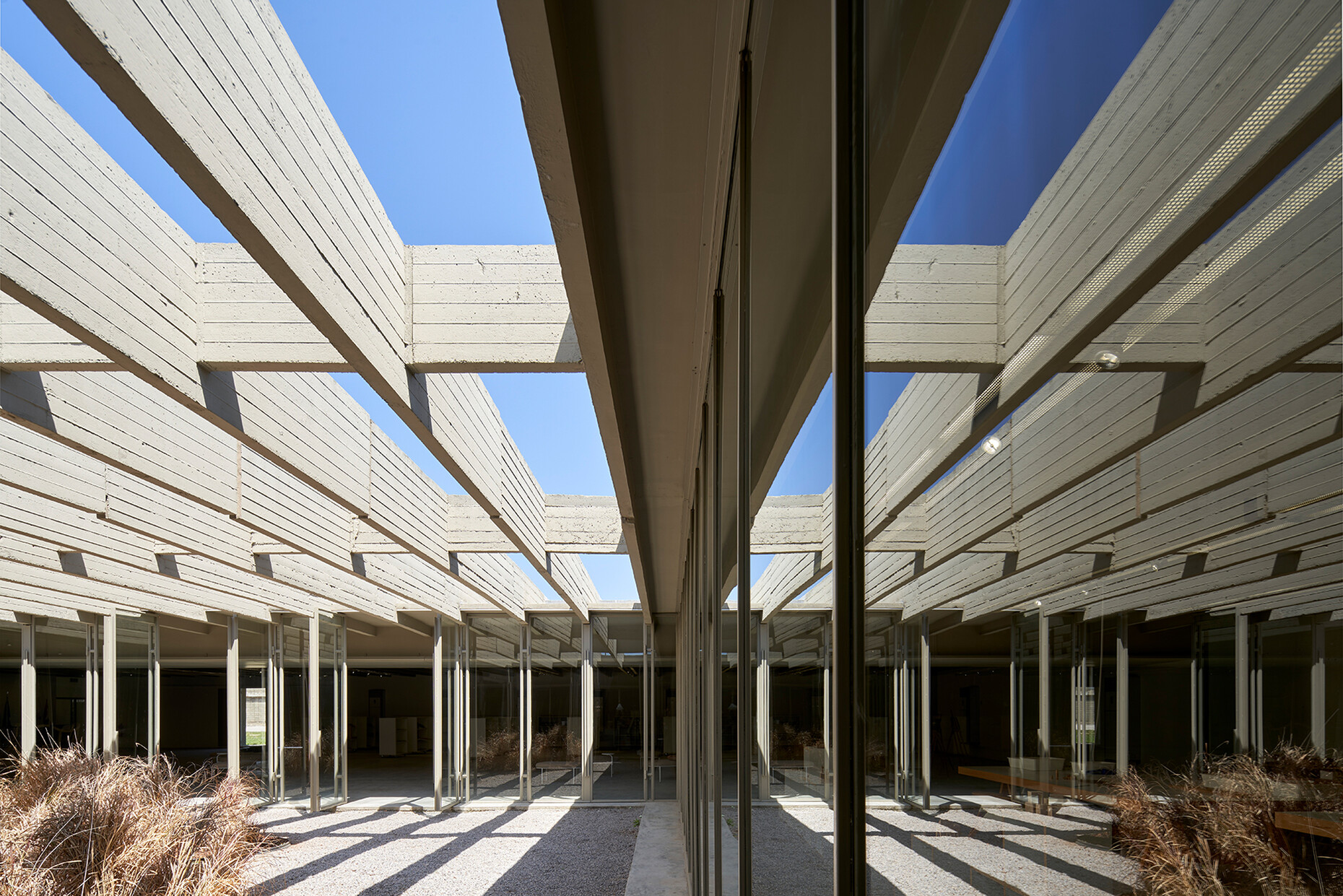 The approximately 2,500m2 former guest house has been divided into two main parts: The spaces formerly open to the public now house Minjara's carpentry workshops, showrooms and offices – this area was remodelled and renovated by East Architecture Studio within a tight deadline of just four months. In the rear section of the building, Niemeyer's plans called for 14 guest rooms with private bathrooms and courtyards, which are now in a semi-finished, unrenovated state due to cost constraints. The interior of the building has a central atrium with floor-to-ceiling windows on four sides, allowing natural light to stream into the surrounding rooms. The open space of the courtyard is planted with grasses and covered with a striking grid pattern made of reinforced concrete struts, which create an interesting interplay of light and shadow. The view from the courtyard extends into the large adjacent workshops, exhibition rooms and materials library, while the offices, wash rooms, storage and technical rooms are all located behind the workshops on one end of the building.