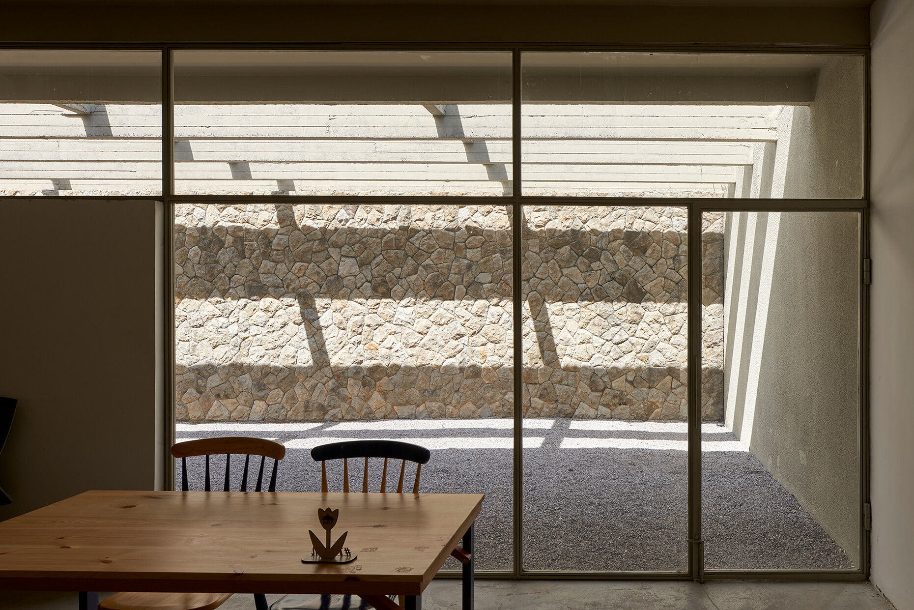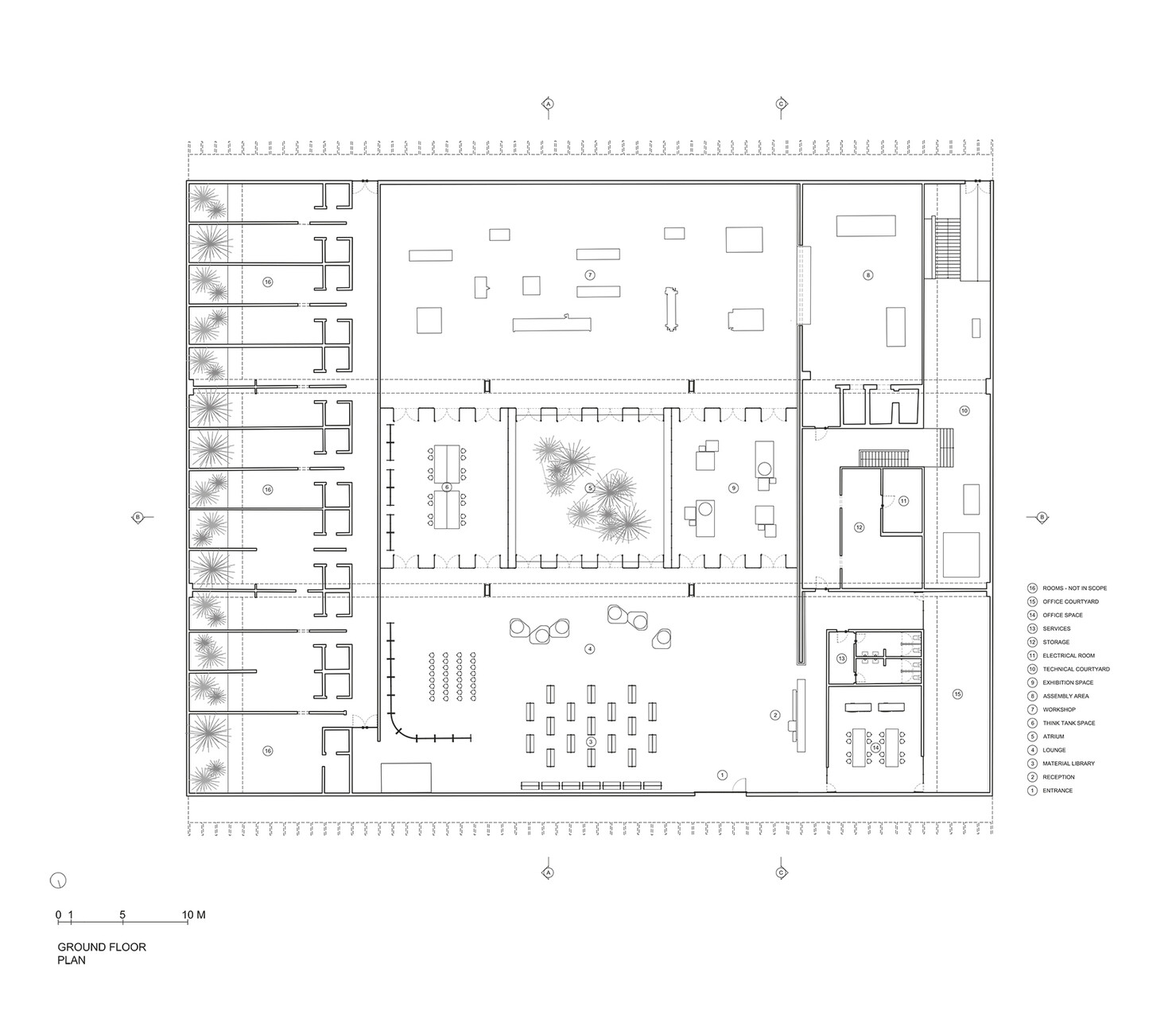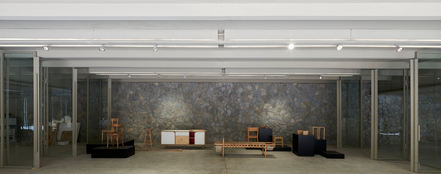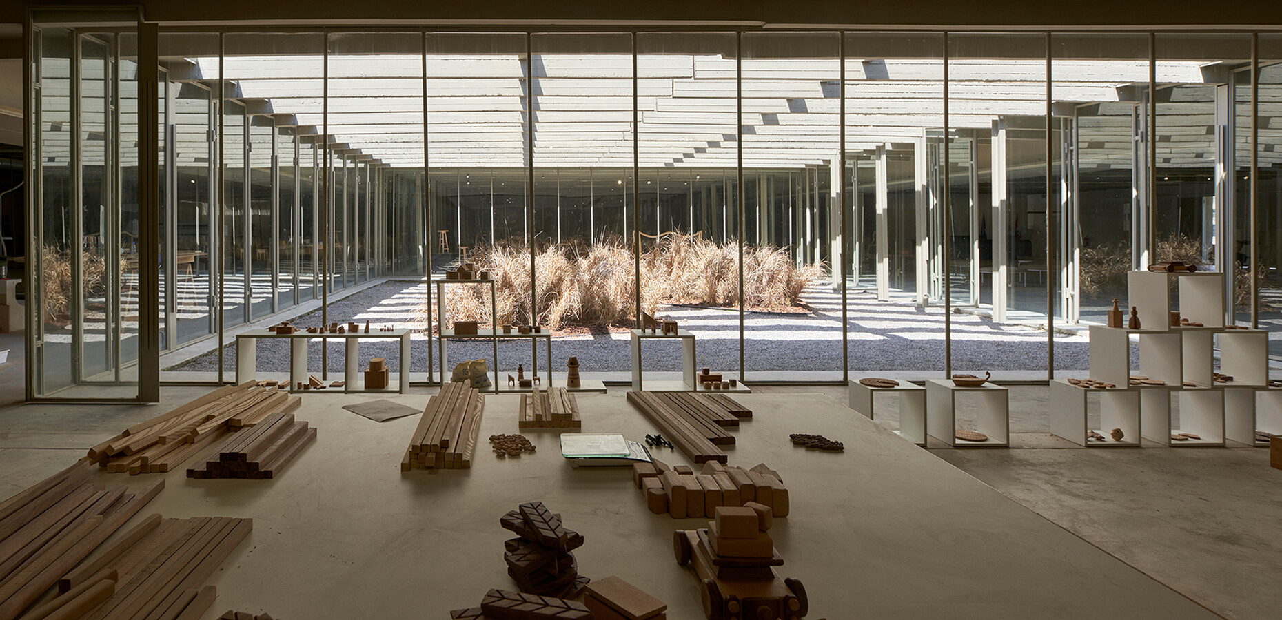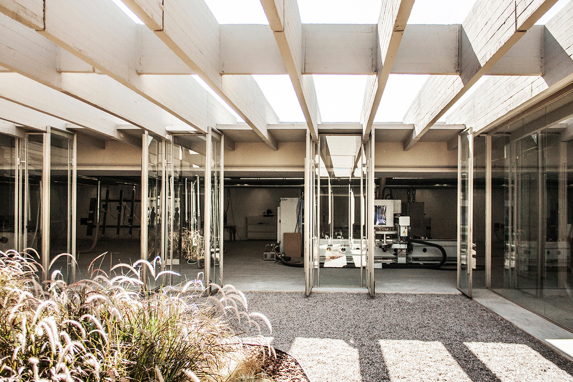 The approximately 2,500m2 former guest house has been divided into two main parts: The spaces formerly open to the public now house Minjara's carpentry workshops, showrooms and offices – this area was remodelled and renovated by East Architecture Studio within a tight deadline of just four months. In the rear section of the building, Niemeyer's plans called for 14 guest rooms with private bathrooms and courtyards, which are now in a semi-finished, unrenovated state due to cost constraints. The interior of the building has a central atrium with floor-to-ceiling windows on four sides, allowing natural light to stream into the surrounding rooms. The open space of the courtyard is planted with grasses and covered with a striking grid pattern made of reinforced concrete struts, which create an interesting interplay of light and shadow. The view from the courtyard extends into the large adjacent workshops, exhibition rooms and materials library, while the offices, wash rooms, storage and technical rooms are all located behind the workshops on one end of the building.
