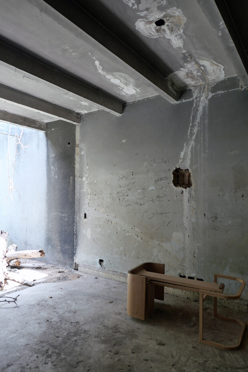 We turn off in front of the 700-metre-long exhibition hall known as the Boomerang and reach the guest house. The building, converted by East Architecture Studio, sits on a large lawn and is barely protected from the scorching sun. It appears to be hermetically sealed, as the facade is windowless. Gravel is used as a paving material in the outdoor areas – according to the young architects this was inspired by the colours, textures and materials used by landscape architect Roberto Burle Marx for the projects he worked on with Niemeyer. Minjara is written in large letters at the entrance; the sign indicating the project's new use. In the mid-19th century, Tripoli developed a thriving wood and furniture industry, although not much of it remains today. Supported by the European Union, Minjara, a platform founded in 2018, aims to help local artisans and furniture makers by providing both business contacts and well-equipped workshops. Minjara also exhibits its own furniture collections in this converted building.