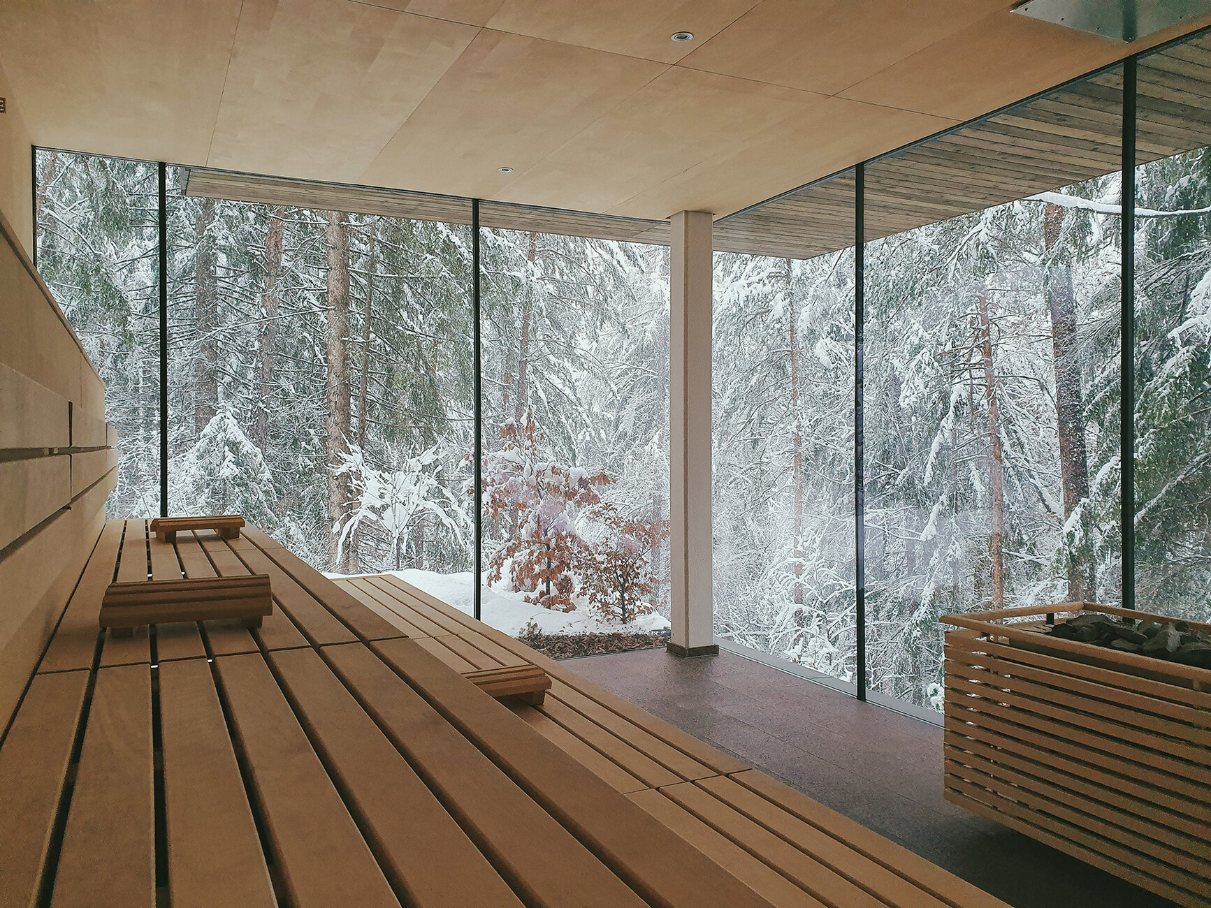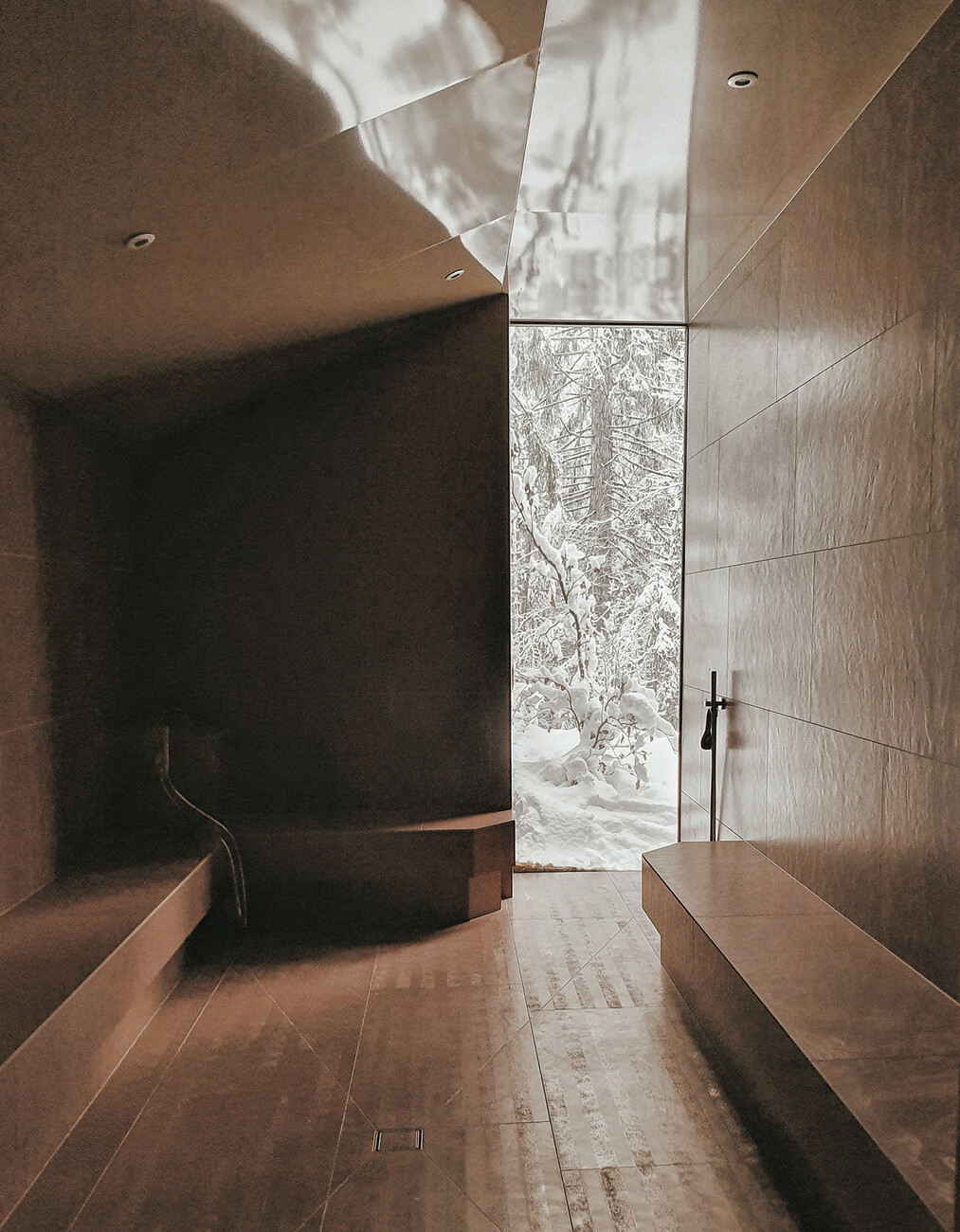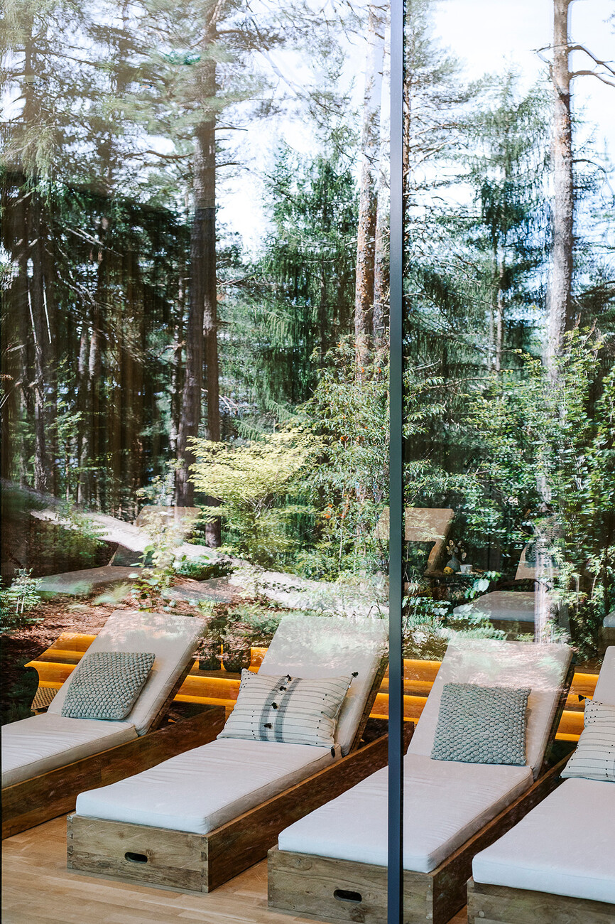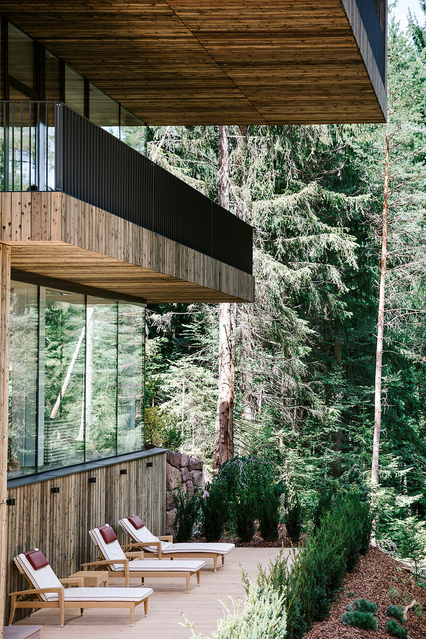The interior of the Hotel Saltus is characterised by peacefulness, focus and closeness to nature, in the spirit of warm minimalism. Natural beige and brown tones dominate, the few pieces of furniture and furnishings are well-placed – roughly the opposite of chalet chic. The lobby is furnished with Scandinavian and Italian design furniture and light-coloured curtains and carpets, while the bar is clad in walnut veneer. Some of the walls and the built-in wardrobes in the rooms are also designed in this style. Together with the light-coloured clay plaster walls and wooden furniture, this creates a pleasantly relaxed atmosphere, which guests can enjoy in the loggia or on the daybed by the large window, depending on the weather. The corridors are also special: they are immersed in deep black and illuminated at certain points. The hotel's facilities include an outdoor and indoor pool on the roof, as well as a spa with sauna on the lower level of the hotel, literally nestled in the forest. So whether you take the lift all the way up or down, the impressive landscape is always present.