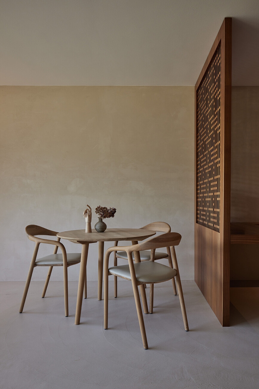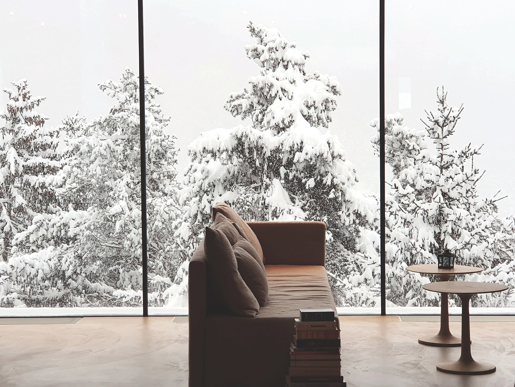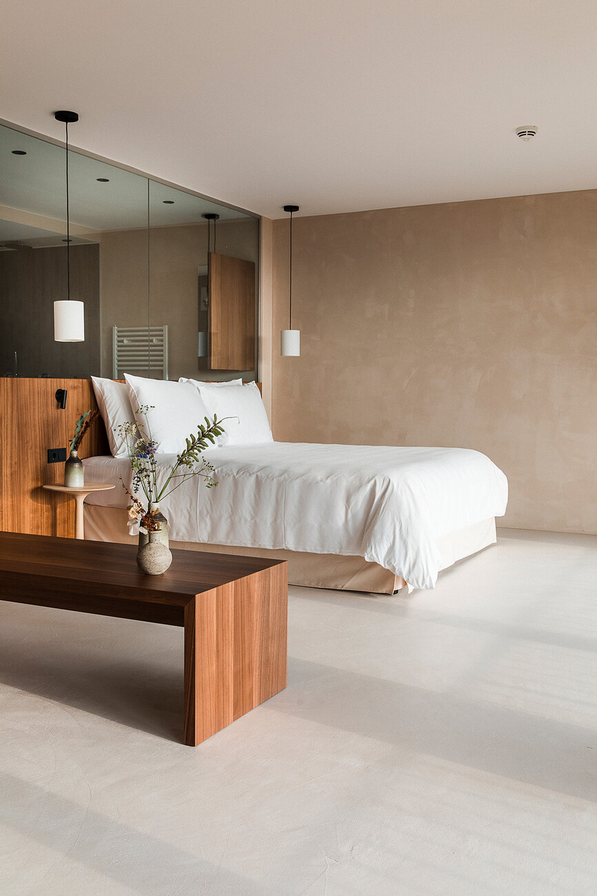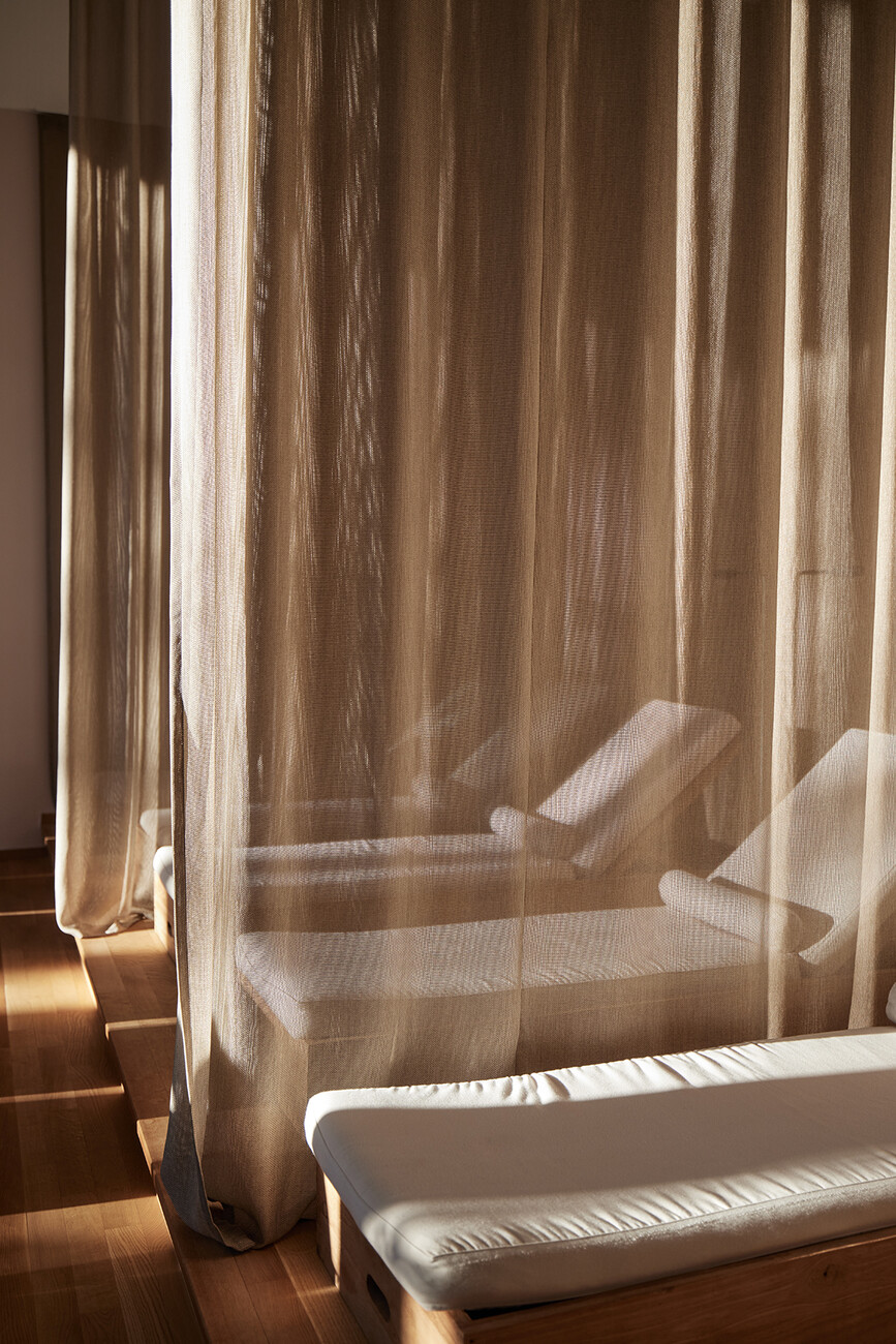 The interior of the Hotel Saltus is characterised by peacefulness, focus and closeness to nature, in the spirit of warm minimalism. Natural beige and brown tones dominate, the few pieces of furniture and furnishings are well-placed – roughly the opposite of chalet chic. The lobby is furnished with Scandinavian and Italian design furniture and light-coloured curtains and carpets, while the bar is clad in walnut veneer. Some of the walls and the built-in wardrobes in the rooms are also designed in this style. Together with the light-coloured clay plaster walls and wooden furniture, this creates a pleasantly relaxed atmosphere, which guests can enjoy in the loggia or on the daybed by the large window, depending on the weather. The corridors are also special: they are immersed in deep black and illuminated at certain points. The hotel's facilities include an outdoor and indoor pool on the roof, as well as a spa with sauna on the lower level of the hotel, literally nestled in the forest. So whether you take the lift all the way up or down, the impressive landscape is always present.