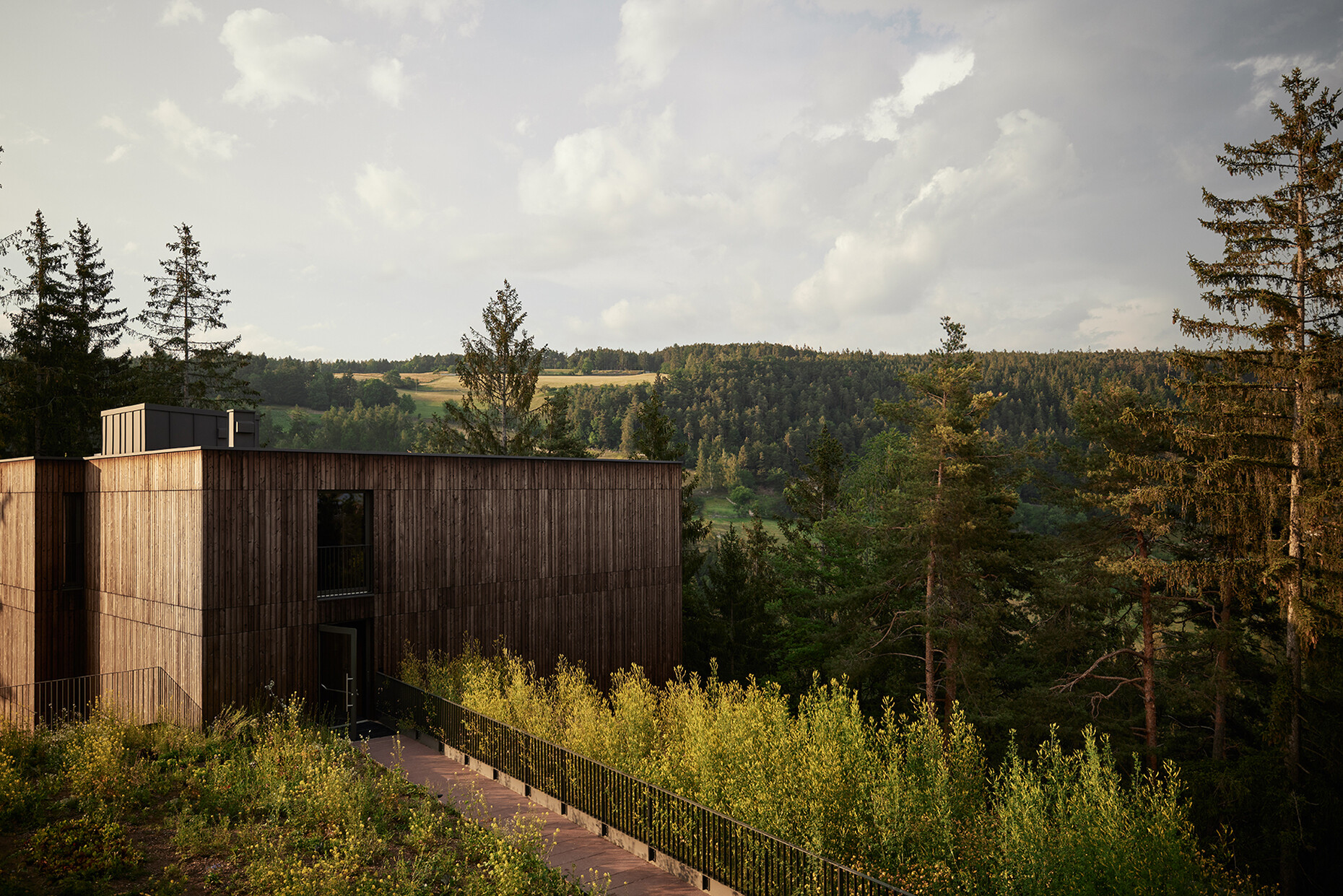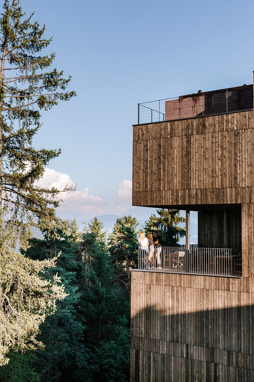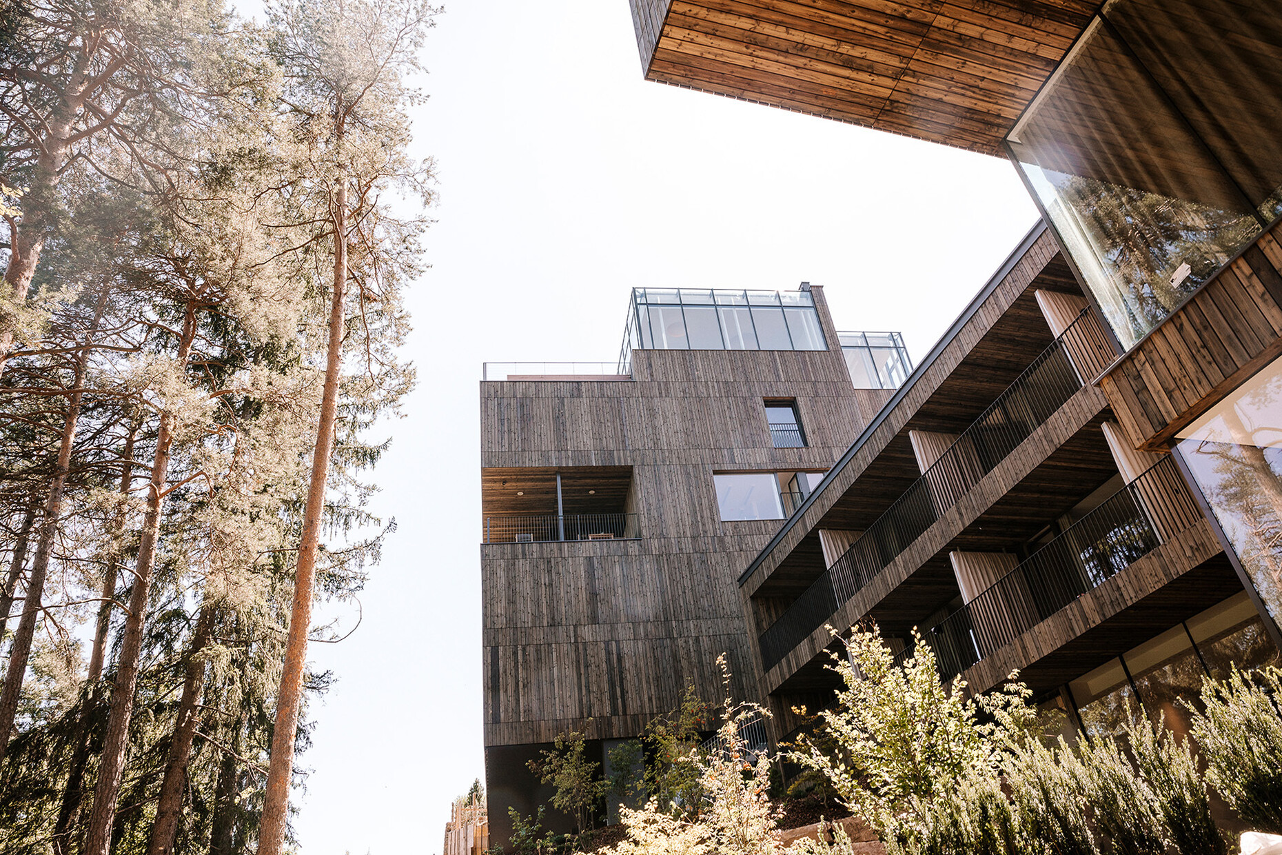 The location in the fragile alpine environment was an important consideration for the three owners from the Gamper-Murmelter family when they added an extension to the original hotel, the Tschögglbergerhof. They designed the Saltus as an "Eco Hotel". The new building with its three cubic sections is clad in local, pre-greyed larch wood and is designed to blend in well with the landscape. The natural porphyry stone from the excavation pit was later reused for floor tiles and as filling material. For the interior fit-out, the architect duo Tara opted for local and sustainable materials such as lime and clay for wall and floor coverings. Electricity and heat are generated from renewable energies. If you arrive by train instead of by car or plane, 5 per cent of the room rate is waived.