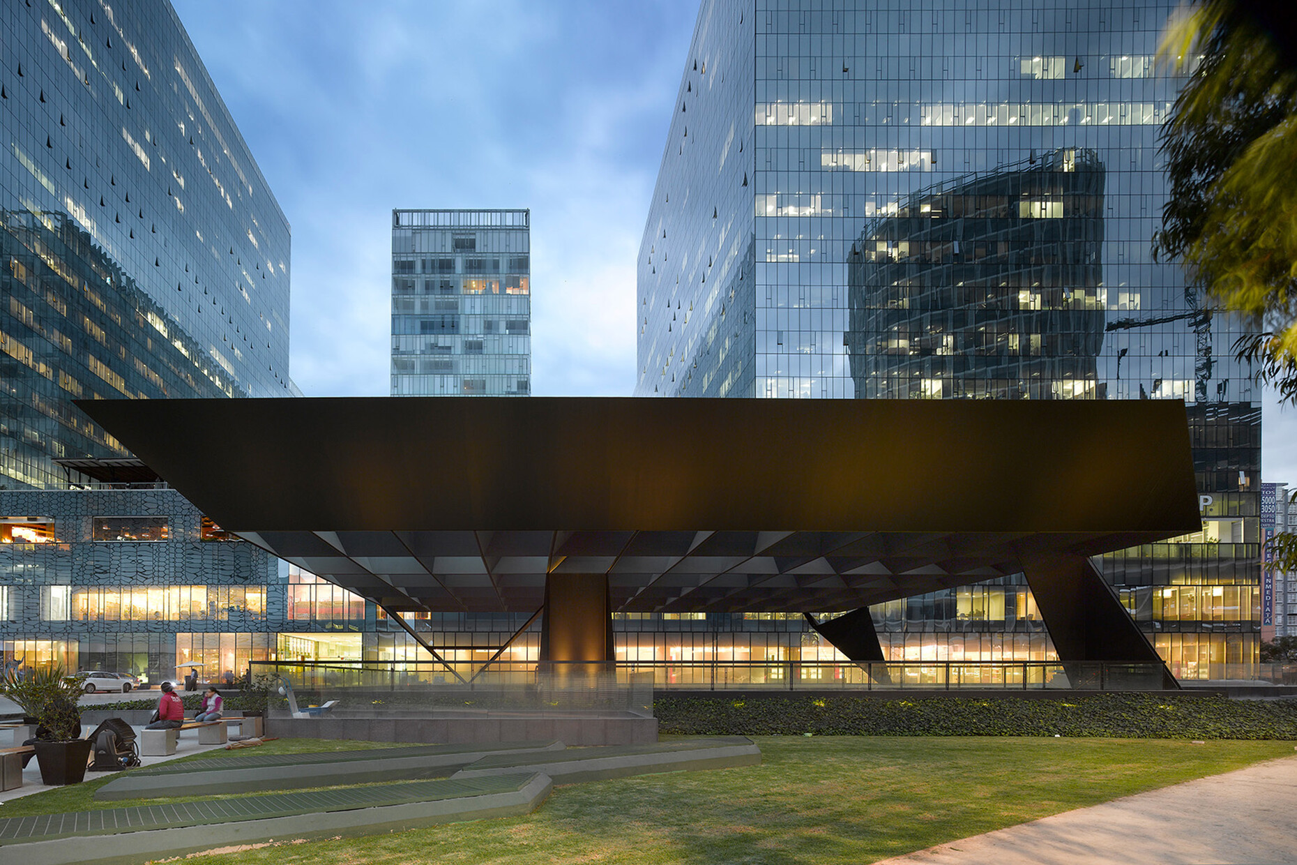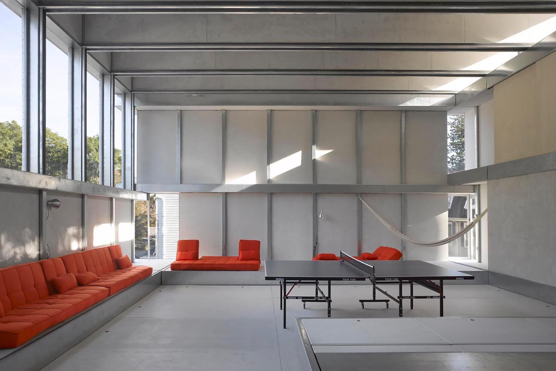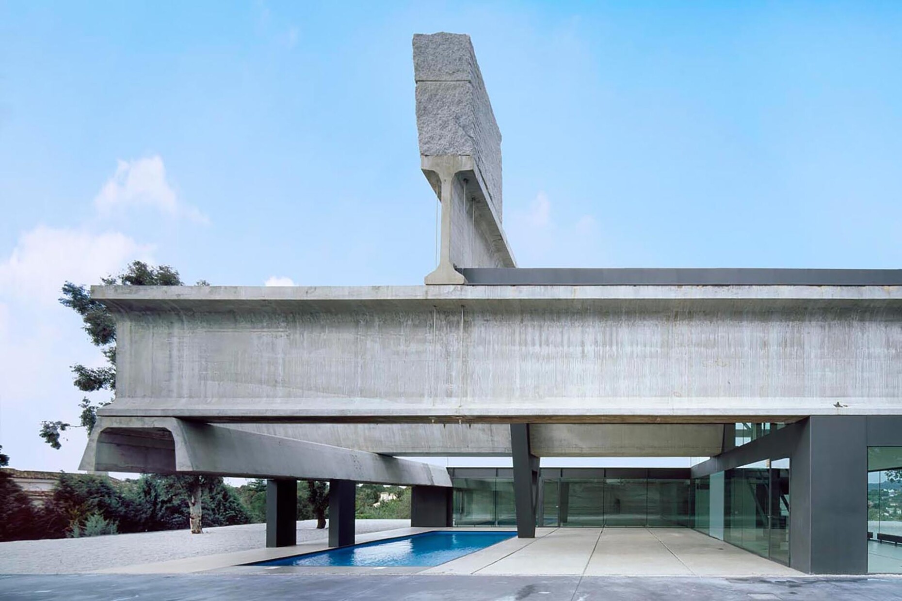 A start-up center in Seoul dating from 2017 looks as if a child has been playing with a Meccano construction set. You might think of De Stijl in light of the structure of imposing steel columns and beams that come together to form a casual three-dimensional volume. Without a doubt this is a modern prefabricated building that is technically perfect but also has the poetic touch of the random and decorative. Here and there the powerful profiles protrude for no apparent reason, all seem somewhat outsized, and are more artistic expression than rational construction elements. The architects took this idea to the extreme in the Villa Hemeroscopium in Madrid that caused such a sensation in 2008: Huge floor-to-ceiling concrete girders shaped like double-T steel girders are stacked to create a fragile equilibrium that you hardly feel you can trust. The remainder is open or glazed and there are no walls. One girder above the ground floor is designed as a tub and filled with water. At the highest point, the G-point as the architects ironically call it, a twenty-ton granite block bears down as if the whole point of the structure were about raising it up high. "Heavy structures and major actions are arranged in such a way that gravity sets the space in motion. This serves to define the place," they explain – the place where the sun sets and that the Greeks call hemeroscopium. Inside the space flows freely and unimpeded, you can gaze as far as the horizon and see the sun sinking. It goes without saying that this house was also prefabricated and installed on site within a week.