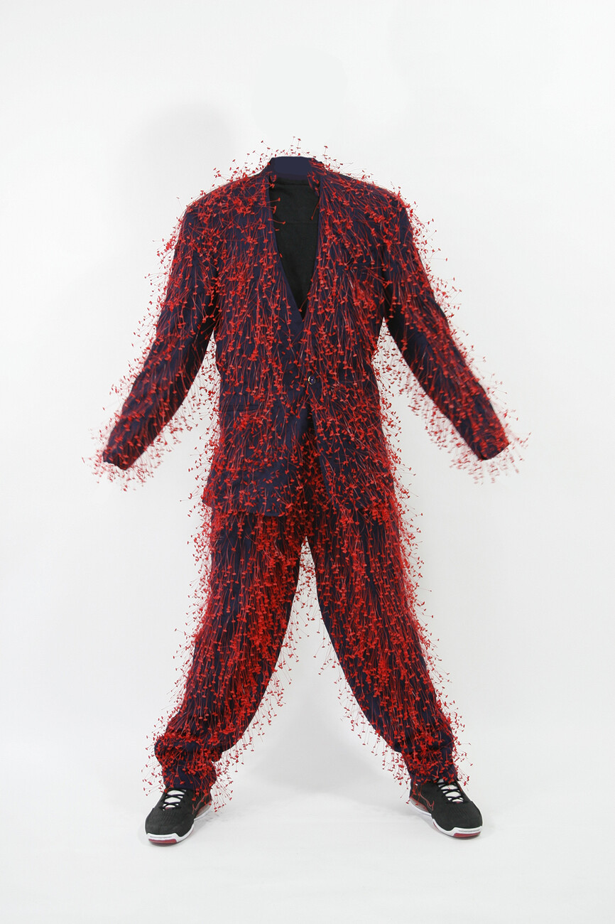 Wolfgang Horn: The geometric patterns of Barbara's fabrics are already very well suited to architecture because of their aesthetics alone, as she deals a lot with the division and construction of surfaces and colour combinations. After a while, I also started to explore textiles in my work, even in the light installations. Since we work together, we can complement and inspire each other well. For example, she translates a computer animation of mine into an image on the loom, while I transfer the colours of her fabrics into my animation. For the ‘Tag-Pins’ suit from 2008, we used label holders from the textile industry and shot them thousands of times in the suit fabric and also translated them into a digital graphic. After 30 years, we naturally also have our own stock. We can use this repertoire in parallel to transfer ideas to another medium.