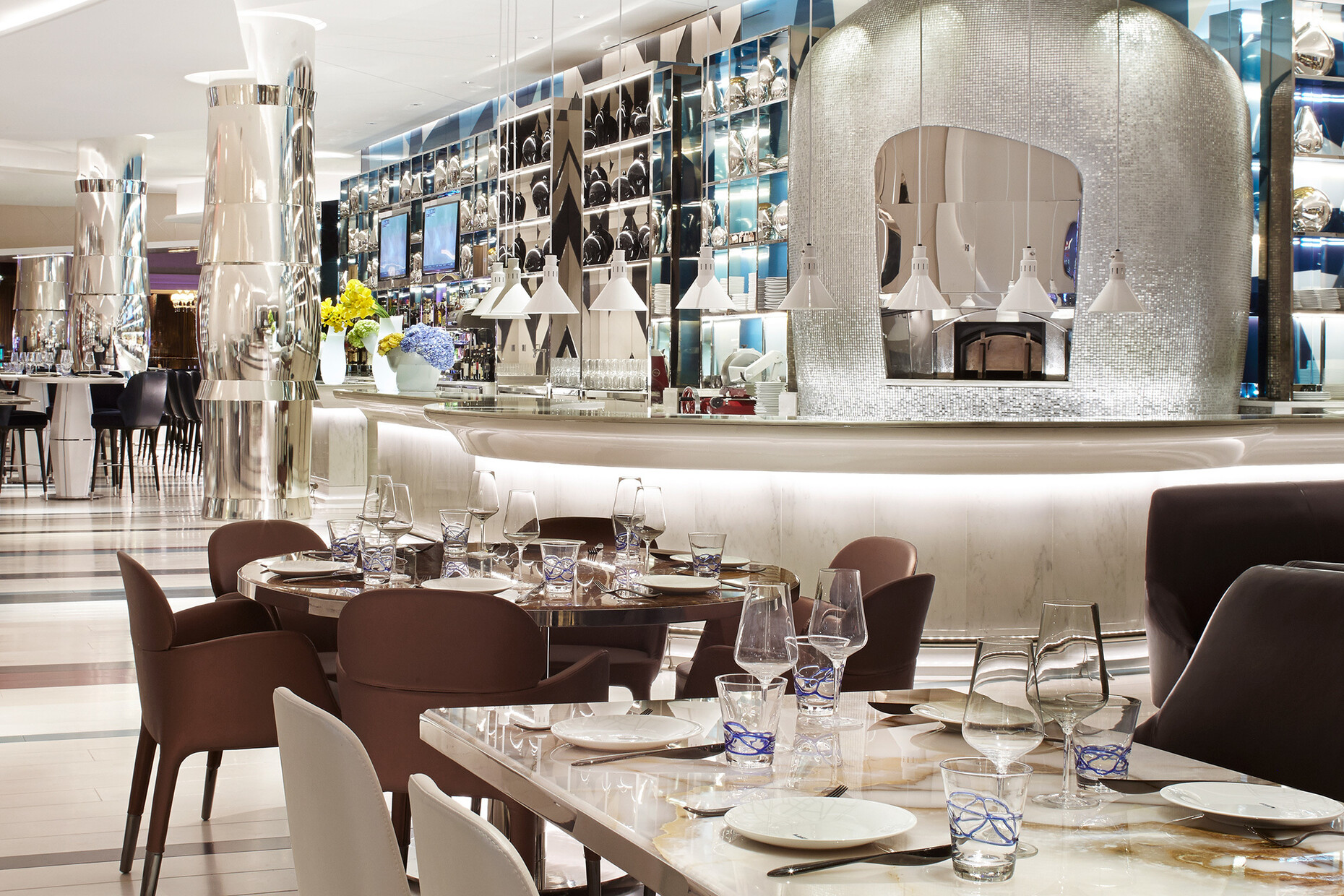 Anyone who enters the “Lago” restaurant in Bellagio Resort & Casinò, Las Vegas needs a moment before they feel inclined to consider the menu: Guests encounter a collage of numerous mirrors, marble and white surfaces contrasted with elements in light red and blue. Add to that the switch between angular and organic shapes that extends across the walls. Recessed ceiling panels overlap, accentuated by indirect lighting, while the line of vision within the space is exaggerated by strips on the floor.