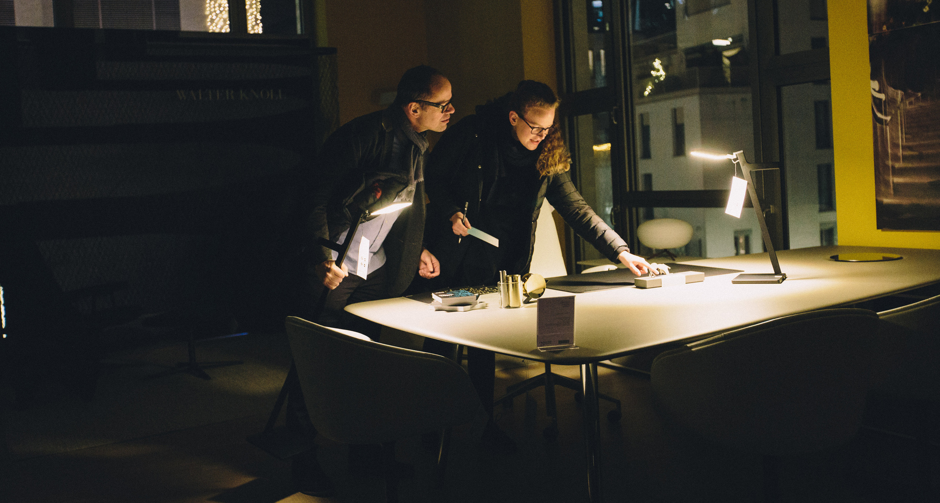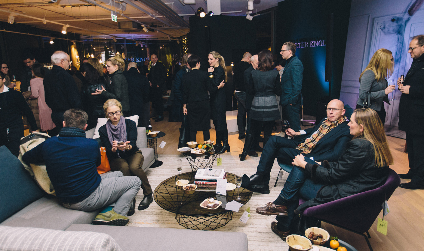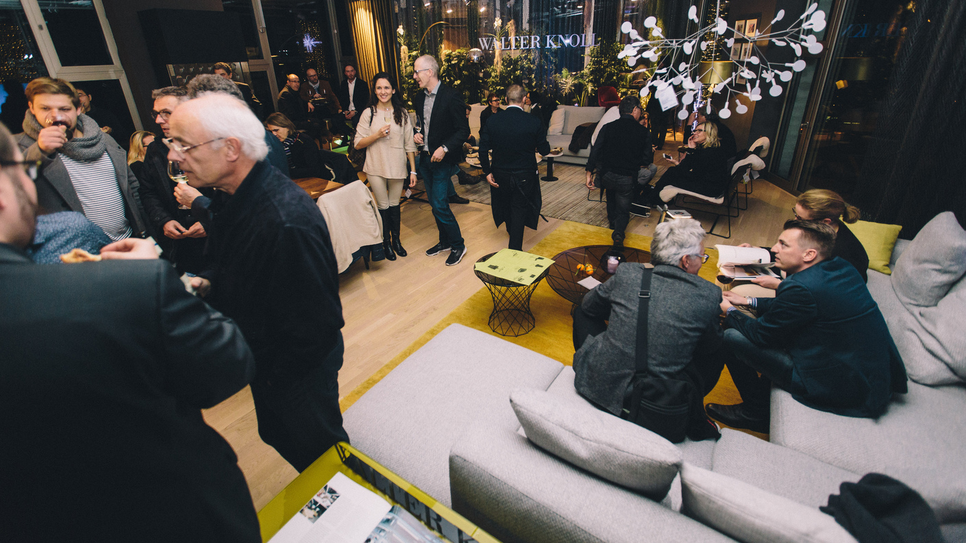 If you have managed after all the fun of discovery things managed to reach the very top, namely the fourth floor, then it is to find a drink and delicacies by Vincenzo Paradiso awaiting you. You can then lounge on a Walter Knoll sofa or armchair – and enjoy the evening in scintillating conversations about furniture, architecture, the trade fair, and much more besides. And anyone wanting a breath of fresh wintery air – outside on the roof terrace there’s a fireplace, mold wine, and Christmassy lights all round.