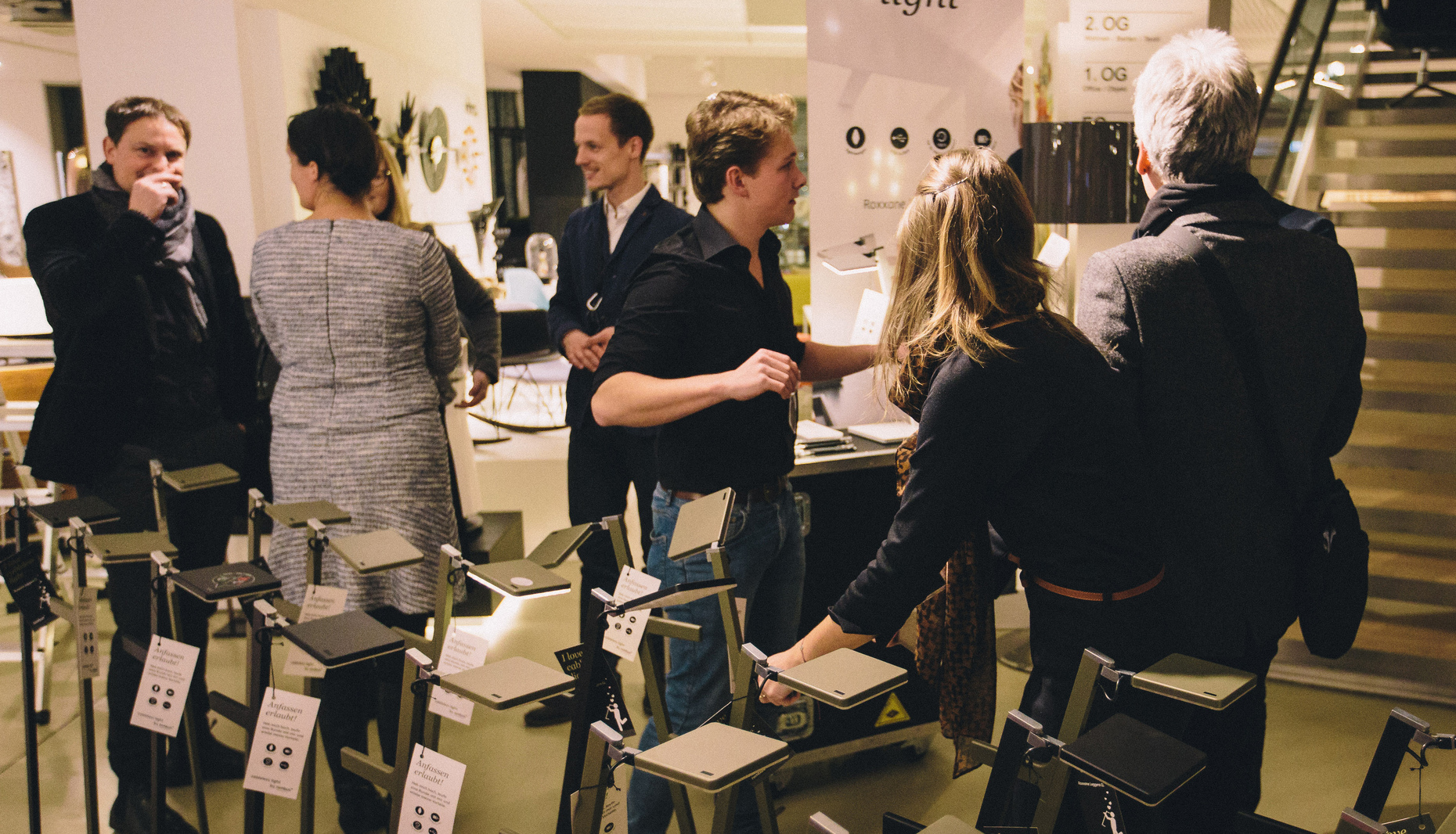 To make certain the countless visitors, and there are many architects and interior designers among them, don’t get lost, the stairwells are illuminated by the compact and colorful “Roxxane Fly”, which glue to the glass fillings in the stairs as if they had always been part of things. And in the expansive rooms, specimens of the equally cordless “Roxxane Leggera 52 CL” table-top luminaire complement the joyous lighting spectacle. It’s a bit as if you were moving through a dark forest in which there are any number of secrets to be discovered. Robert Volhard, founder and Managing Director of Stylepark, commented on this in his short address, saying that when he wandered around the rooms cloaked in mysterious darkness and filled with luxurious things he felt a bit like a child in wonderland.