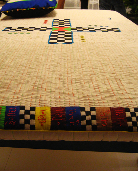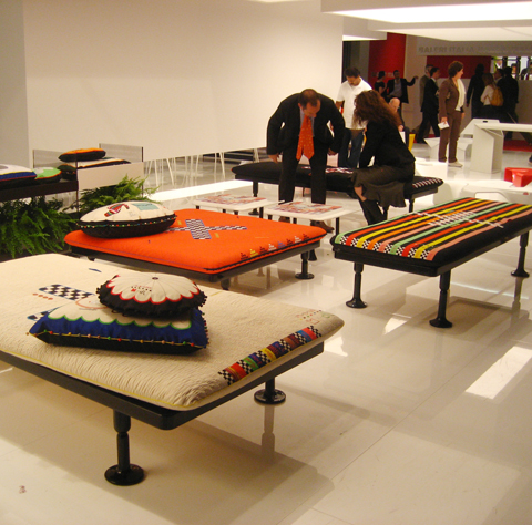What made my heart beat even faster, was the playful and irresistible installation at Moroso by the Indian-British design duo Doshi & Levien. Colourful fabrics, covering low generous day beds (or whatever they were). The patterns derive from a traditional Indian game. Every detail carefully executed. There were even small embroidered pockets where you could put the money you might win. The cushions were filled with images of the tools used in the process. All done with wit, skill and excellent handicraft that is rare to find. As an added value, all the Indian seamstresses' individual names were embroidered onto the fabric, together with the date and the signs of Moroso and Doshi & Levien. Built into the narration is of course the long historic relation between India and Britain. Indian tradition combined with British humour in a contemporary expression. It is a story that has it all, the surface combined with a real content, something lasting and convincing.