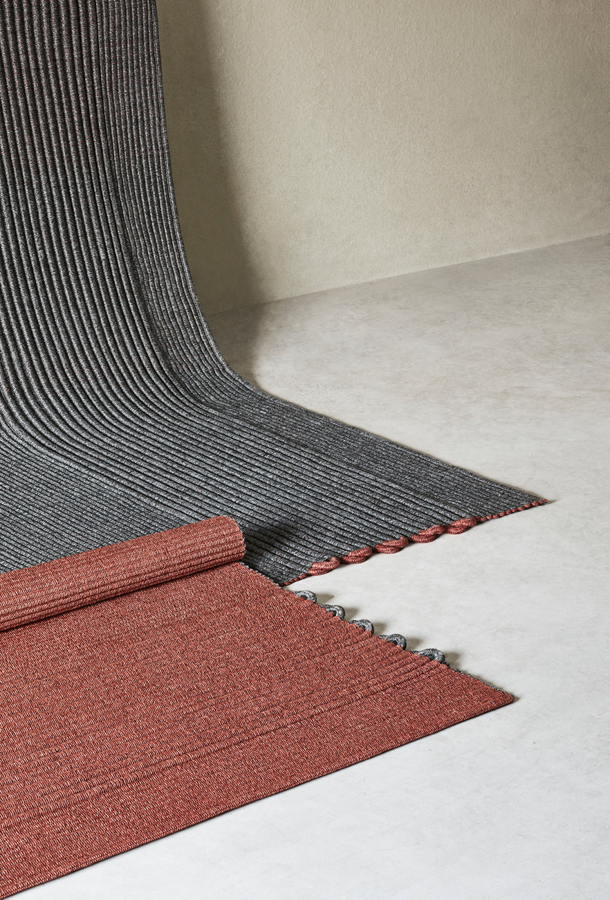 Alberto Sánchez and Eduardo Villalón from MUT Design have woven ropes of polypropylene in different sizes for the outdoor rug collection "Link", resulting in rugs with a wavy surface. The thinner, three millimetre thick ropes are partially supplemented by a wider, 16 millimetre long rope, creating a streamlined, raised pattern. At the edges, the ropes peek out of the rug in superimposed loops as an accent. The colours of the collection range from sage green to denim blue and brick red. Designed as a reversible rug, both sides are in one colour each, with the tones of the overhanging loops giving a hint of the respective back. (am)