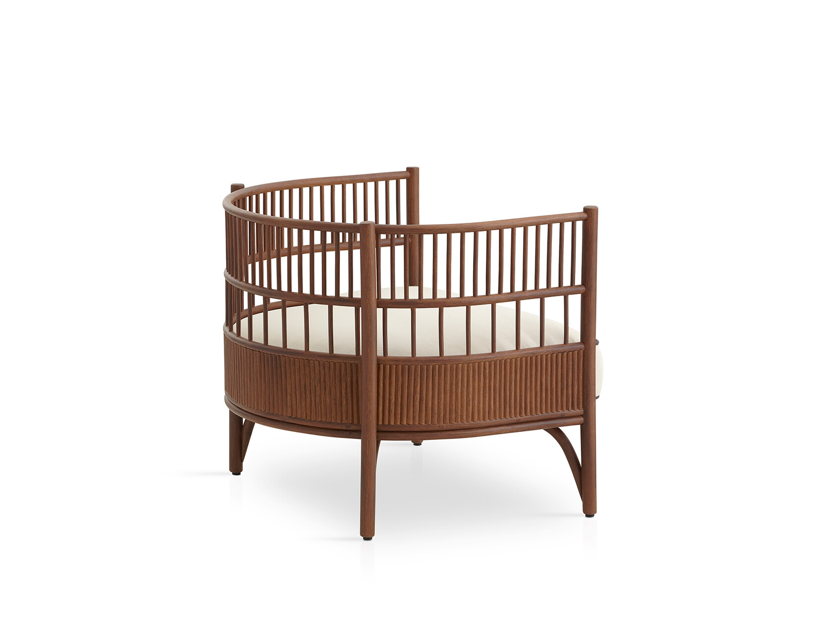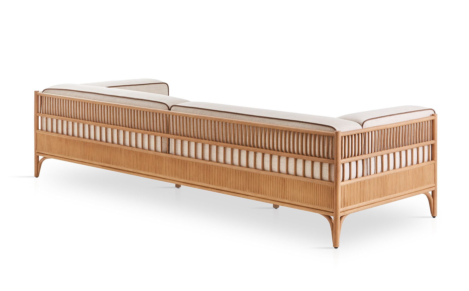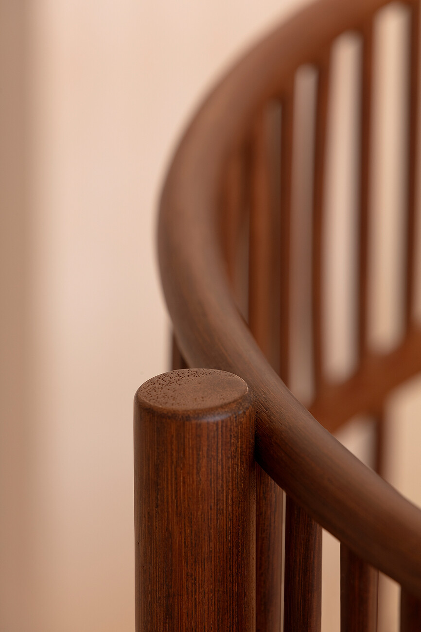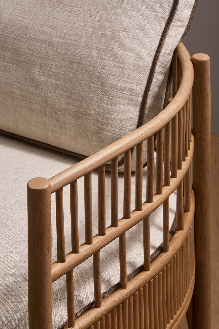 Rattan is firmly woven into the DNA of Expormim and its modern designs that feature the robust natural material. Quincoces used the latter to design the “Cadenza” collection comprising a loveseat, a three-seater sofa, an XL-sofa, and two armchairs, a collection that although only designed very recently already looks so familiar as if it had always been around. Vertically placed struts at different distances surrounding the seat cushion create a protective semicircle around the seated person. The straight lines and dynamic structure with different proportions provide a new look at this traditional craft through a contemporary lens. They also demonstrate Expormim’s great expertise in processing the lianas of the rotang palm into elegant furniture designs. At the base, the straight lines are complemented by gentle curves making for a pleasant contrast. From every angle the design of “Cadenza” reveals a new, striking silhouette. “The rattan is the main focus of the project; everything revolves around its flexibility and lightness. The idea was to create a sequence of rhythmic variations by applying different techniques to the material,” explains David López Quincoces.