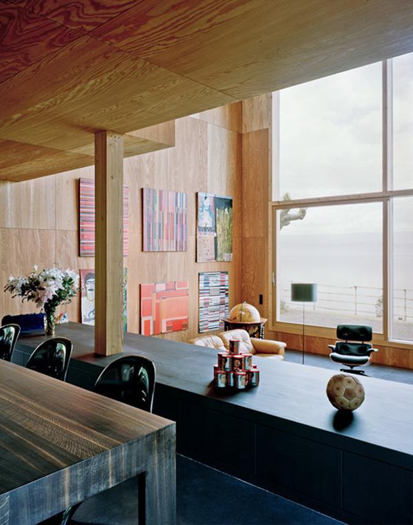 Stately villas and countless boathouses line the southern bank of Lake Geneva, where the small French town of Thonon-les-Bains attracts holiday makers and spa guests to this border region between France and Switzerland. Tracing the line the lakeside promenade with your eye, you suddenly find yourself caught on a quadratic, rust-red building, contrasting distinctly with the whitewashed villas that frame it. The concept created by Zurich architects Kaufmann Widrig for the two-story detached house is nurtured by opposites, oscillating between assimilation and distinction. On the one hand the building is intended to fit in with the surrounding environment as well as possible, which owing to the nature of the plot faced the architects with quite a challenge from the very outset. That is, the area that is comparable with a park actually belongs to the neighboring villa and was previously used as a fruit orchard. The elongated, parcel-like shape of the plot that leads down to the narrow north side of Lake Geneva’s banks restricted the scope for the building’s design, which ultimately led to use of the simple, quadratic geometric shapes we see today. In terms of structural engineering and materials, the architects once again oriented their concepts on that which preceded the building. The rusty-brown patina of the steel façade was inspired by the weather-beaten, crude cladding seen on the numerous boathouses in the area. What can be understood as a concession to the more down-to-earth side of this rather grand neighborhood, simultaneously demarcates the building from the pomp of the surrounding villas. The house’s interior also distinguishes itself in its contrasts. The larch-wood paneled walls create a comfortable, secure atmosphere in the living space, giving it a warm flair and in doing so make it almost reminiscent of a ski chalet in the Alps. This is contrasted with the anthracite-colored concrete floor, which exudes cool, contemporary elegance and in turn ensures that the comfy hut-like charm doesn’t get too out of hand. Large windows with a view of the lake not only flood the interior with daylight at all times of the day, they also lend the cuboid room a gallery-like appearance. The house’s owner, a Swiss businessman, took the interior design into his own hands. He has filled the space with a tasteful mix of stunning furniture classics and austere, contemporary designs, such that the concept of contrast is continued from the exterior through into the interior.