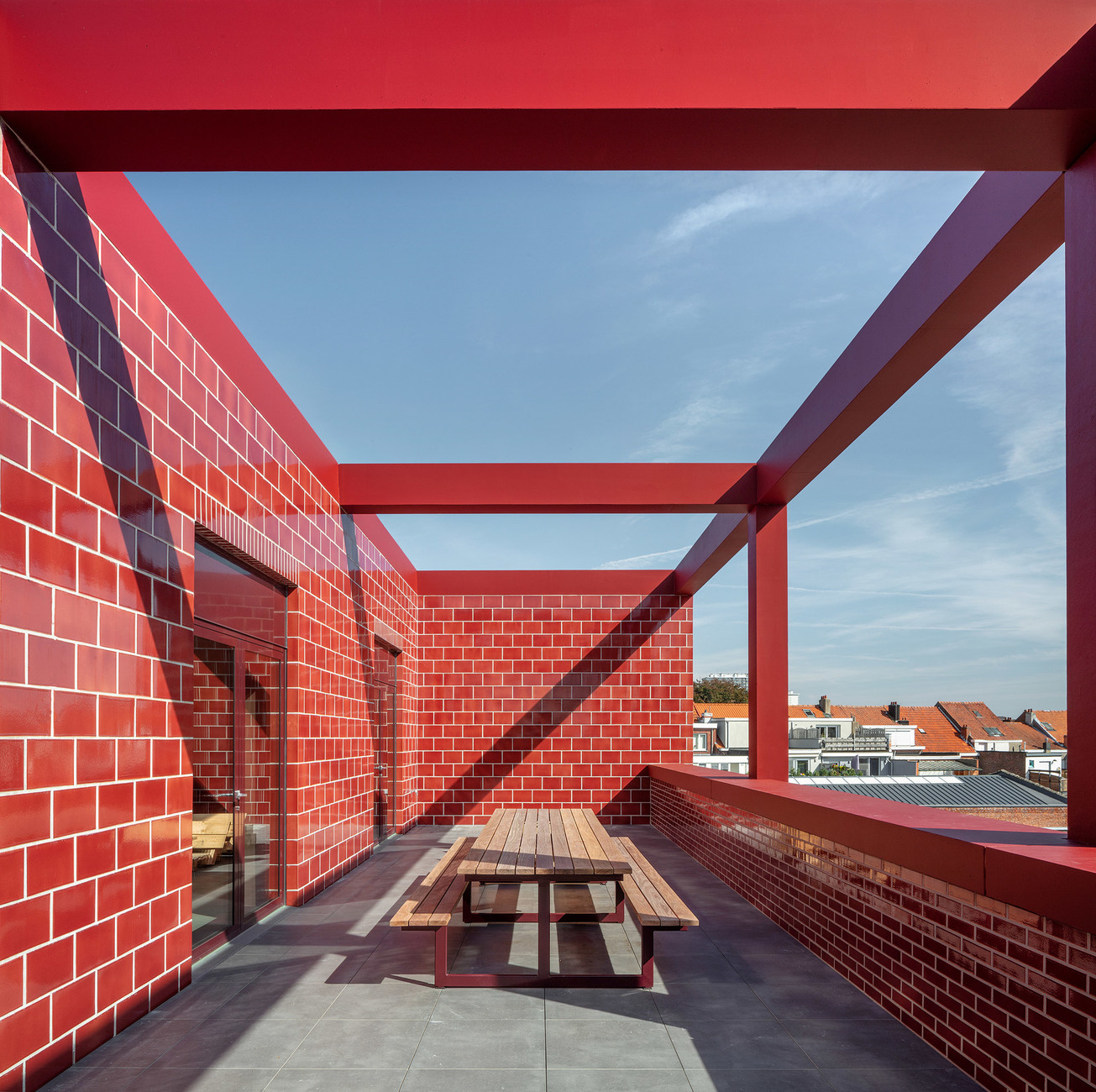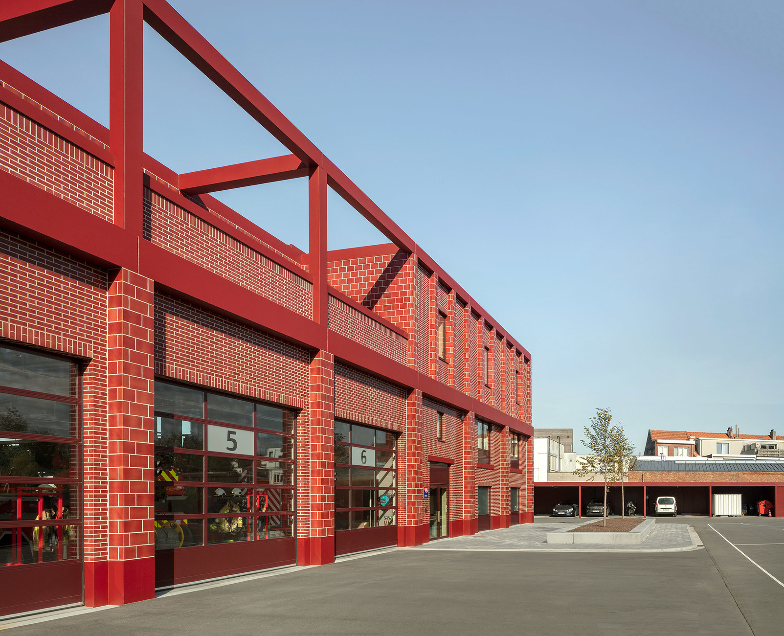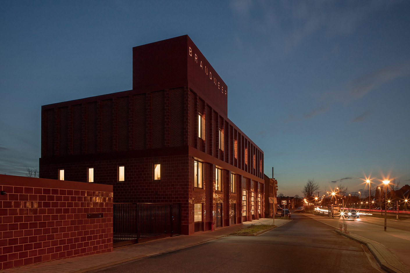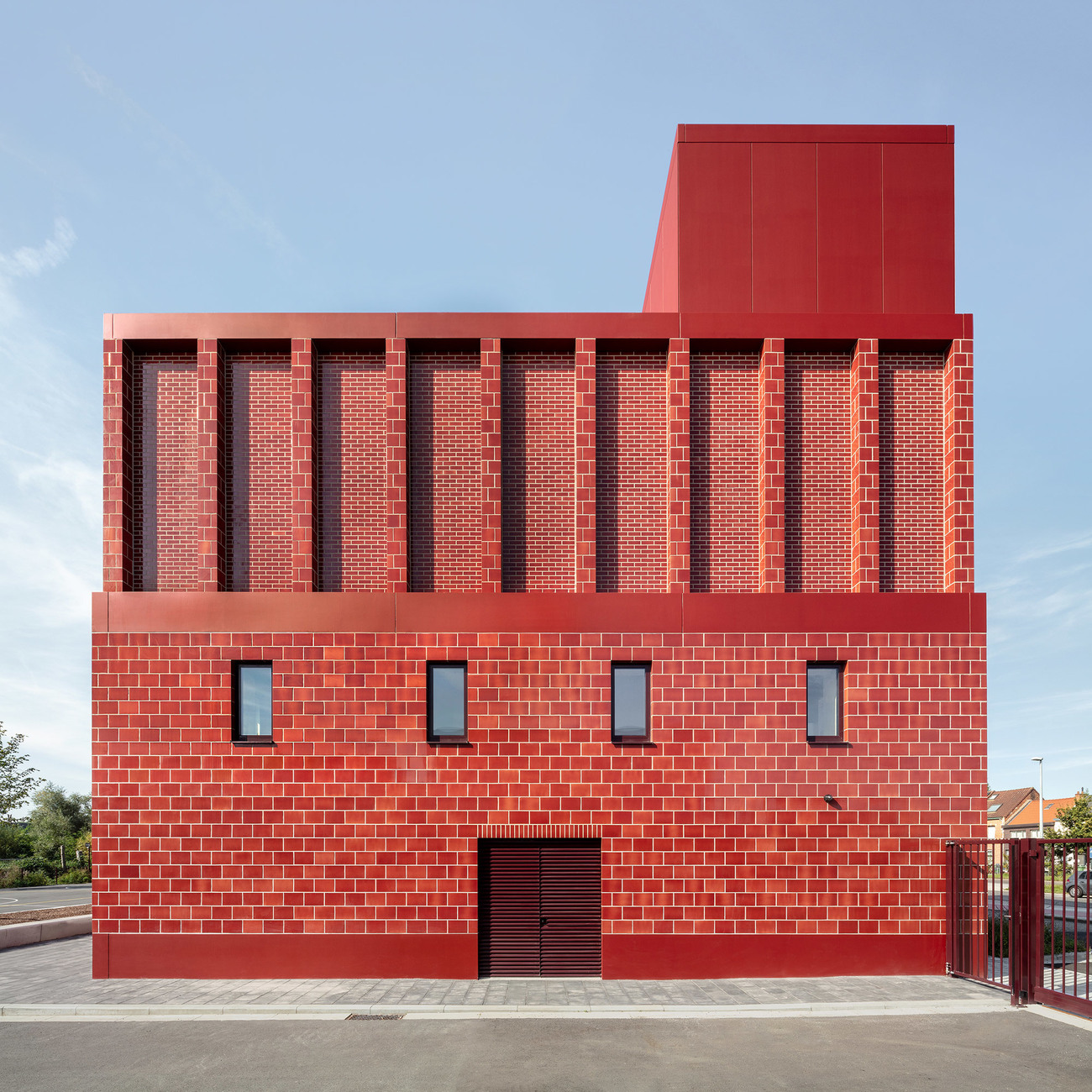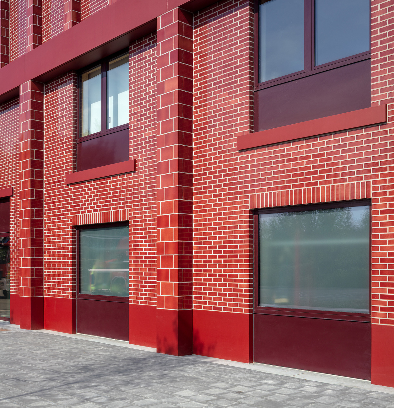 The façade of the new fire station in Antwerp’s Wilrijk district changes as the clouds drift by. The architects have achieved this effect by means of the station’s bricks, which with their cherry-red glaze reflect the natural light in different weather conditions – sometimes the stones glow in the sun and sometimes they glare gloomily. Because the area around the Gaston Fabrélaan transport hub is not particularly elegant the three architects wanted to make a strong statement. On this typically Belgian main street, one brick building lines up next to one the other – with the new neighbor fitting self-confidently into its surroundings. “A fire station is a very functional building but, at the same time, the emotional and social aspects should not be neglected,” comments project architect Floris Cornelisse. Normally, HCVA prefers to design quiet, modest, reserved buildings. Here, the situation was different.