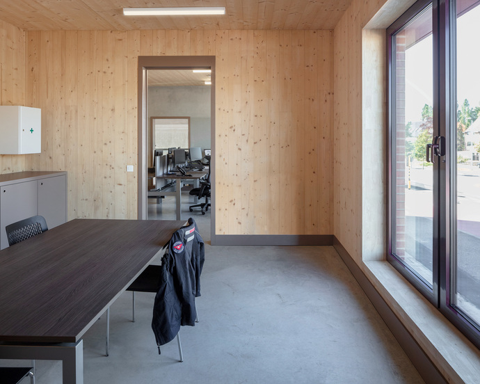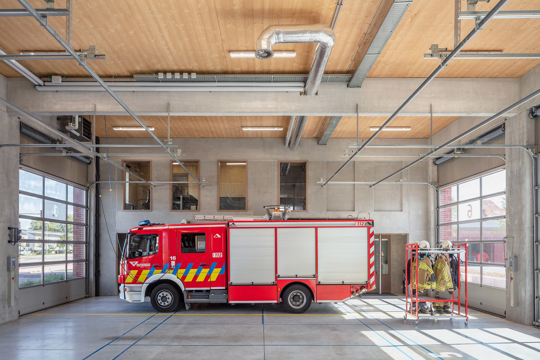 Antwerp is not far away for this Rotterdam-based firm, and four and a half years ago it succeeded in winning the invited competition the city held. A compact set of criteria for a small site. Antwerp wants to offer young firms an opportunity, as Cornelisse sees it. With this monochrome standalone, HCVA’s design combines two typologies in a hybrid structure. A kind of residential building made of a light CLP wooden frame is stuck on top of the (concrete) garage. This upper level accommodates not only the office, the kitchen and the common areas but also bedrooms with some 15 beds. “Each of the 56 employees has his or her own mattress, the staff work in shifts, each with eight firefighters,” explains the architect. A total of 932 m² of usable area needed to be factored in on the 1,400-m² parcel of land.