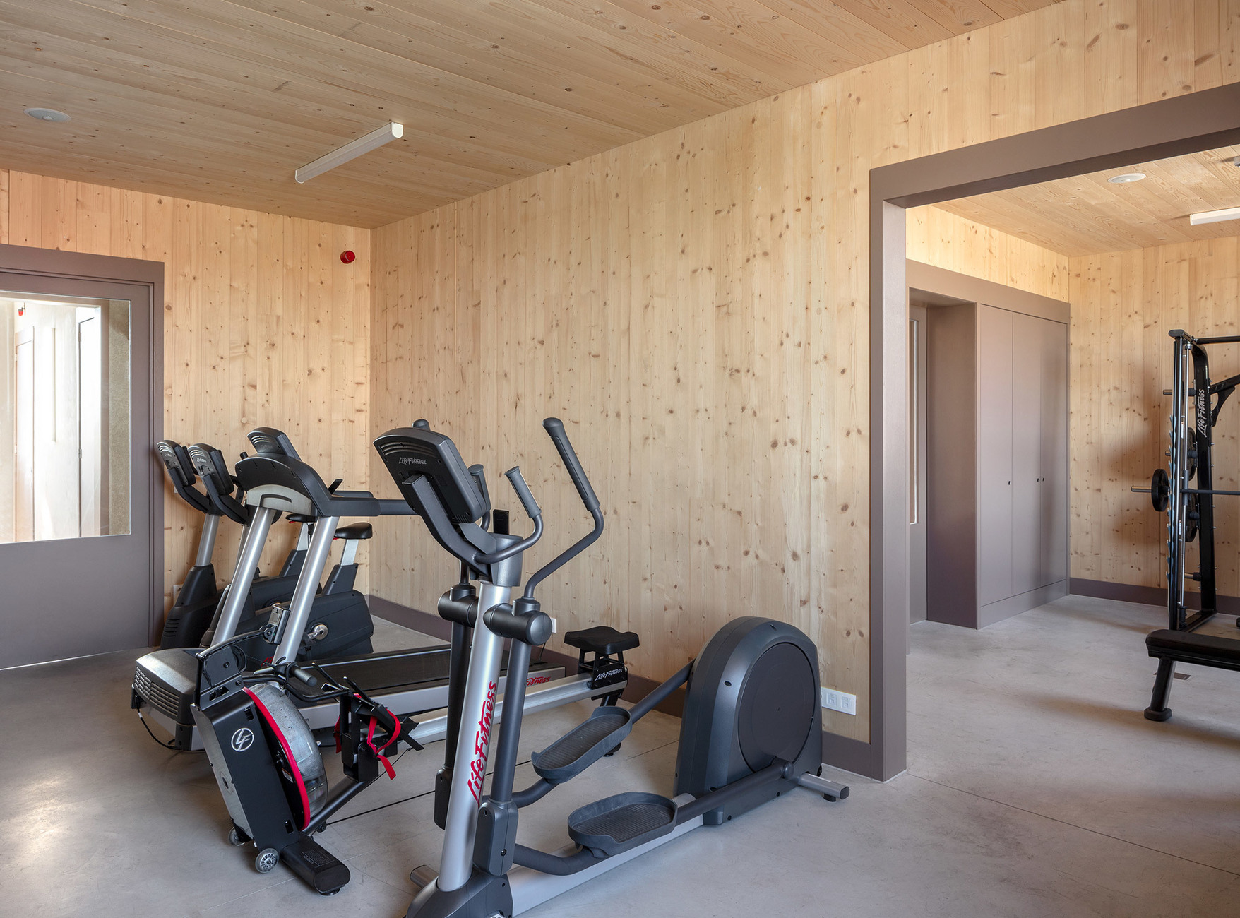 Inside the building the architects have created a conscious contrast to the cherry-red façade. With their strict distinction between the inside and outside Happel Cornelisse and Verhoeven are referencing Gottfried Semper’s theory of “dressing”. It is only the red lockers that once again touch upon the subject of the building’s expressive envelope; otherwise, the aim behind the light wooden surfaces is to create a homelike atmosphere.