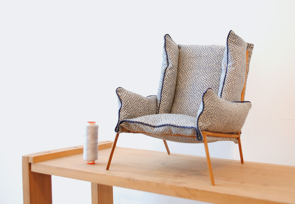 Sempé: There are only two elements, the metal frame and the upholstery. The frame is like a large pincer that holds a large one-piece blanket between its tongs. The pincer divides and folds the blanket into different parts that then form the armrests, the seat, the backrest and the wings. I wanted the structure not to be decorative from the feet to the headrest, but to be useful and remain visible. That way, the finished item still has something of a sketch about it.