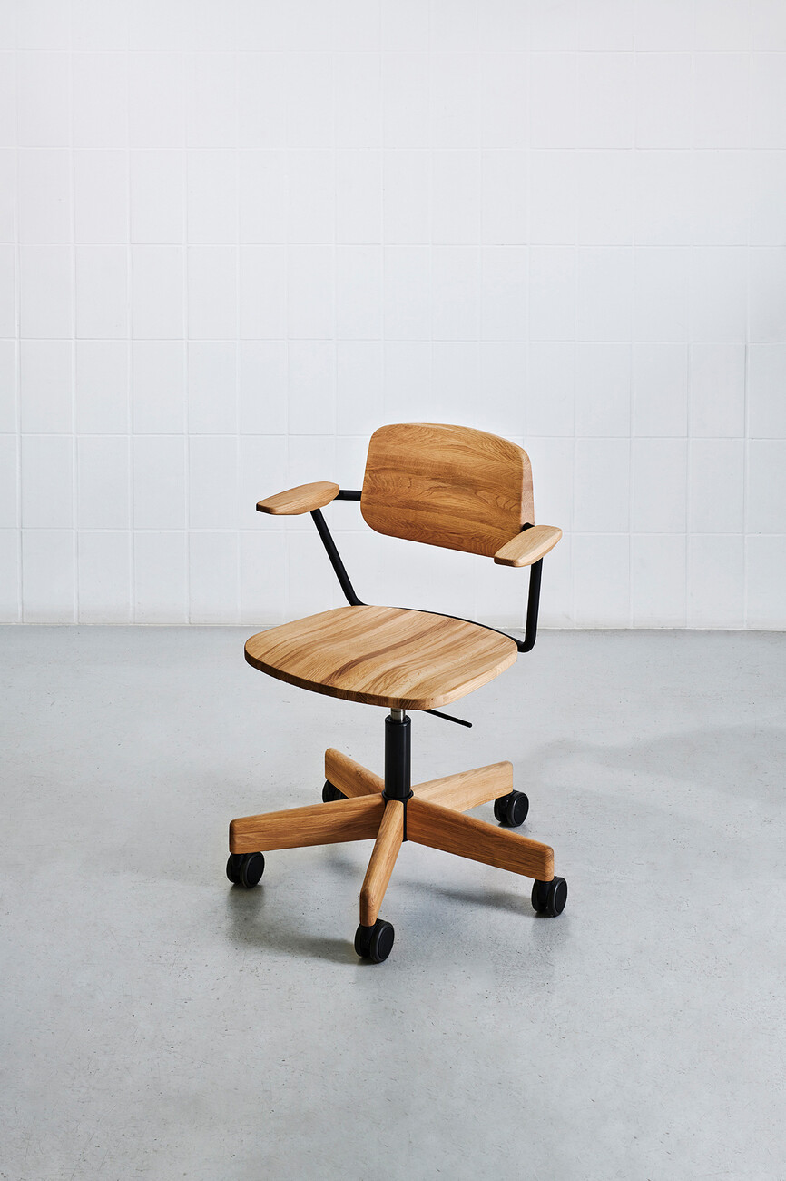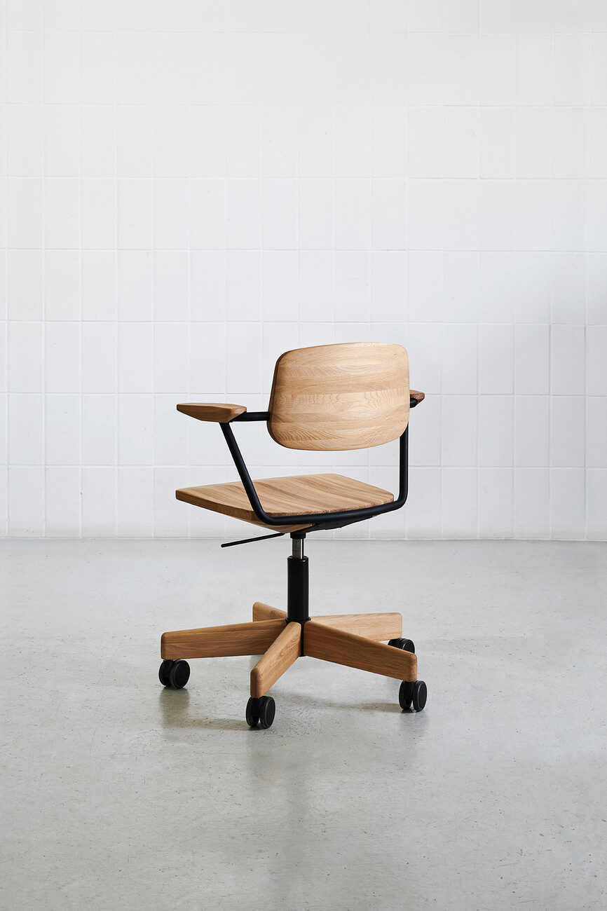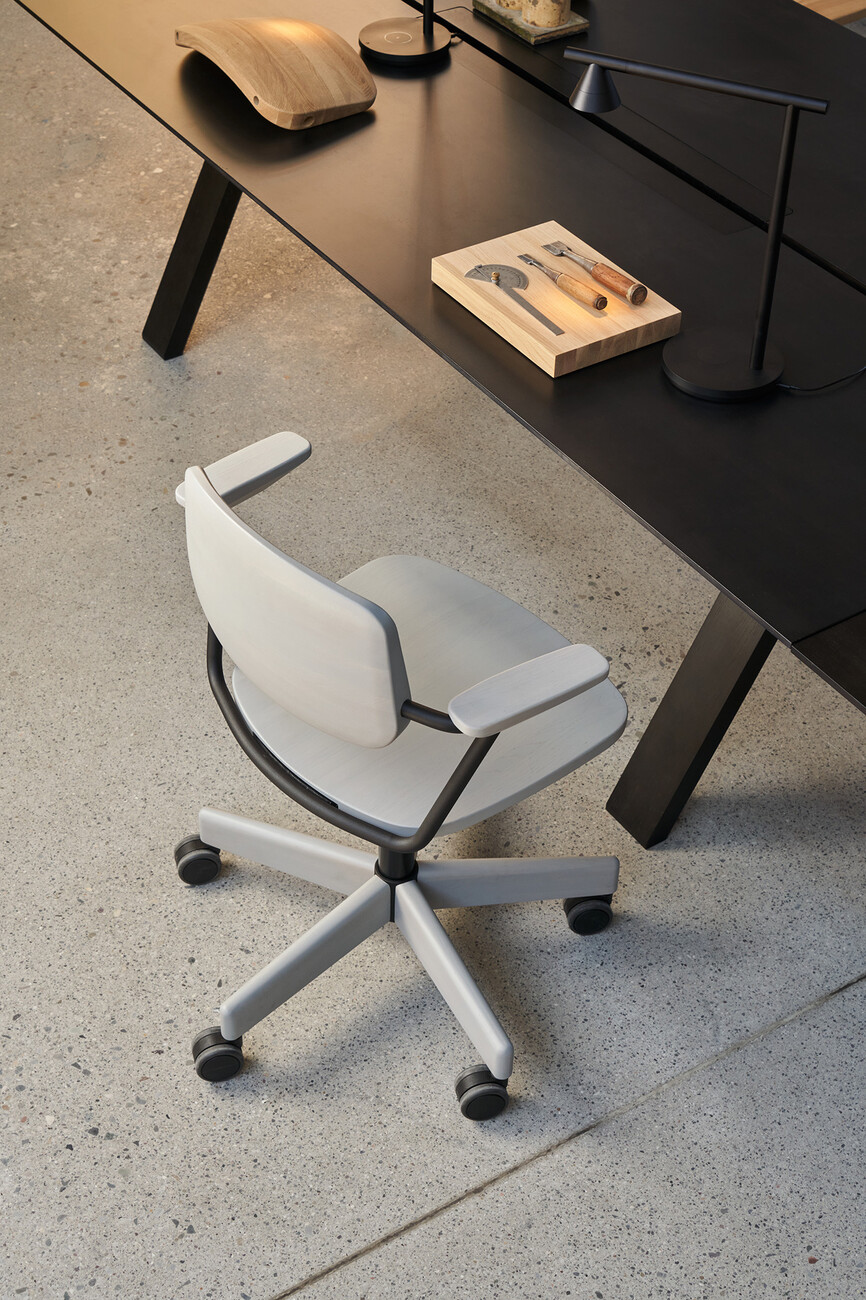 With the "Giroflex 150 Limited Edition", Flokk's Giroflex brand returns to its roots and presents a wooden office chair limited to 150 pieces. Developed in collaboration with Swiss design studio BIG-GAME and Japanese woodworking specialist Karimoku New Standard, the furniture is a reinterpretation of a classic design: to do this, the Swiss design team drew inspiration from the brand's heritage, taking as its model the "Holson" chair designed in the 1950s by German designer Arno Votteler. The "Giroflex 150 Limited Edition" is suitable for both the home office and the office. The Japanese oak used for it comes from responsibly managed forests in northern Japan and was processed both mechanically and by hand into the backrest, seat, armrests and base. The "Giroflex 150 Limited Edition" is available in five different colors with a transparent surface that preserves the texture of Japanese oak, creating a link between past and present.