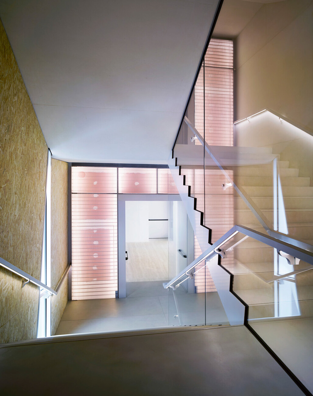 A strange building, in other words, that might not live up to expectations. After all, there is something incongruous-looking about the Torre; it does not boast an iconic appearance like the gilt “Haunted House” of the first construction phase. To make up for this Koolhaas, architecture’s grandmaster of ceremonies, has set the stage for amazing experiences that sensitize both the eye and body. Take the elevator that makes its way up the south façade: Every visitor should ride at least twice in this partially glazed cabin, once up and once down. Not because of the view, mind, but rather the sensation you get when the elevator emerges from the dark of the adjoining old building into the light and the floors of the building are visible in passing – what a spectacular architectural experience! In addition, half of the cabin is clad completely with backlit pale-pink marble. And the elevator presents a similar spectacle from the outside, both from the exhibition hall in the old building and the stairwell of the new Torre. Completely energized by this experience, the tour continues through the six exhibition levels, each with a different design: rectangular layouts alternating with wedge-shaped floorplans. The height of the rooms ranges from 2.7 meters on the first floor to 8 meters at the very top. Sometimes it is the short sides that are glazed and sometimes the long side, facing north, towards the city.