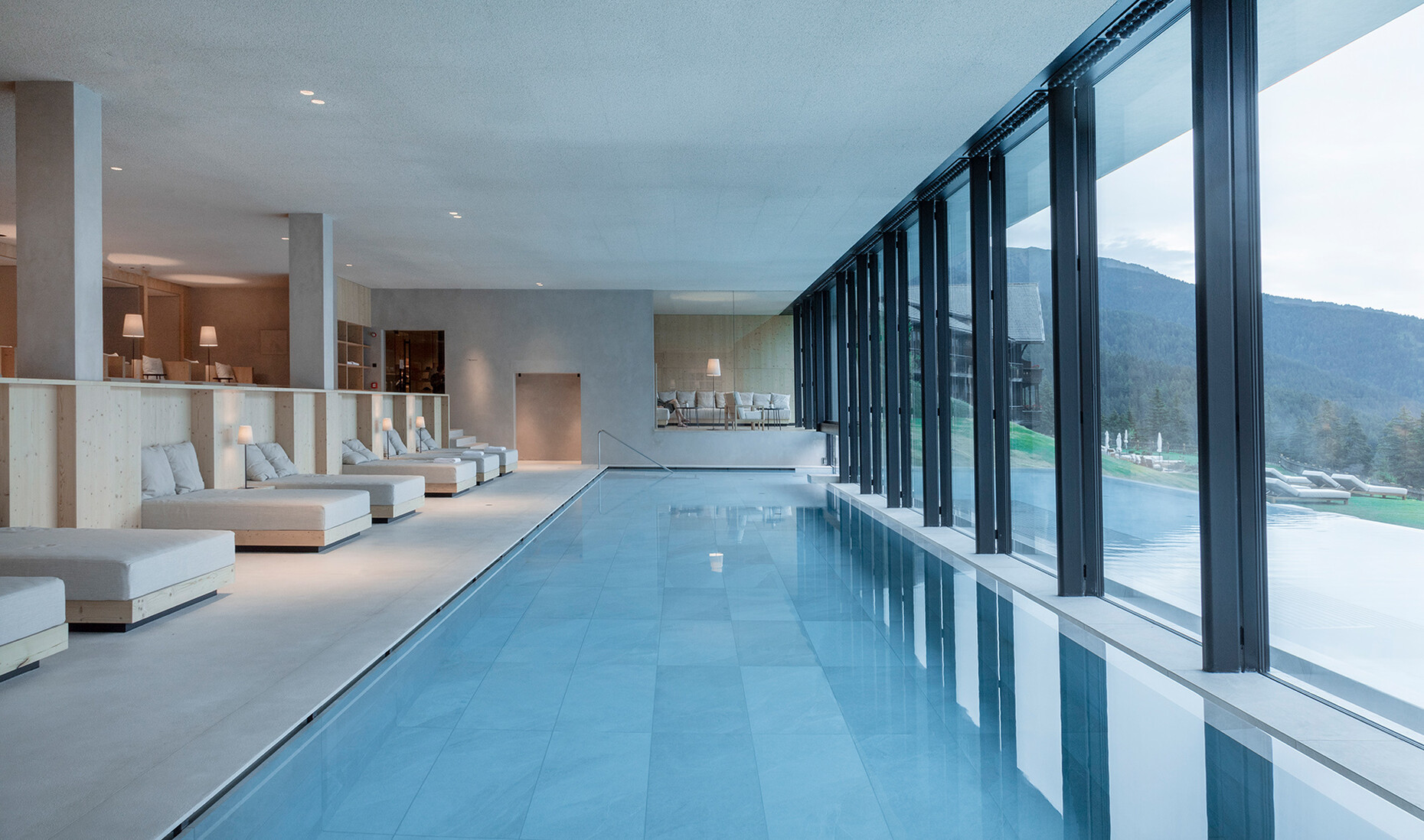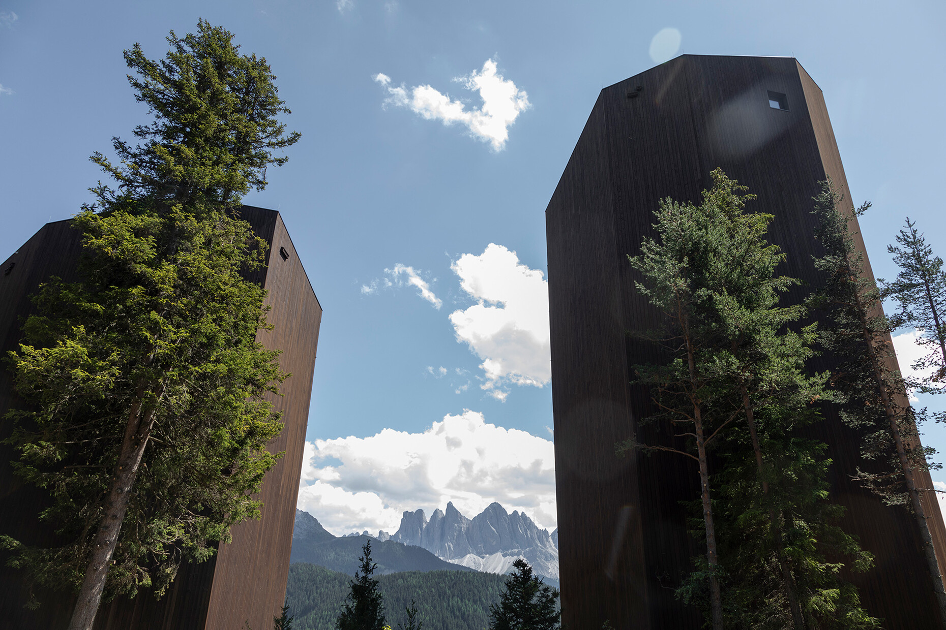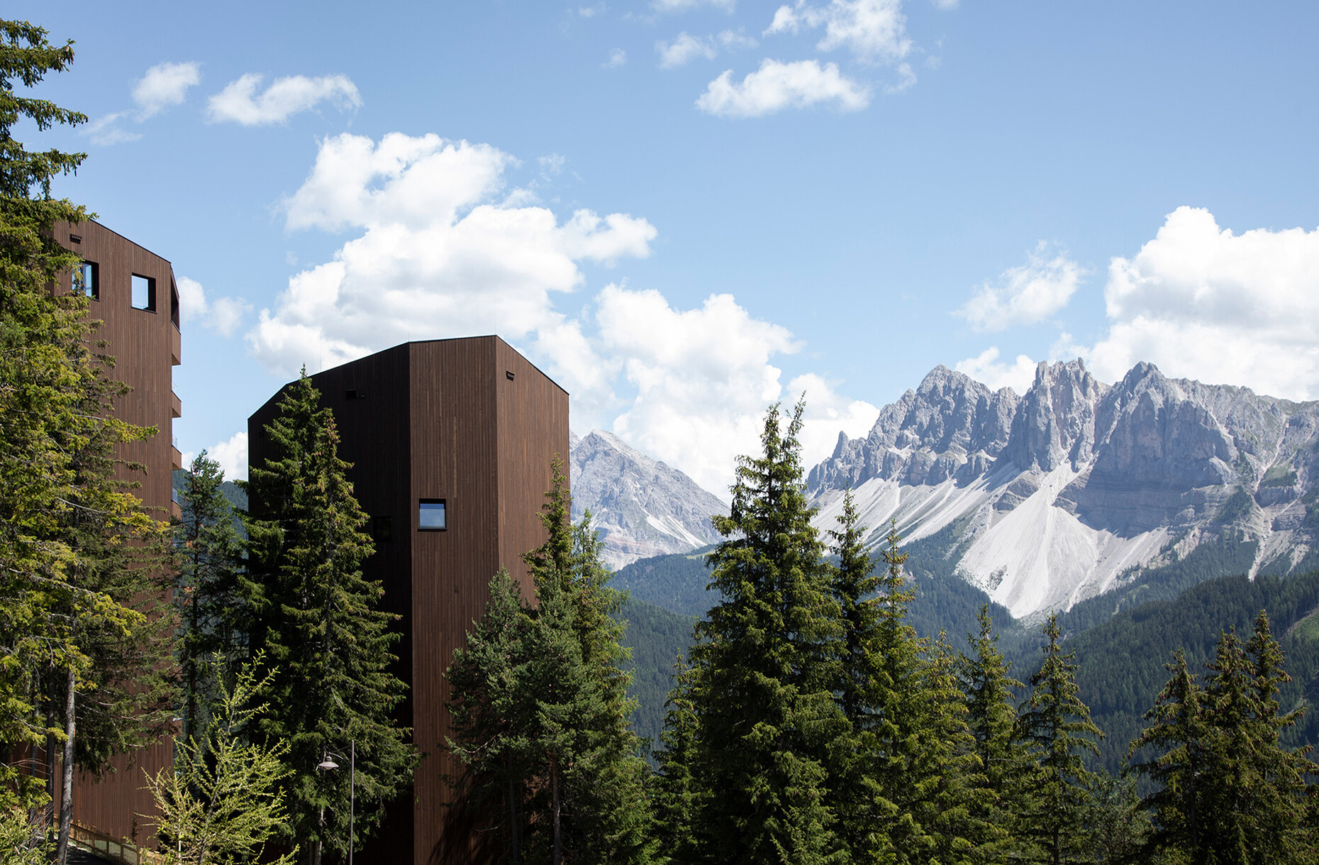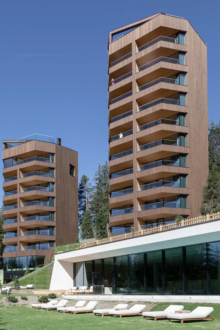 Clear spring water, oxygen-rich air and a magnificent view over the UNESCO World Heritage Site of the Dolomites: These are just three advantages of the location of the Forestis at 1,800 meters above sea level. You have to climb beyond the fog line on the Ploseberg to find the hotel, which was recently comprehensively expanded and renovated by Stefan Hinteregger and Teresa Unterthiner with the help of Asaggio Architects. “We wanted a very linear, restrained design language and a sustainable approach,” explains architect Armin Sader. “Architecture begins with an homage to the place,” is the firm’s guiding principle, and Sader believed it was very important to model the structure with the highest aspirations of sustainability, so that it might slot seamlessly into the natural landscape. Three identical towers were built from dolomite stone clad in wood, with a natural filler made of rock flour, water, loam and beeswax used in the process. The three new towers appear like tall, branchless tree trunks coupled with a flatter structure for the pool, which boasts indoor and outdoor sections. “The aim was to use local materials, but we didn’t want any alpine kitsch,” says Teresa Unterthiner.