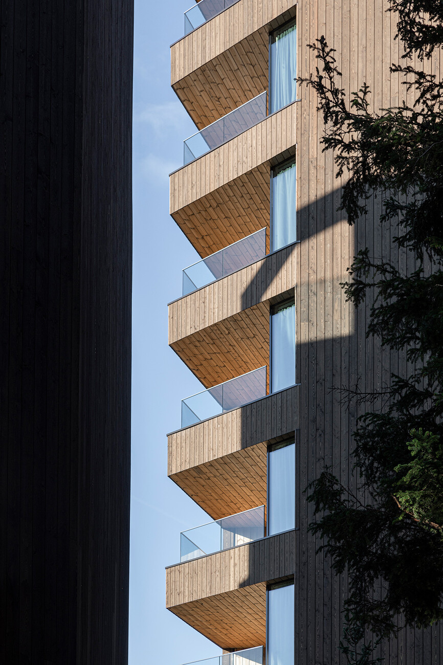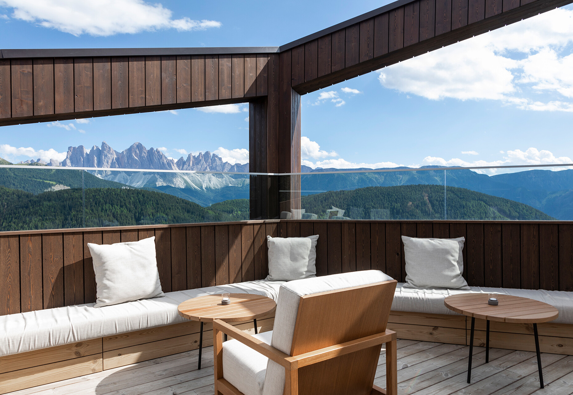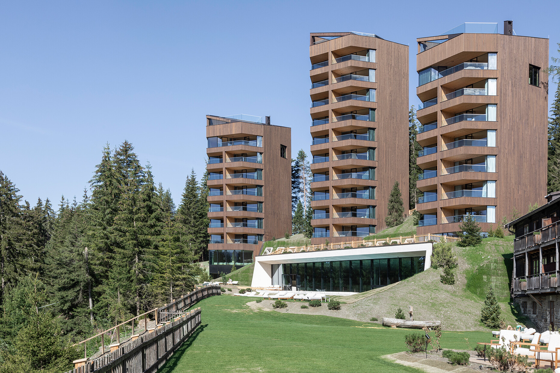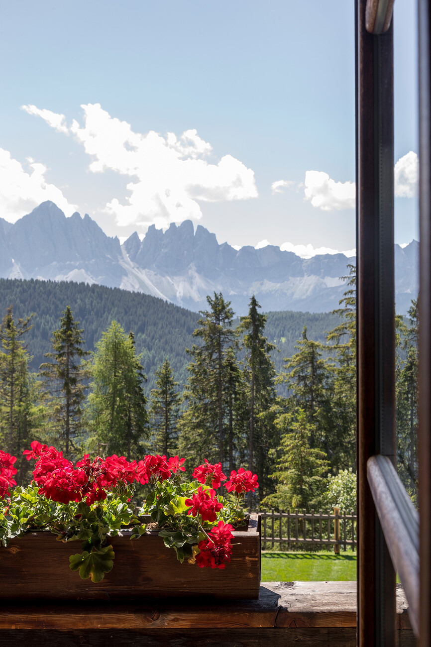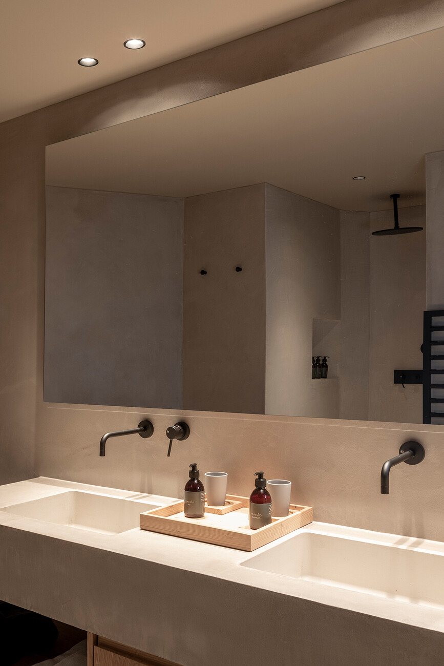 Clear spring water, oxygen-rich air and a magnificent view over the UNESCO World Heritage Site of the Dolomites: These are just three advantages of the location of the Forestis at 1,800 meters above sea level. You have to climb beyond the fog line on the Ploseberg to find the hotel, which was recently comprehensively expanded and renovated by Stefan Hinteregger and Teresa Unterthiner with the help of Asaggio Architects. “We wanted a very linear, restrained design language and a sustainable approach,” explains architect Armin Sader. “Architecture begins with an homage to the place,” is the firm’s guiding principle, and Sader believed it was very important to model the structure with the highest aspirations of sustainability, so that it might slot seamlessly into the natural landscape. Three identical towers were built from dolomite stone clad in wood, with a natural filler made of rock flour, water, loam and beeswax used in the process. The three new towers appear like tall, branchless tree trunks coupled with a flatter structure for the pool, which boasts indoor and outdoor sections. “The aim was to use local materials, but we didn’t want any alpine kitsch,” says Teresa Unterthiner.