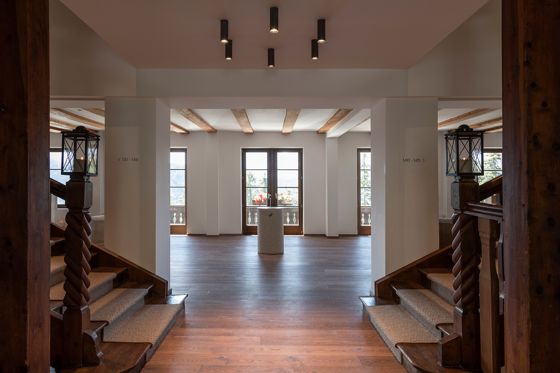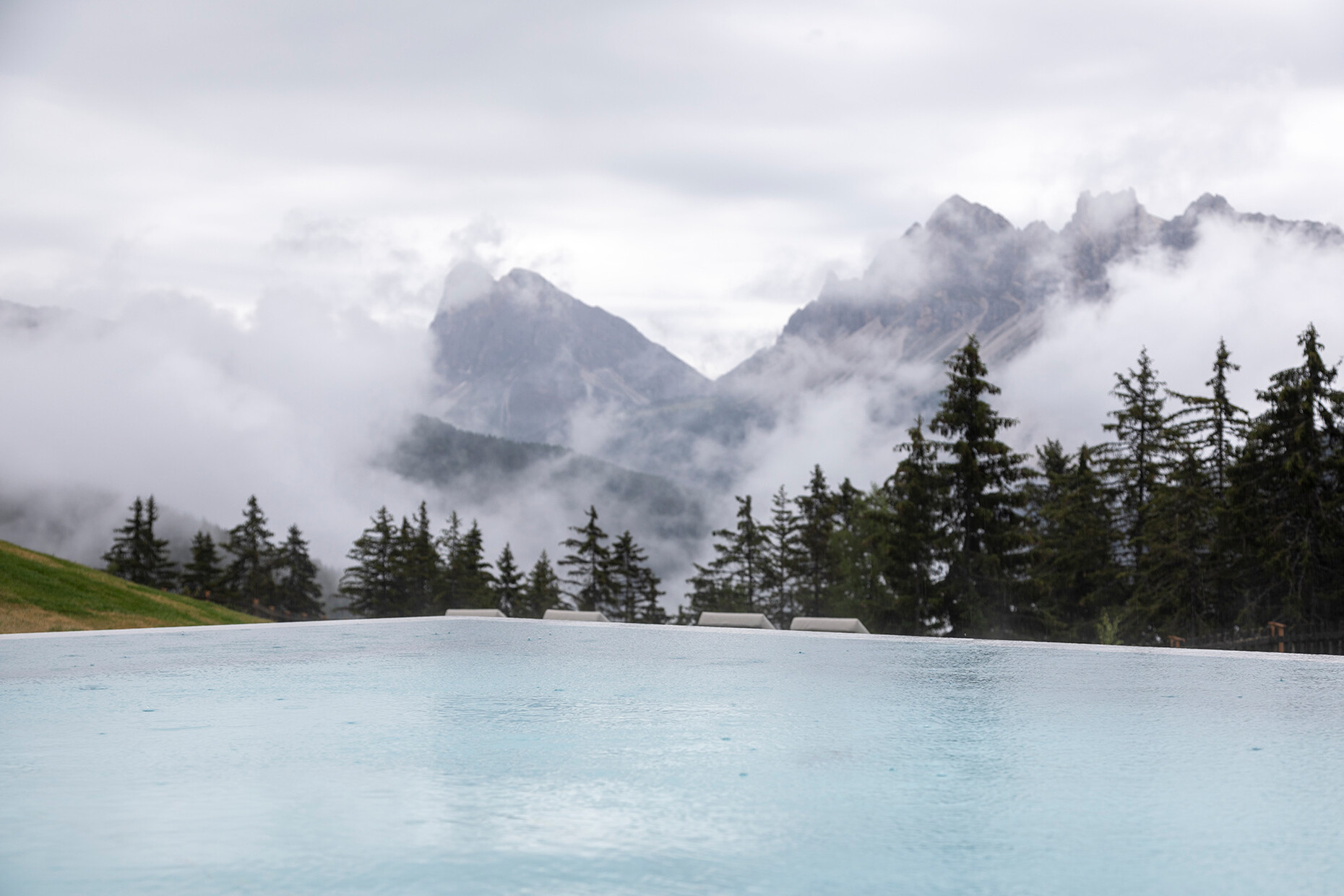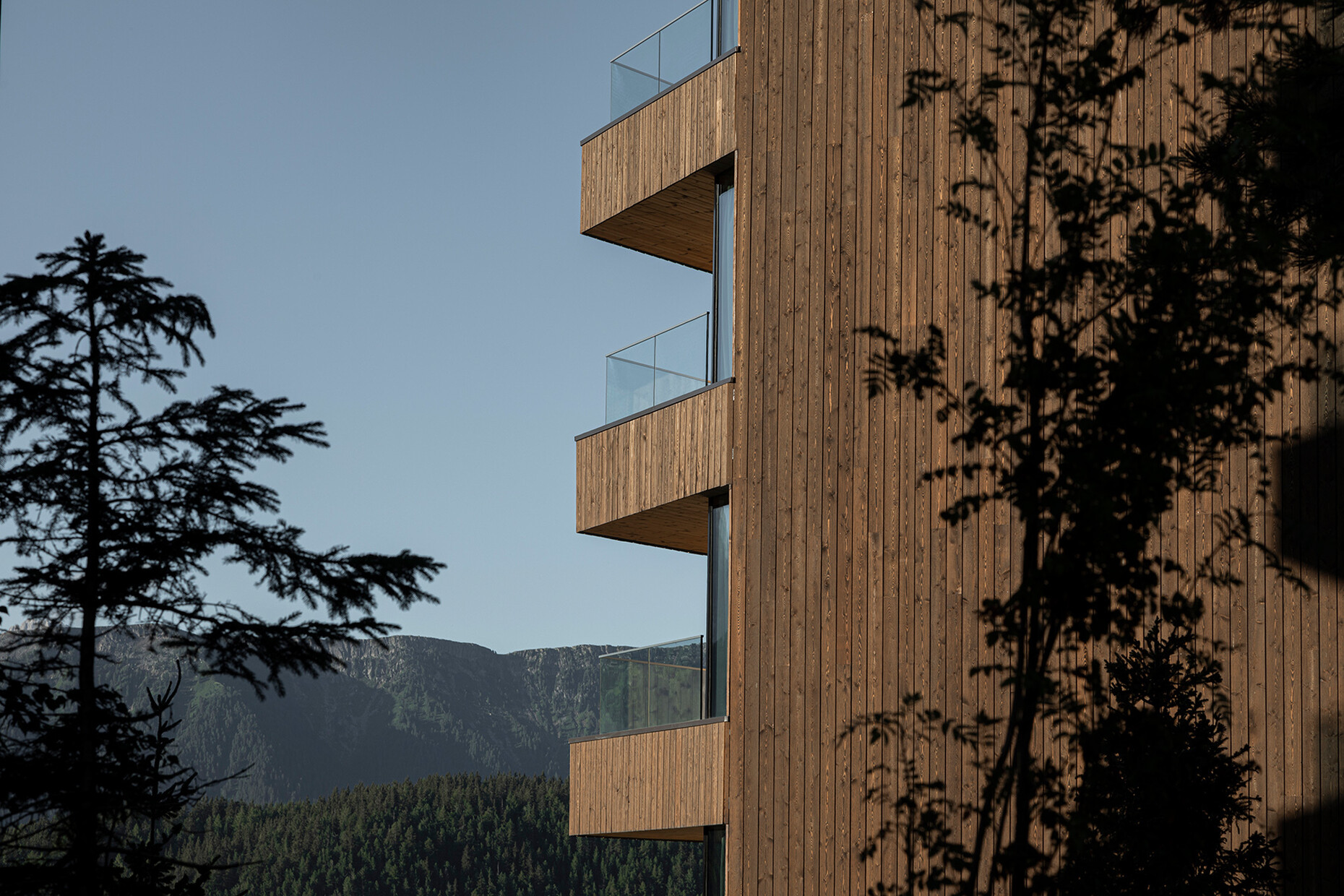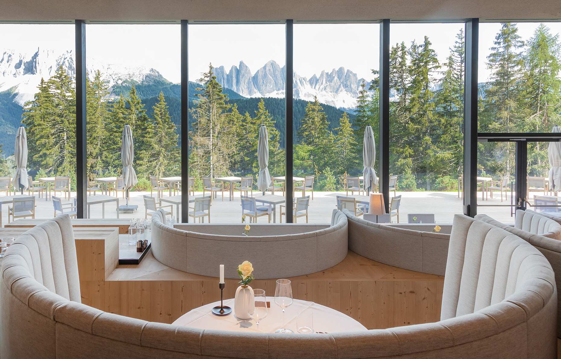 Clear spring water, oxygen-rich air and a magnificent view over the UNESCO World Heritage Site of the Dolomites: These are just three advantages of the location of the Forestis at 1,800 meters above sea level. You have to climb beyond the fog line on the Ploseberg to find the hotel, which was recently comprehensively expanded and renovated by Stefan Hinteregger and Teresa Unterthiner with the help of Asaggio Architects. “We wanted a very linear, restrained design language and a sustainable approach,” explains architect Armin Sader. “Architecture begins with an homage to the place,” is the firm’s guiding principle, and Sader believed it was very important to model the structure with the highest aspirations of sustainability, so that it might slot seamlessly into the natural landscape. Three identical towers were built from dolomite stone clad in wood, with a natural filler made of rock flour, water, loam and beeswax used in the process. The three new towers appear like tall, branchless tree trunks coupled with a flatter structure for the pool, which boasts indoor and outdoor sections. “The aim was to use local materials, but we didn’t want any alpine kitsch,” says Teresa Unterthiner.