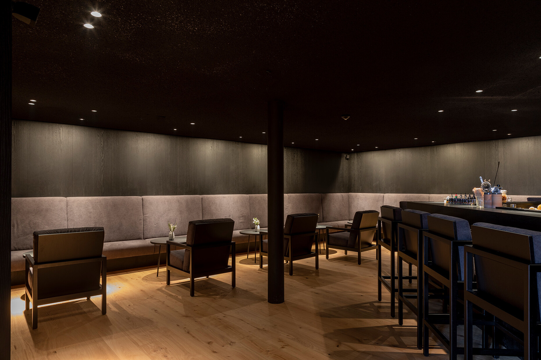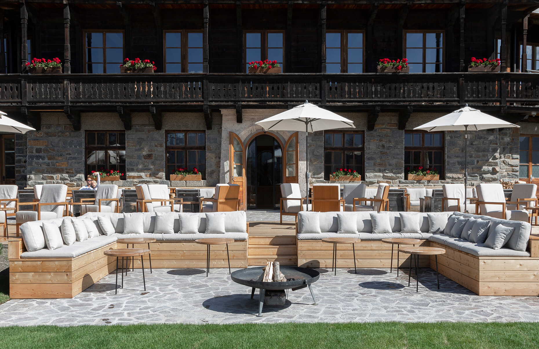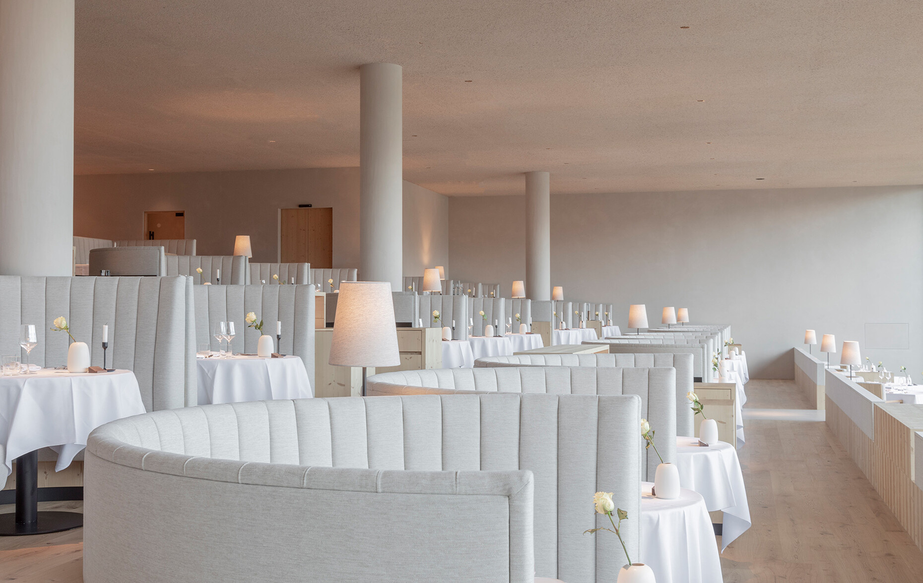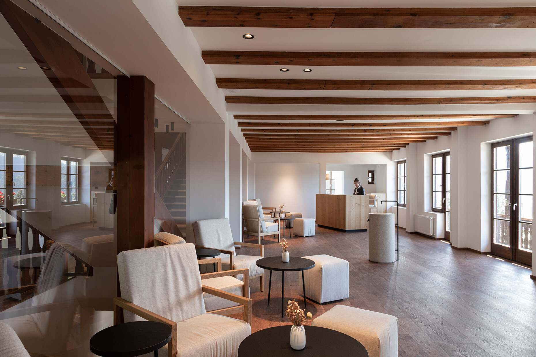 Clear spring water, oxygen-rich air and a magnificent view over the UNESCO World Heritage Site of the Dolomites: These are just three advantages of the location of the Forestis at 1,800 meters above sea level. You have to climb beyond the fog line on the Ploseberg to find the hotel, which was recently comprehensively expanded and renovated by Stefan Hinteregger and Teresa Unterthiner with the help of Asaggio Architects. “We wanted a very linear, restrained design language and a sustainable approach,” explains architect Armin Sader. “Architecture begins with an homage to the place,” is the firm’s guiding principle, and Sader believed it was very important to model the structure with the highest aspirations of sustainability, so that it might slot seamlessly into the natural landscape. Three identical towers were built from dolomite stone clad in wood, with a natural filler made of rock flour, water, loam and beeswax used in the process. The three new towers appear like tall, branchless tree trunks coupled with a flatter structure for the pool, which boasts indoor and outdoor sections. “The aim was to use local materials, but we didn’t want any alpine kitsch,” says Teresa Unterthiner.