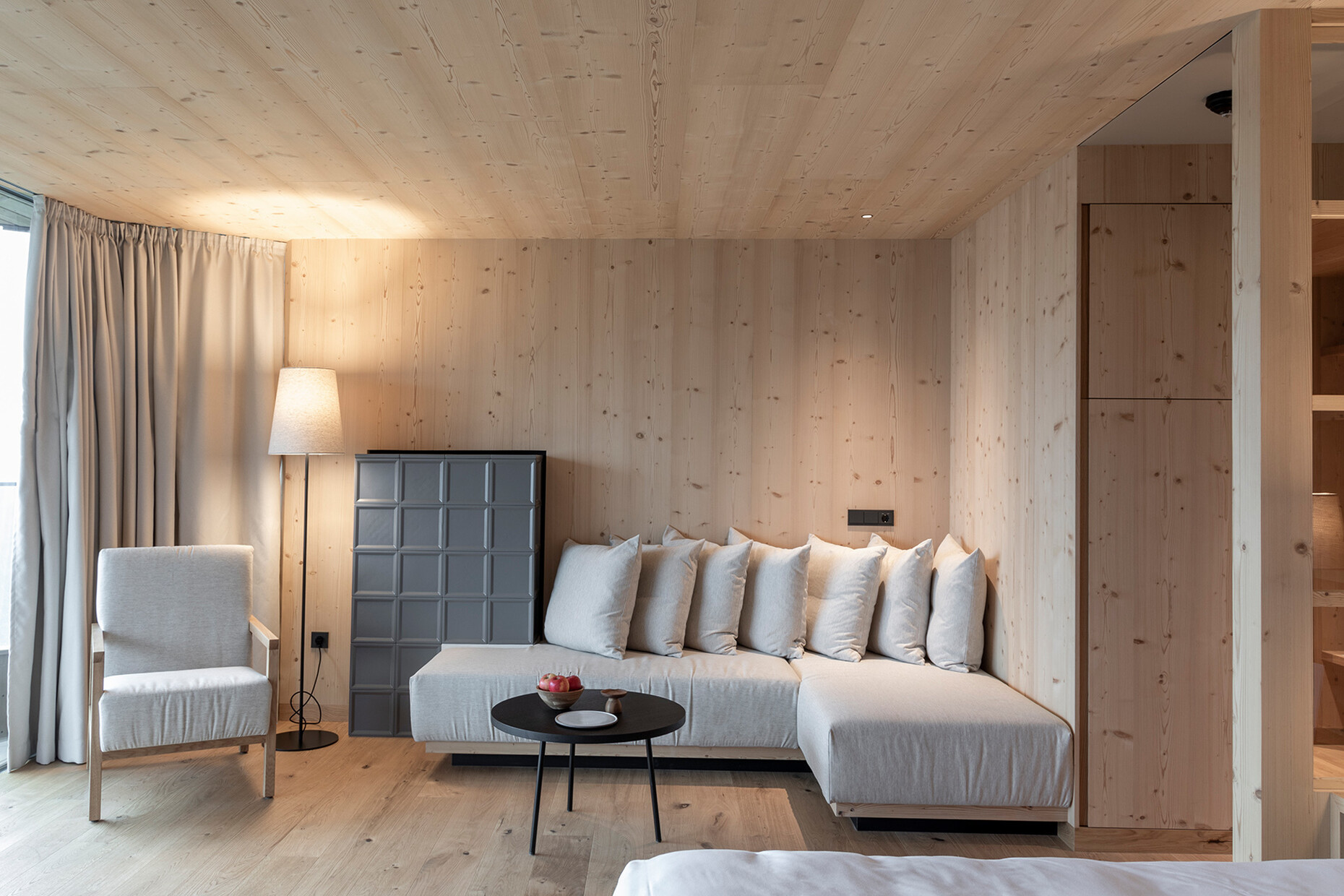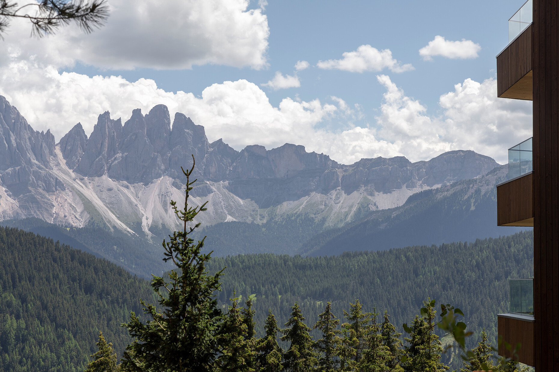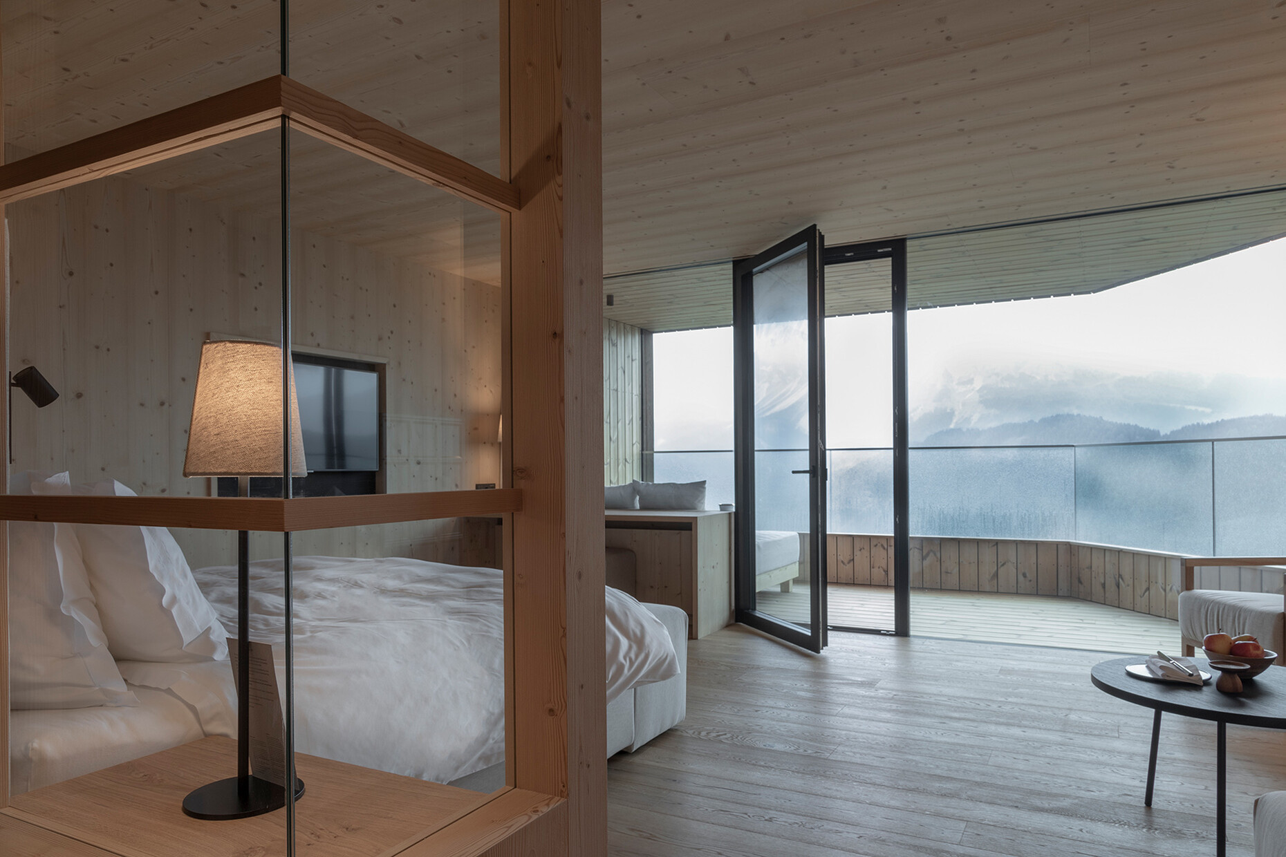 For the energy supply too, they decided to use renewable sources: The towers now house 44 suites, each of which is 55 square meters and boasts a south-facing balcony from which guests can enjoy the broad view over the UNESCO World Heritage Site in all its glory. On the roofs of the outer two towers sit the two penthouse suites, which have their own pools. Floor-to-ceiling windows allow in ample light, which illuminates the interior wood furnishings made to measure by a local carpenter. Even the walls and ceilings are made of spruce, which also serves to maintain a balanced temperature within the rooms. “Thanks to the vertical and sustainable design of the Forestis, the use of native wood, the recycling of the dolomite removed for the construction, and the fabrics woven in the Trentino region, we have established a connection with the landscape, nature and our culture while nevertheless reflecting the spirit of the times,” says Teresa Unterthiner.