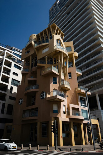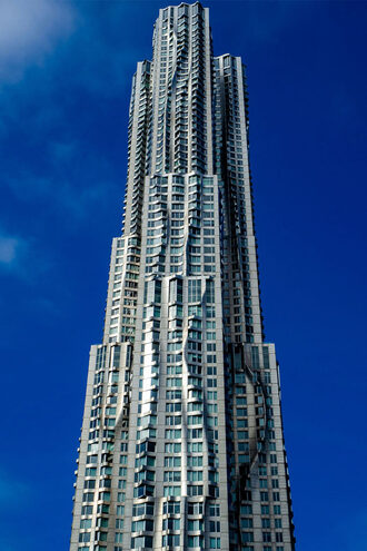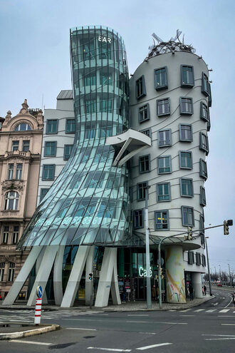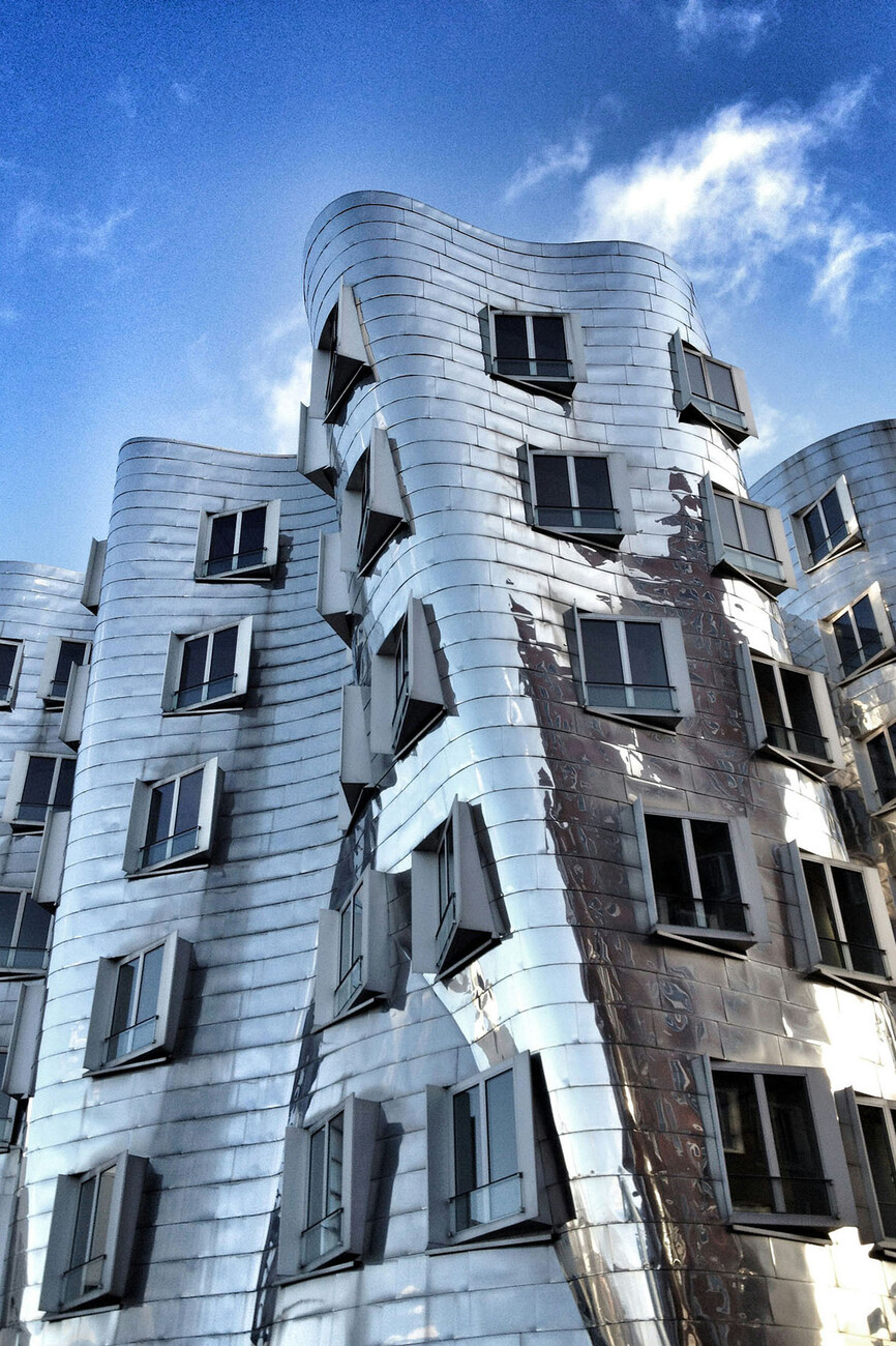 Over the years Gehry developed his own visual language for office buildings which he achieved by squeezing cubes or rounding them out for form cylinders, cladding them in contrasting materials like bricks, sheet titanium and plaster. Examples of this approach can be seen in the "Dancing House" (Ginger and Fred) in Prague or in his projects in Germany, the Neuer Zollhof in Düsseldorf (1999), the Gehry Tower in Hannover (2001) or Museum MARTa in Herford (2005). Only once did Frank O. Gehry give his commentators something to puzzle over: that was when he built the DZ Bank (formerly DG Bank) building in Berlin. Suddenly, on Pariser Platz next to Brandenburg Gate there was a heavy, stone box that did not exude anything of Gehry’s carefreeness and nonchalant free spirit. The solid outer wall with deeply incised, stereometric window openings has been read as an ironic commentary by Gehry given their grotesque caricature of Berlin’s design guidelines ("the stony Berlin"). However, what you see inside is Gehry at his purest, a squashed room that seems suspended in the atrium, a room some see as being shaped like a horse’s head. And he also remained true to himself on the South facade, where he might have used the prescribed stone façade, but with vibrant walls and dancing casement windows, as previously featured in the New Zollhof, Düsseldorf.