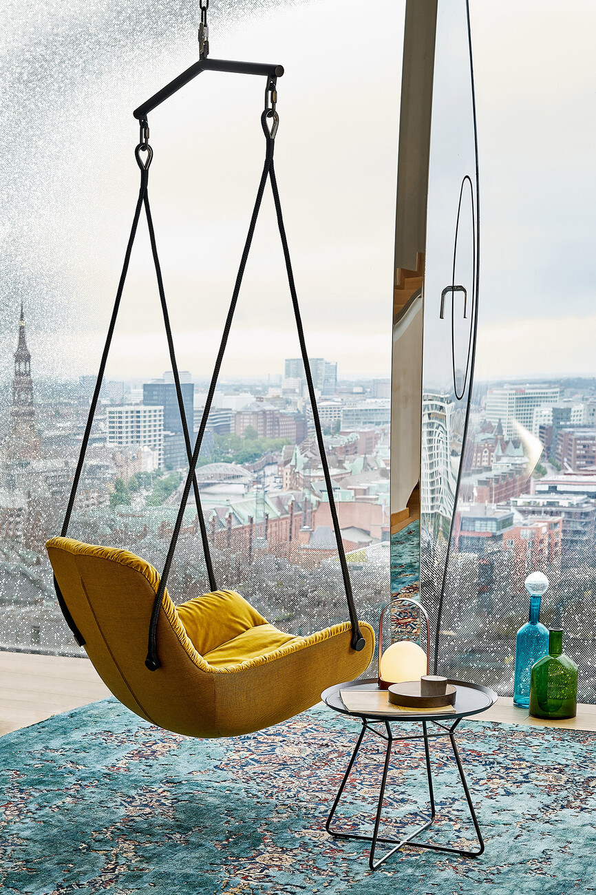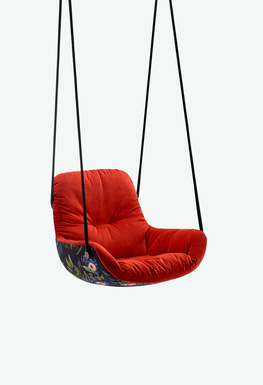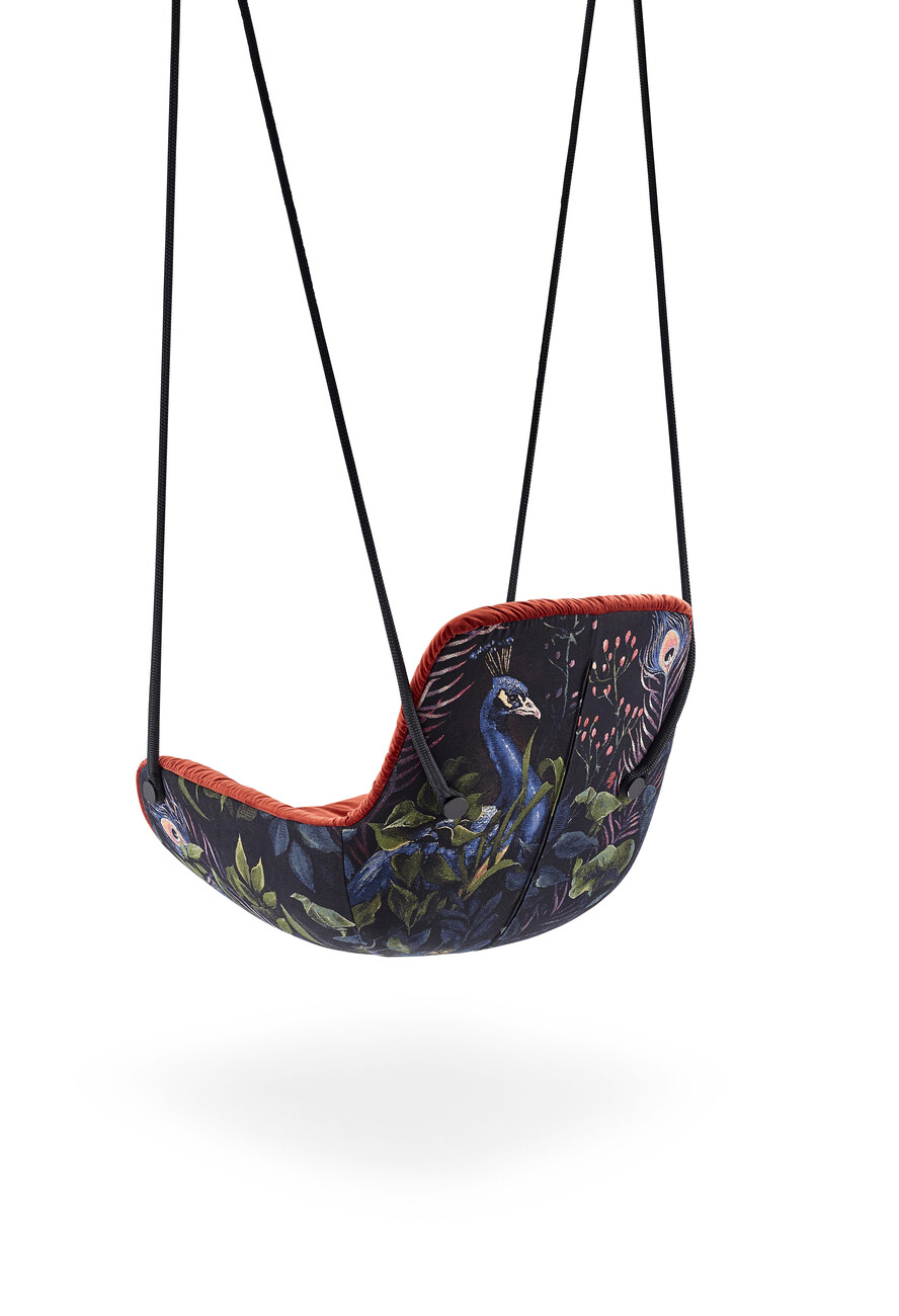 The modular nature of the designs by Hoffmann Kahleyss is exemplified by the “Leya” product family – the designers view the frames and seat shells of their collections as building blocks that can be assembled separately of one another to create new variants. In their shared design language too, Birgit Hoffmann and Christoph Kahleyss combine the best of both worlds. “Birgit is more open to experimentation and more impulsive, while I’m more technical and like to question the ideas,” explains Kahleyss. “The products have something of each of us: unpretentiousness, function, but also individuality and originality,” Hoffmann adds. The idea of a rocking chair is followed by the “Leya Swing Seat”: To this end, the “Leya” seat shell is fitted with metal eyelets and ropes for installation on a veranda. The free-hanging construction is reminiscent of childhood swings and provides ample movement even with little available space. The single hanging point also makes it possible to rotate 360 degrees in the chair. Differences in ceiling height are balanced out easily with the chain that forms part of the “Leya Swing Seat” suspension. For that certain something extra, the exterior of the seat shell can also be covered with the opulent “Oasis” tapestry fabric with its jungle pattern, which Freifrau created in collaboration with designer Christian Trzaska and the Belgian fabric manufacturer Meisterwerke. “Every Freifrau chair should be something really special,” notes Christoph Kahleyss.