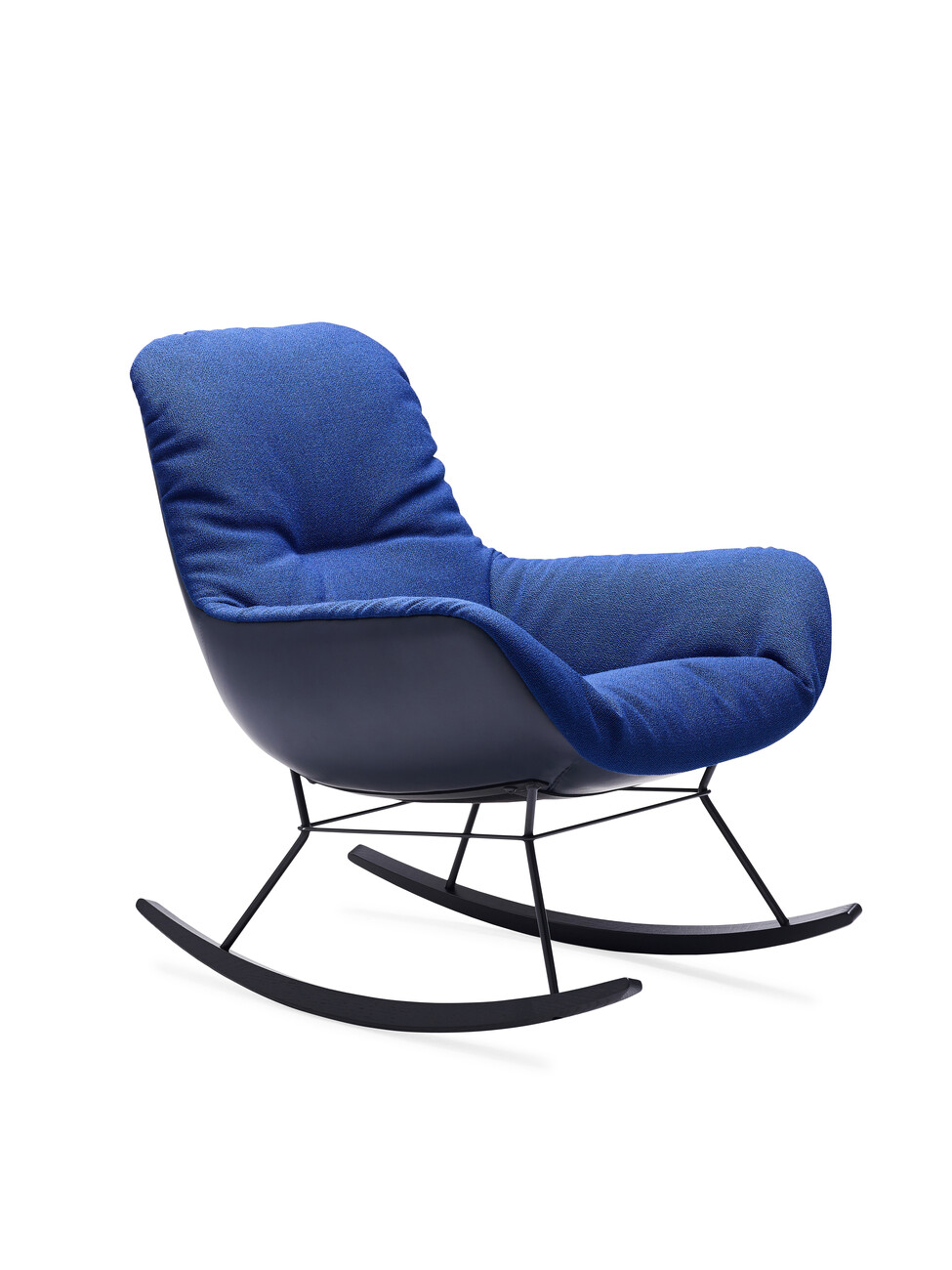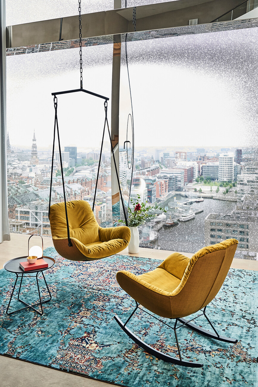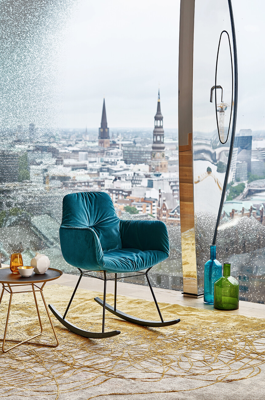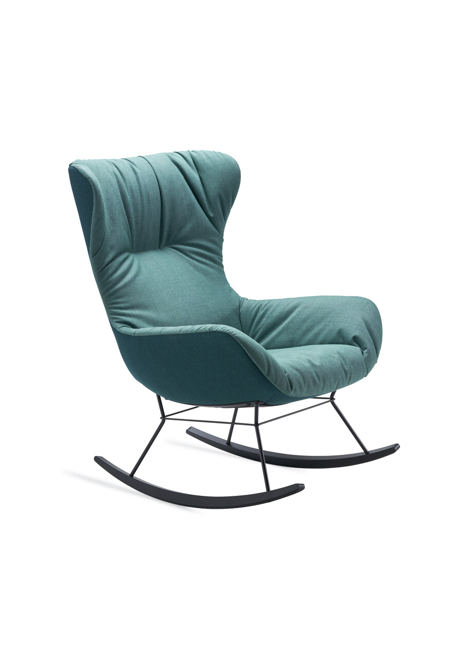 “Anyone who has ever sat in a rocking chair knows how calming it is,” says Kahleyss. Like the “Leya Lounge Chair”, the rocking chair softly envelops the body with its upholstered inner surface, thus ensuring additional comfort. For the utmost rocking pleasure, three different sizes are available, ranging from the “Leya Rocking Chair Small” to the “Leya Rocking Chair” to the “Leya Rocking Wingback Chair”. For the upholstery, customers can choose from the gamut of materials and colors available in the collection, ranging from velveteen to leather and from bright petrol blue to dark grey. Those who prefer to do so can choose their own fabric for the upholstery. The great variability of the products is part of the philosophy behind seating manufacturer Freifrau. In terms of shape, meanwhile, the rocking chairs remain discreetly in the background: “The aim was not to make the rocking chair too extravagant, but rather for it to slot homogeneously into any living space,” explains Christoph Kahleyss.