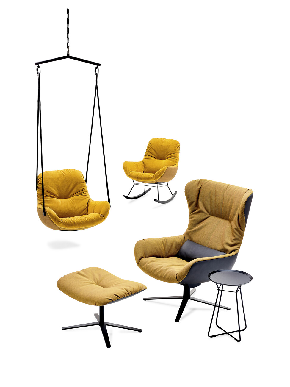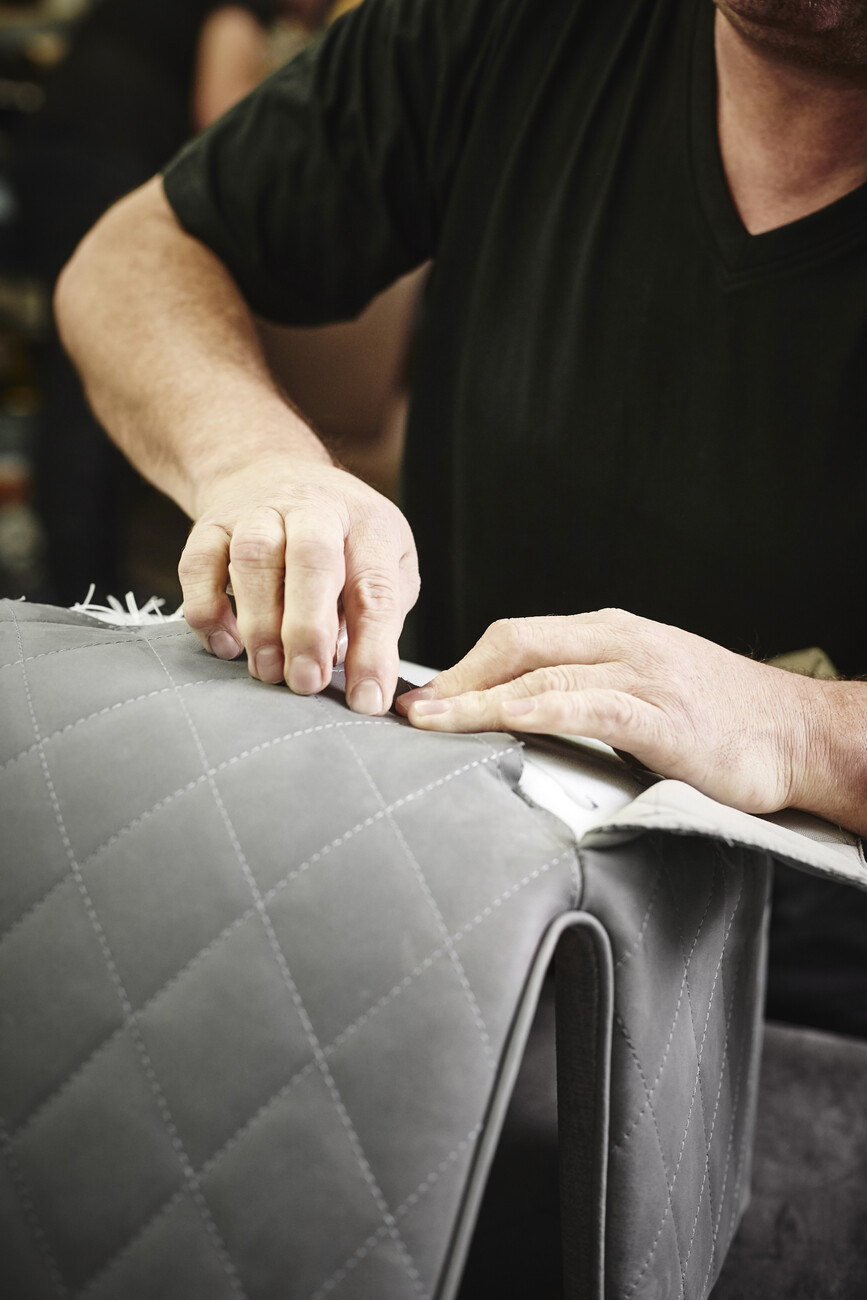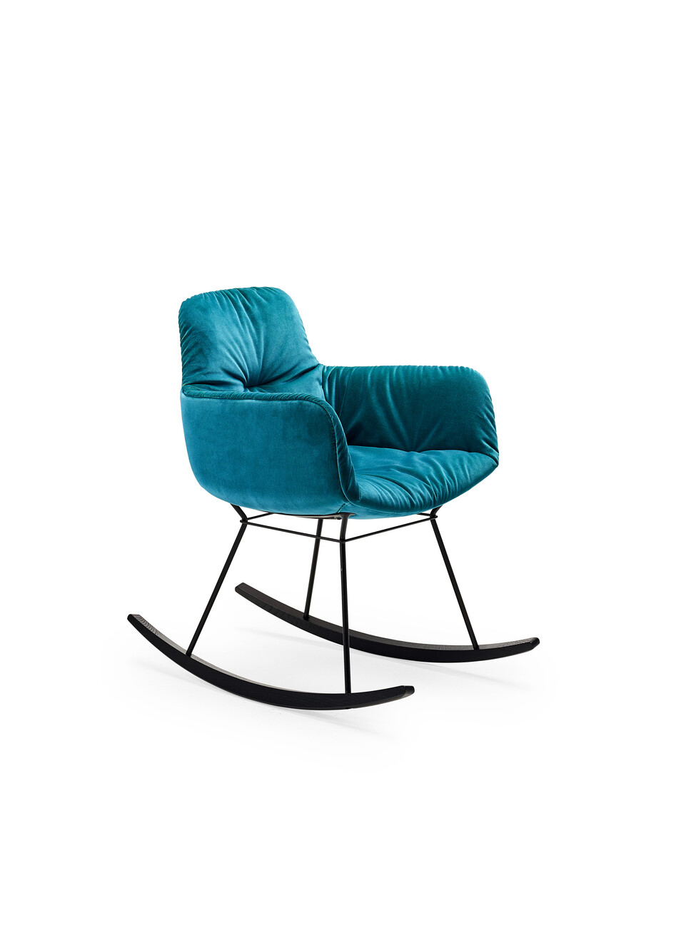 “Anyone who has ever sat in a rocking chair knows how calming it is,” says Kahleyss. Like the “Leya Lounge Chair”, the rocking chair softly envelops the body with its upholstered inner surface, thus ensuring additional comfort. For the utmost rocking pleasure, three different sizes are available, ranging from the “Leya Rocking Chair Small” to the “Leya Rocking Chair” to the “Leya Rocking Wingback Chair”. For the upholstery, customers can choose from the gamut of materials and colors available in the collection, ranging from velveteen to leather and from bright petrol blue to dark grey. Those who prefer to do so can choose their own fabric for the upholstery. The great variability of the products is part of the philosophy behind seating manufacturer Freifrau. In terms of shape, meanwhile, the rocking chairs remain discreetly in the background: “The aim was not to make the rocking chair too extravagant, but rather for it to slot homogeneously into any living space,” explains Christoph Kahleyss.