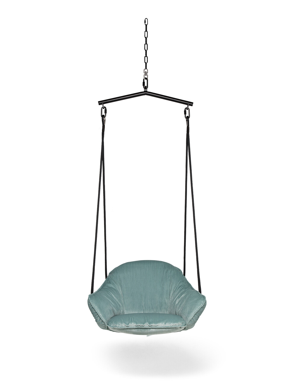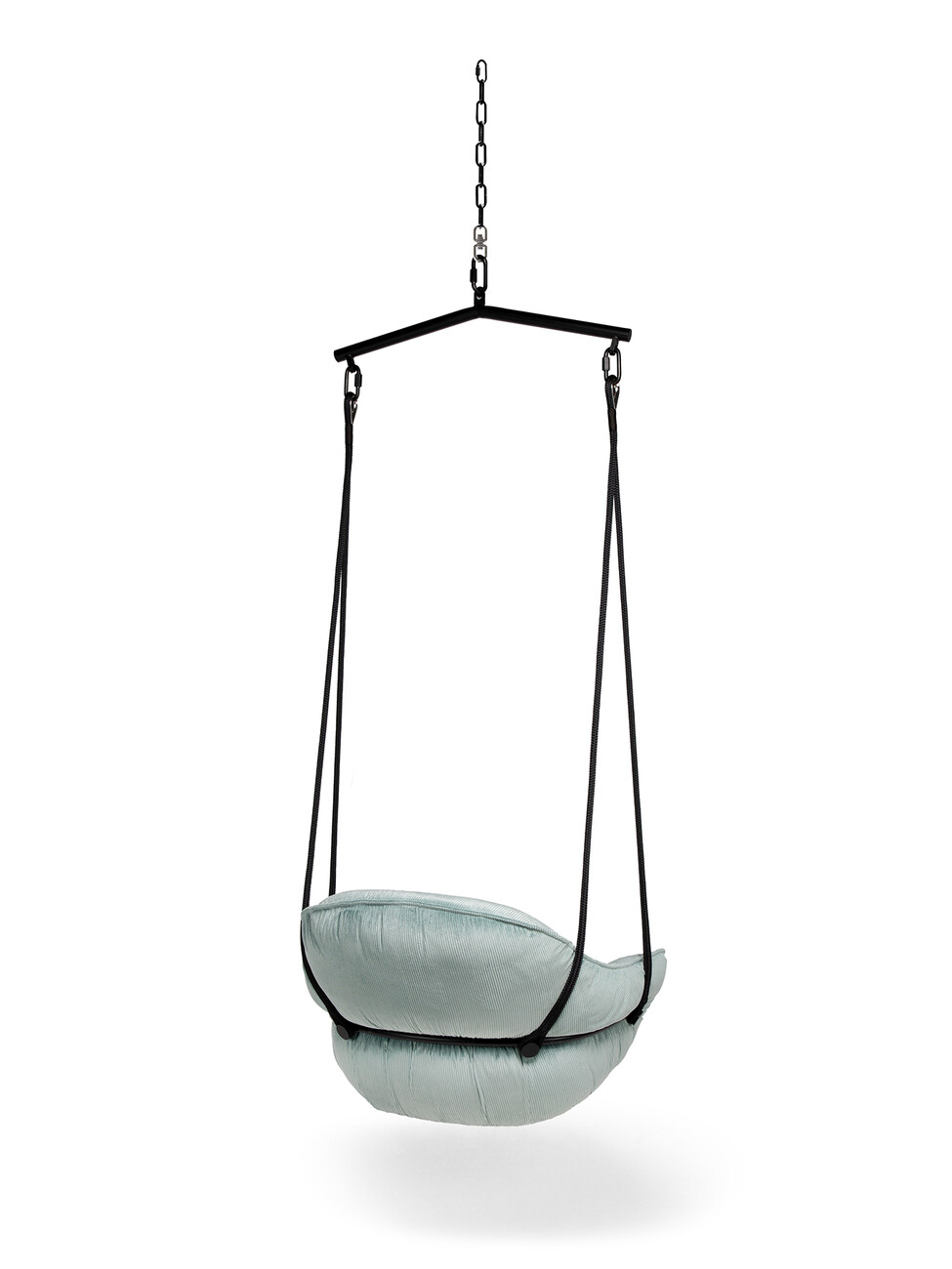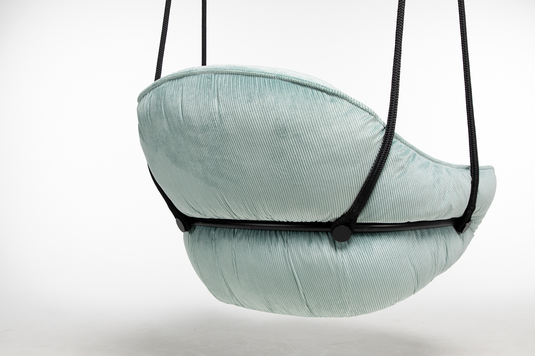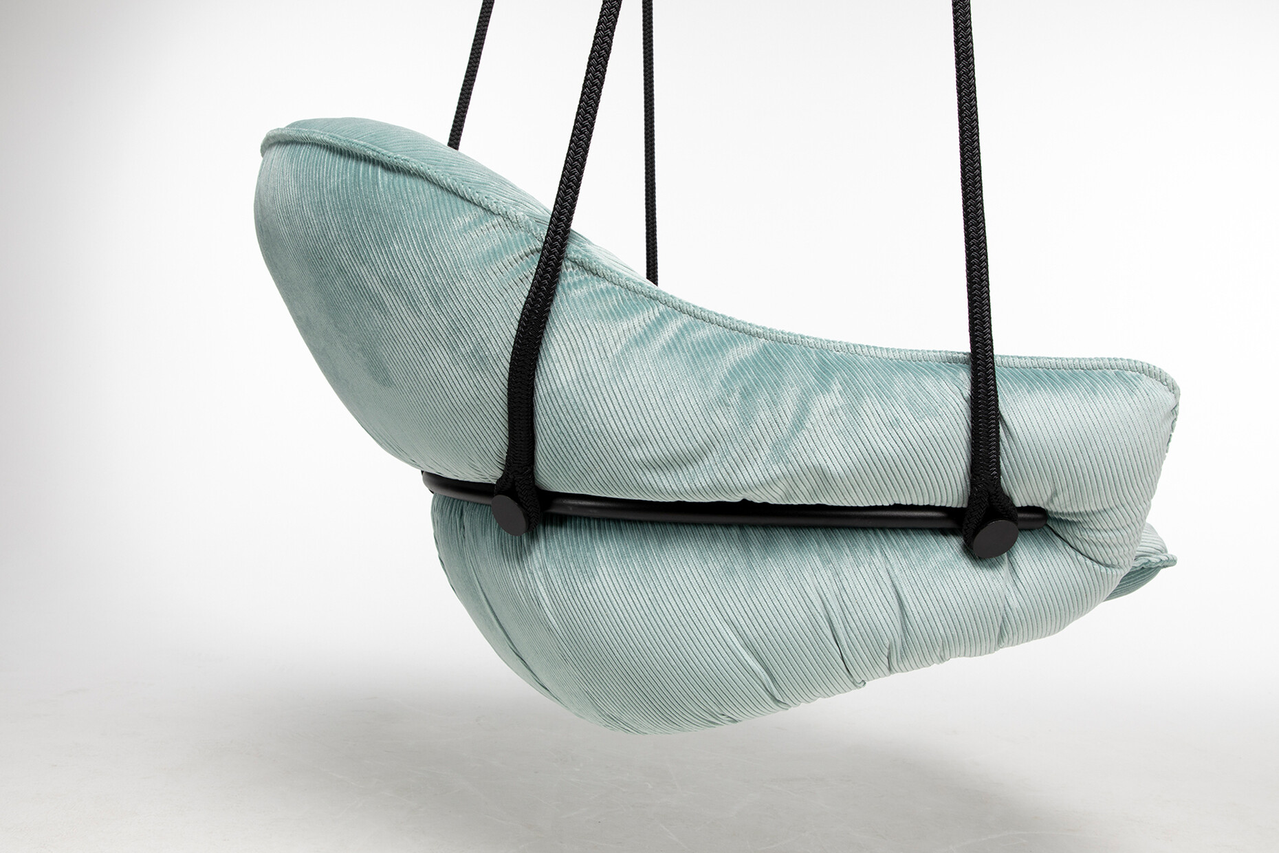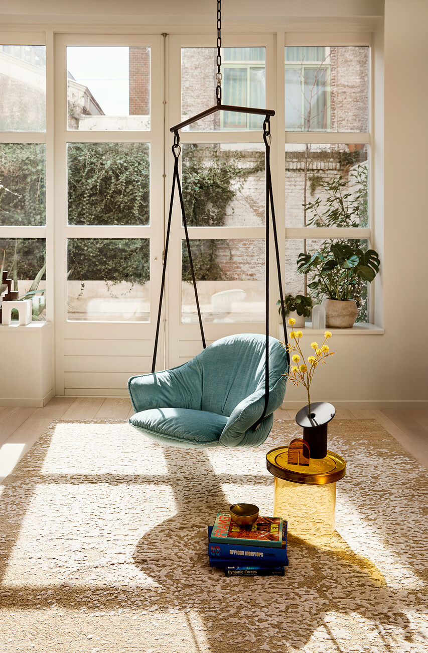 Two sturdy black ropes provide the basis for the pleasure of being able to let your legs dangle while talking on the phone or relaxing. Naturally with style: the design by Birgit Hoffmann and Christoph Kahleyss for Freifrau offers a generous seat, which can be upholstered in a variety of colours, textiles and leather. The super-soft upholstery always retains its shape and is elegantly framed by a filigree tubular steel frame. ‘The challenge was to create a soft cushion that offers the sitter sufficient support and seating comfort without becoming bulky and flat over time. The solution is a cushion inlet with a special filling and an extra chamber into which the back shell is pushed,’ says Hoffmann Kahleyss. Depending on the room height, you can choose between a one-point or two-point suspension system. (am)
