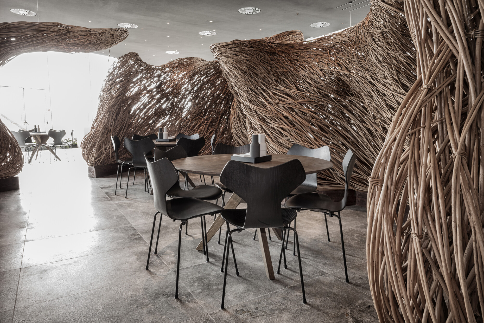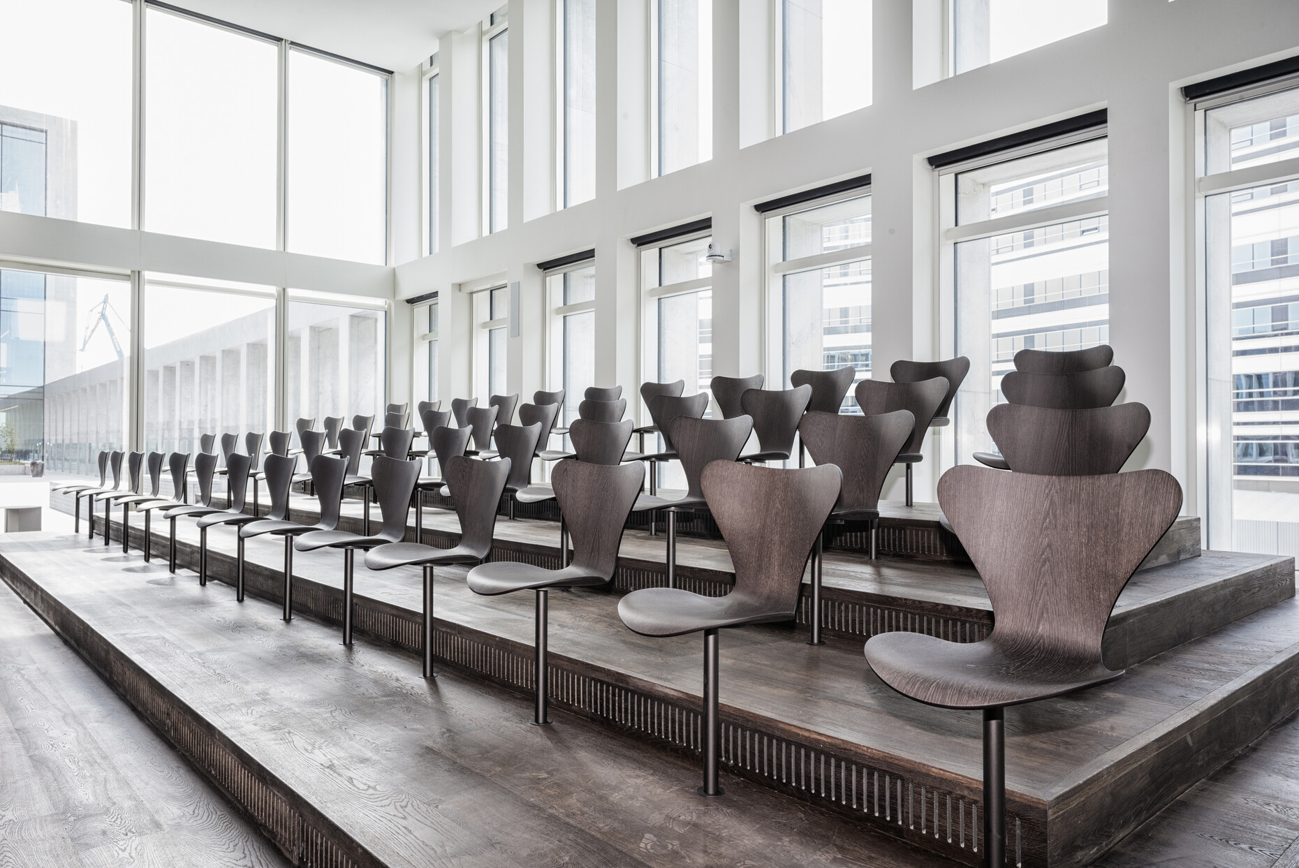 In the auditorium the corpus of the Series 7 has been attached to a metal base, with the result that it appears to be floating. With its utterly pared-down lines, the appearance of this organically sweeping chair is truly austere. And just how individual seating furniture made of compression-molded sliced veneer and chromed tubular steel can be is demonstrated in the canteen. Here, the choice fell on the Grand Prix chair. The companion model to Series 7 also stacks but boasts a slightly more striking shape. Originally on wooden legs, functional classic 2014 has been reissued in a version on tubular-steel legs. And as a version in black-colored ash it adds clear lines to the interior and cuts a fine figure at any shape of table. For lengthy meetings Grand Prix is available on castors and with an upholstered leather cover. Whether as swivel chairs, on four legs or on a base, Fritz Hansen chairs offer an aesthetic solution for all requirements in the office complex.