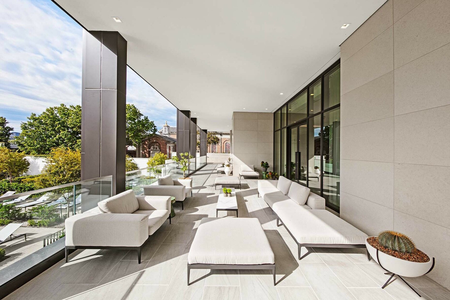 The residential high-rise nestles in a sprawling outdoor complex that covers approximately three acres. It was designed as a retreat that serves as an urban oasis thanks to its lush landscaping with terraced gardens, a pool with lounging areas, a dog park, several outdoor and catering kitchens, and two guest suites. Thanks to the large glass facades spanning 19 stories, the interior of the building blends with the exterior, making the apartments feel even larger. The interplay of inside and outside is also emphasized by the furnishing of the terrace, pool, and garden areas. The “Grid Lounge collection” created by Danish designer Henrik Pedersen for Gloster is a modular outdoor furniture system that includes various sofas, armchairs, chaise longues, loungers, and tables, and can be found everywhere here. The terrace of “The River Oaks”, for example, features the “Grid Sofa” and the “Grid Lounge Chair”, together with the “Grid Ottoman” and the “Grid Coffee Table”.