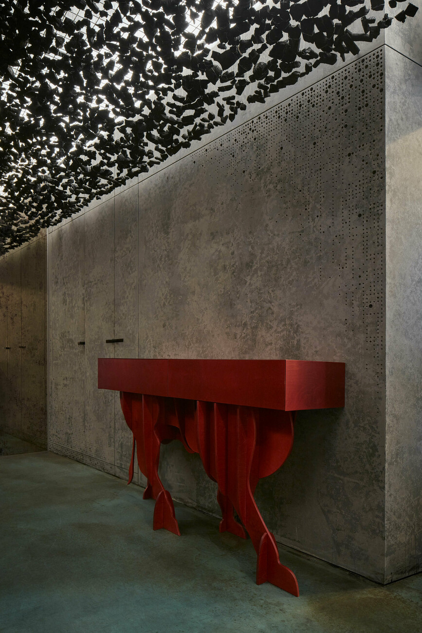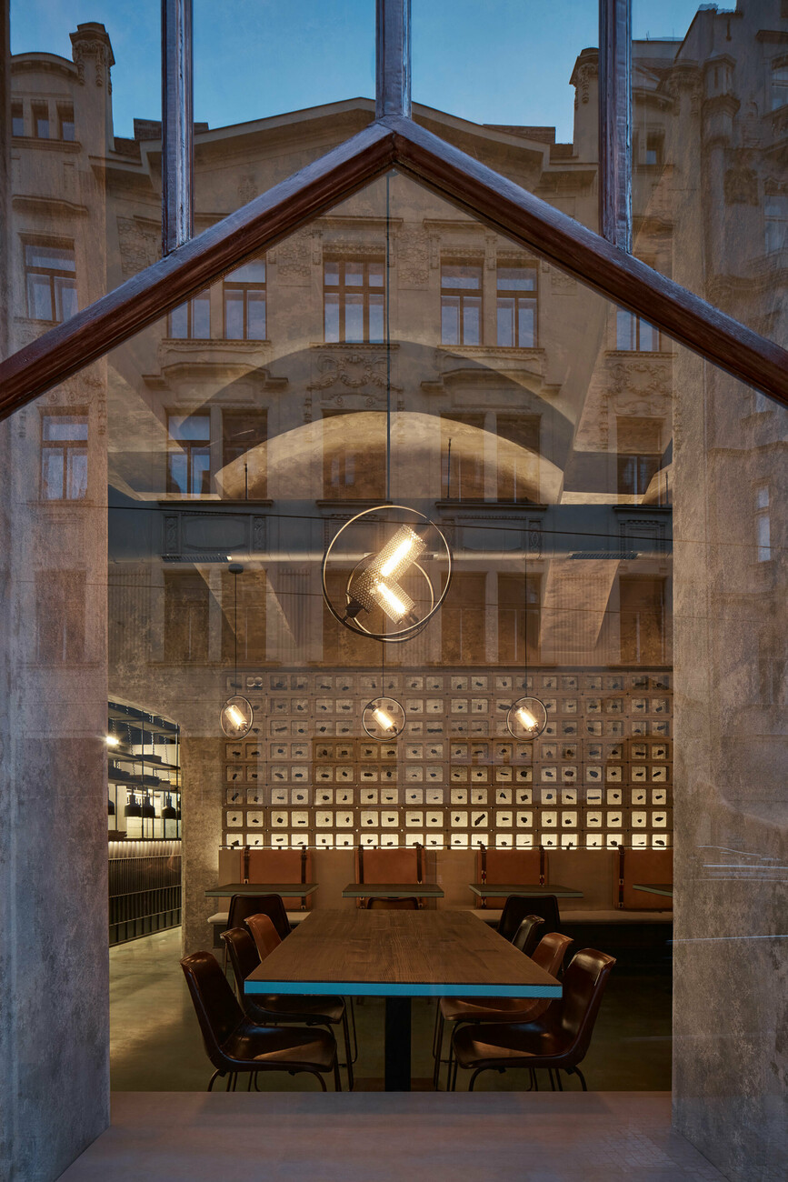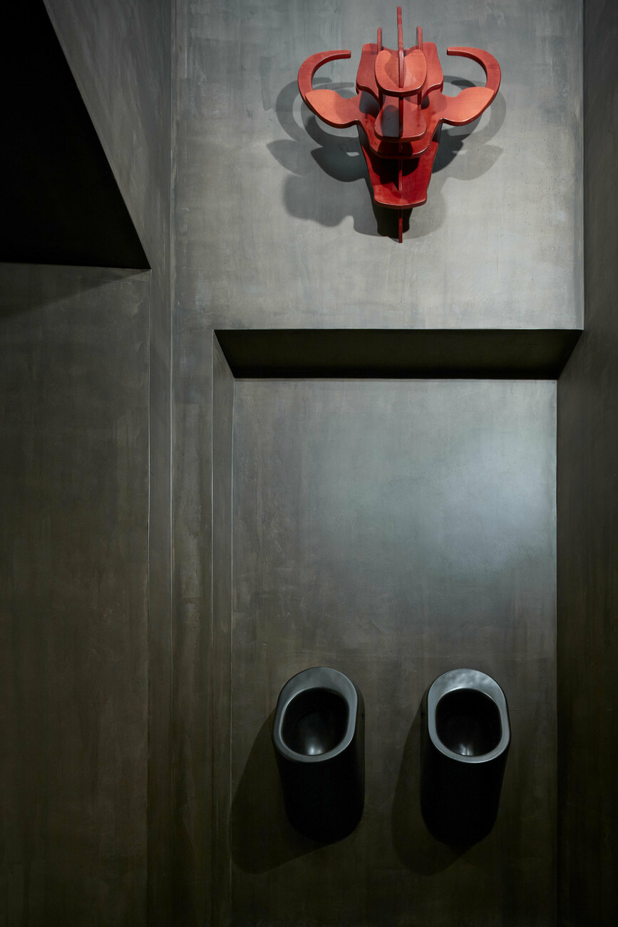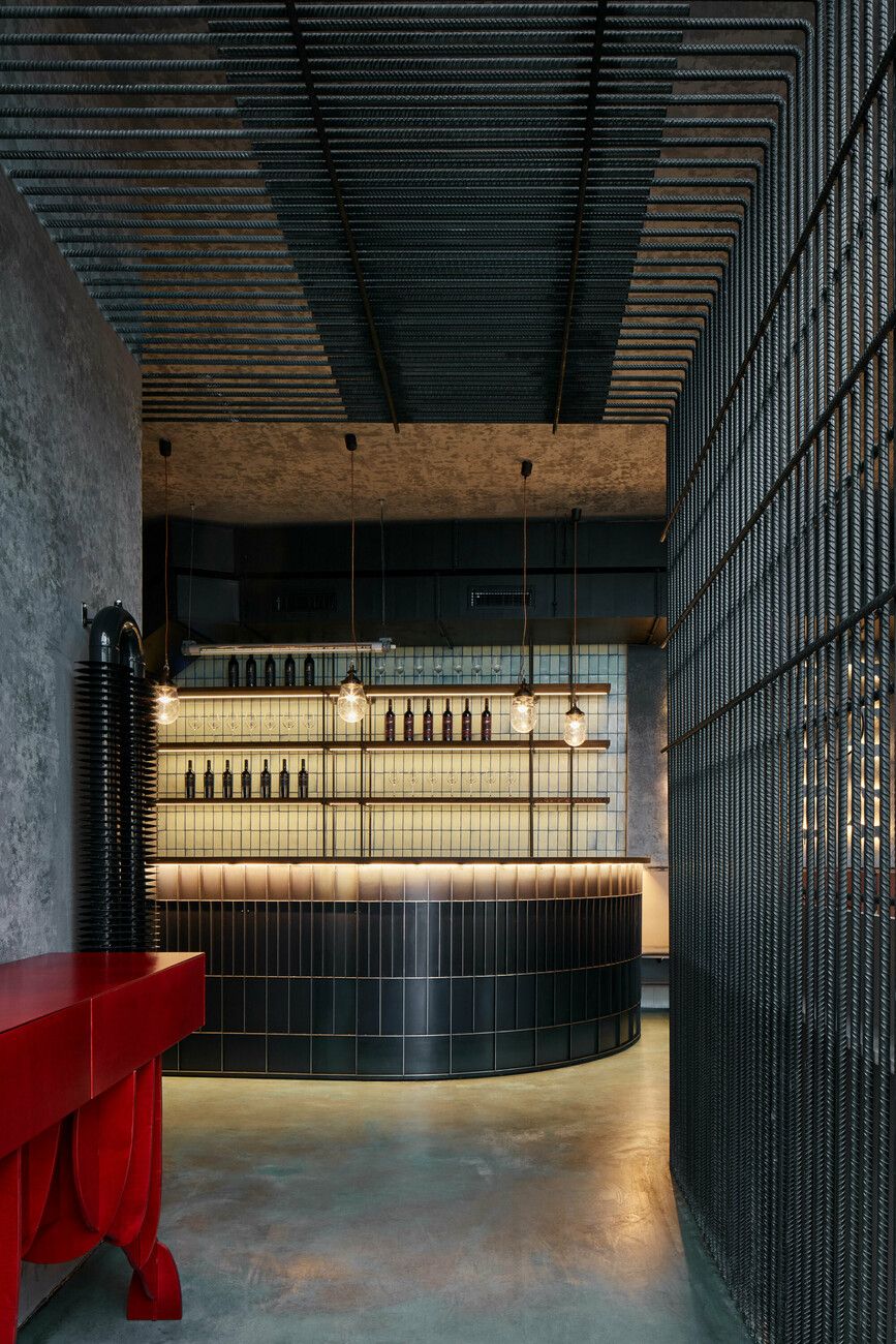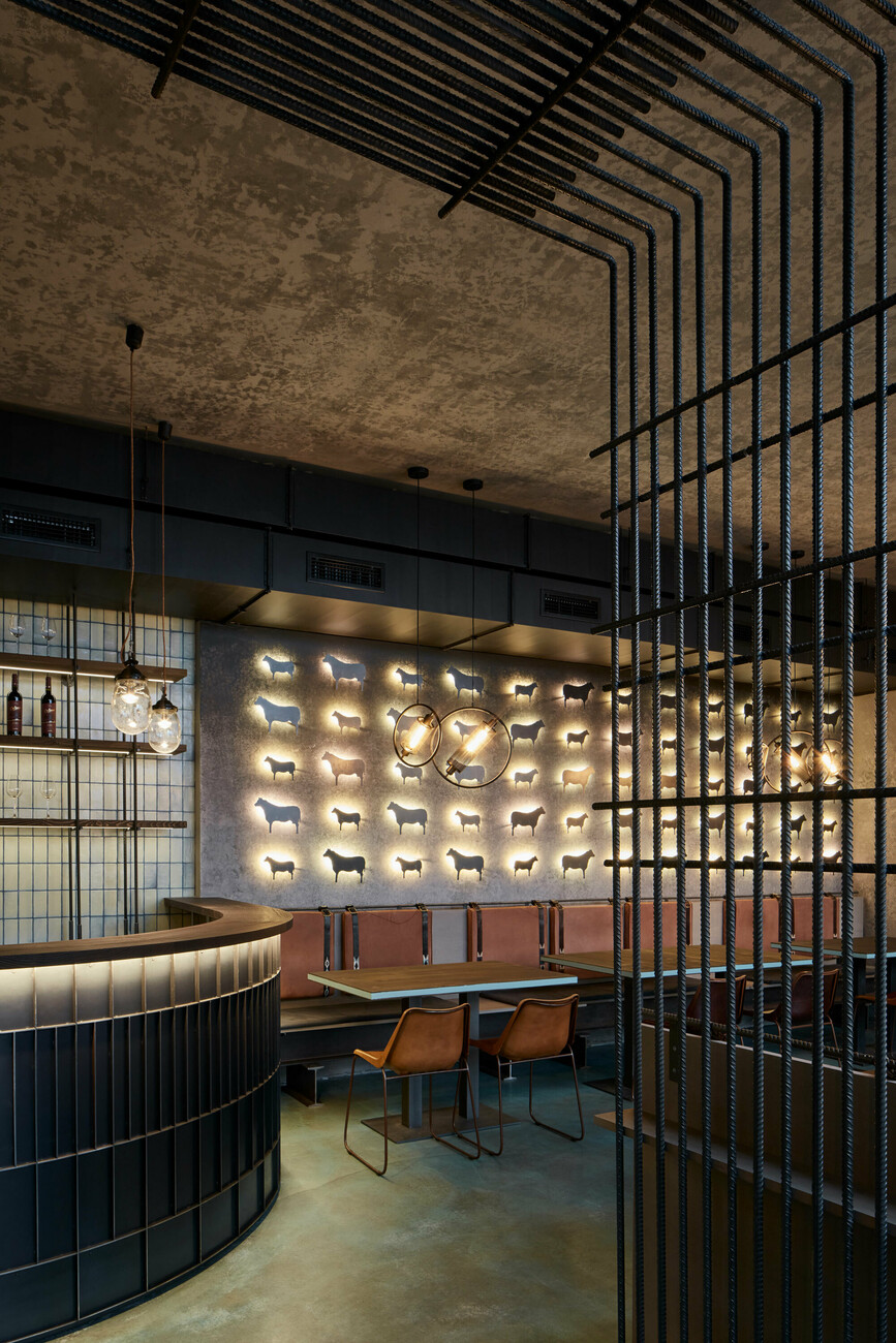 Fire, flame, heat, and coal are closely bound up with the identity of the Argentinian steak restaurant. After all, no fire means no goodies from the grill. This element, symbolic of energy, courage, and passion, was therefore chosen to form the heart of the kitchen, illuminating and heating the space at the same time, while likewise defining the atmosphere of the entire place. The food is simple yet delicious, the wine elegant and pleasing – as soon as they enter the premises, guests are comfortingly embraced by the warmth and energy of this very individually designed space. Here, design is not merely show and effect but conveys the passion and dedication with which the owner runs his restaurant. The bio-charcoal, which is produced in-house from organic waste from the kitchen, has been incorporated by the architects as the very essence of the new design: The new showpiece – a wall made of concrete blocks – resembles a display cabinet within which hover pieces of charcoal displayed like gems. The concept continues in the vault of the lounge at the rear, where a kind of baldachin made of floating charcoal pieces ingeniously sets the scene.