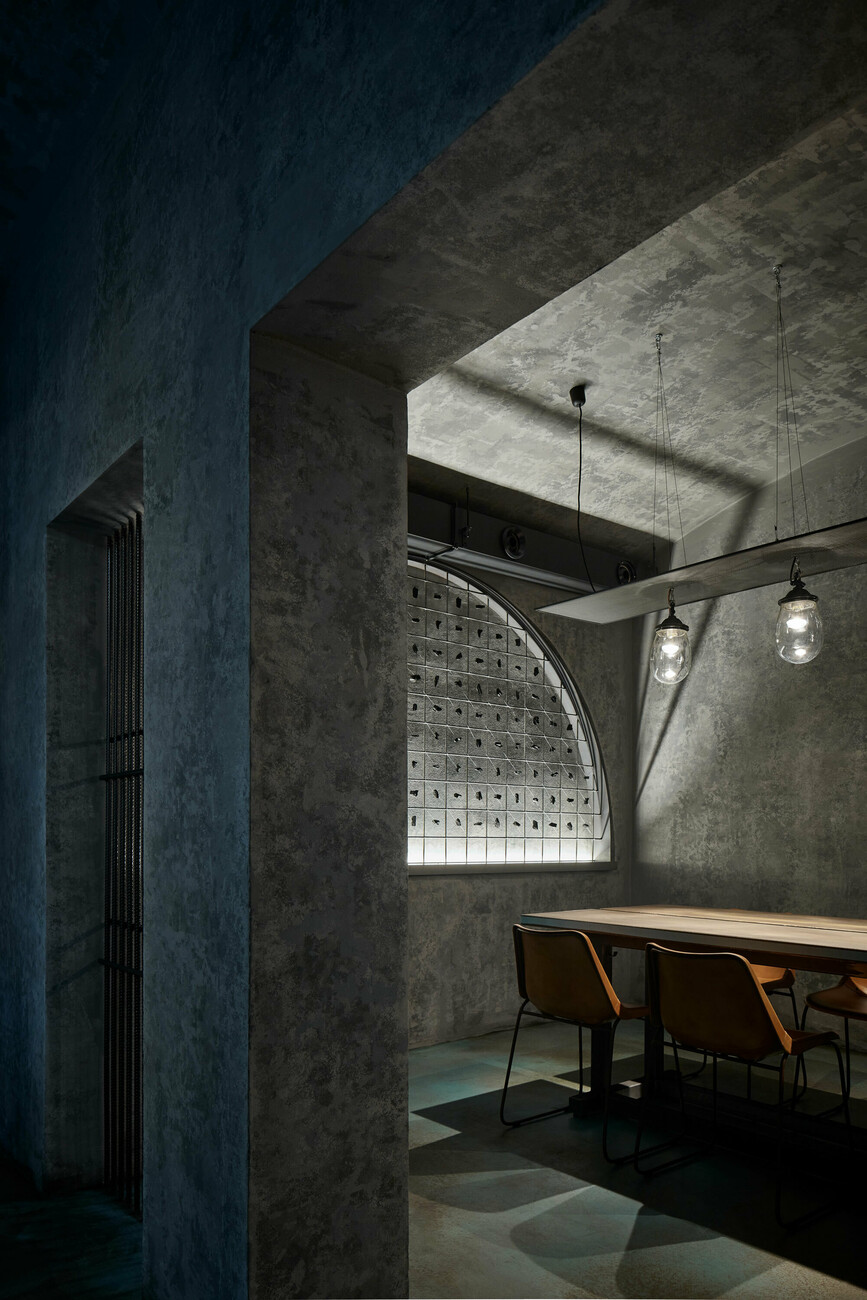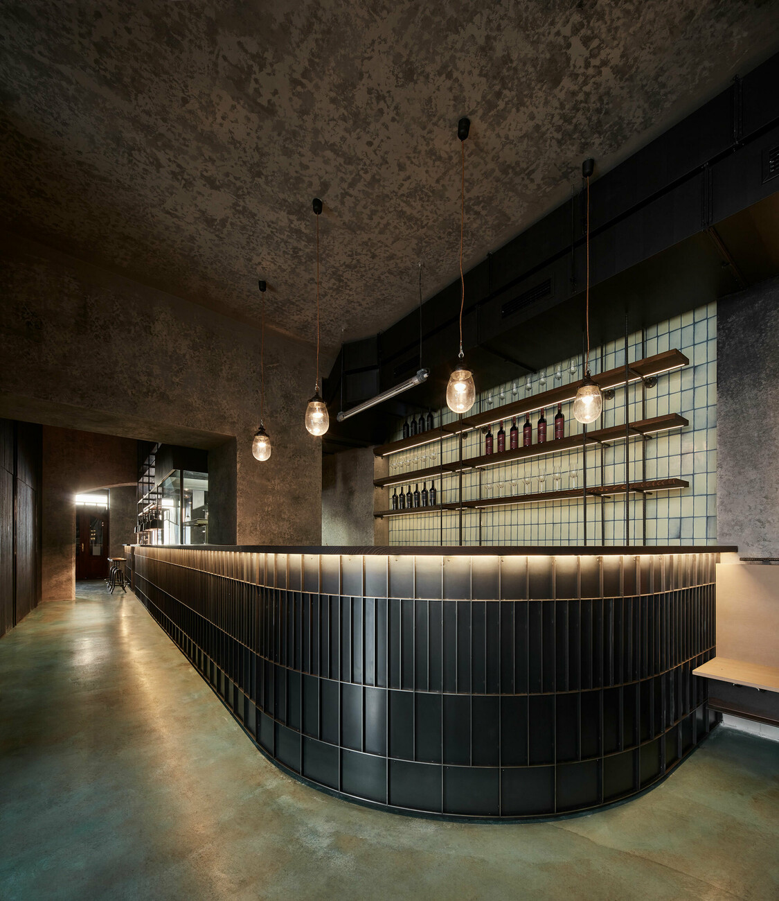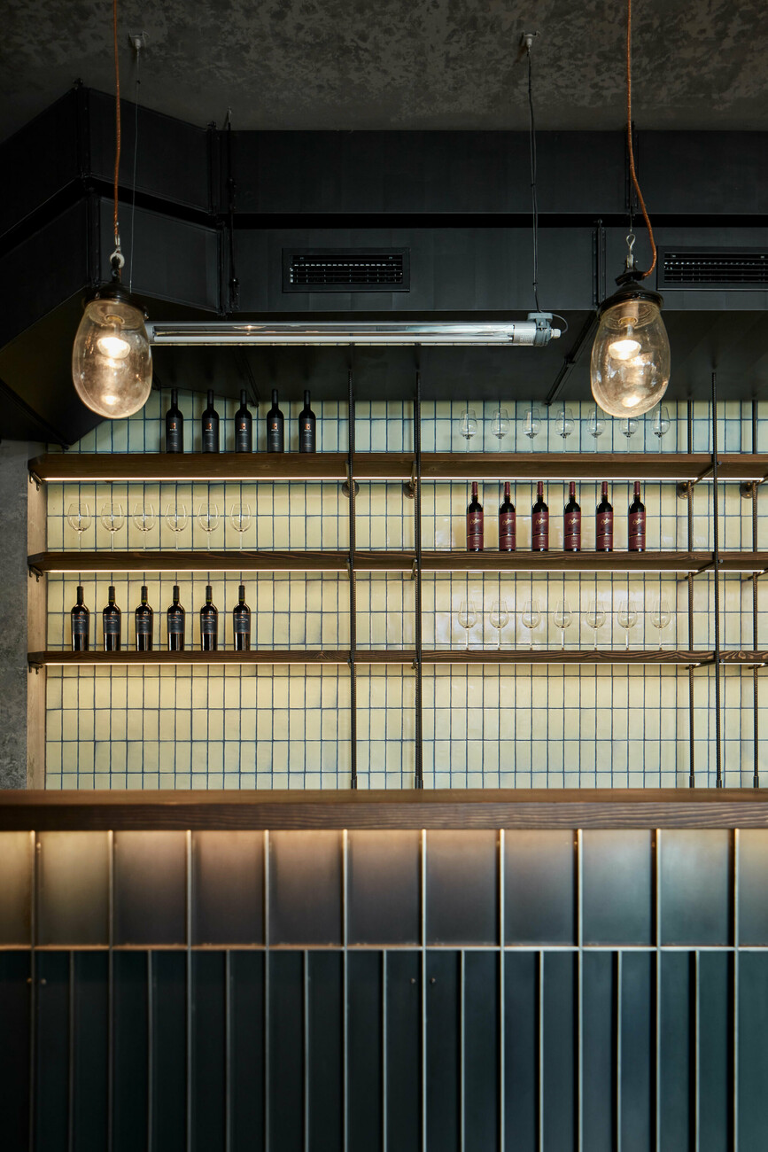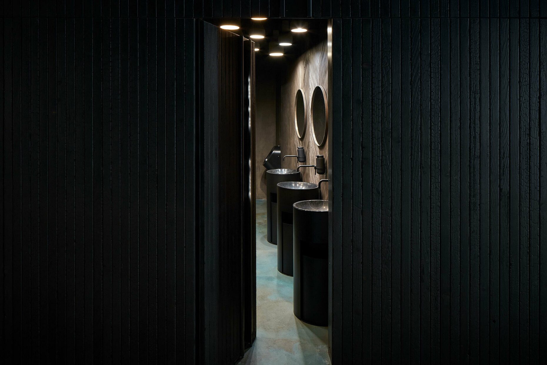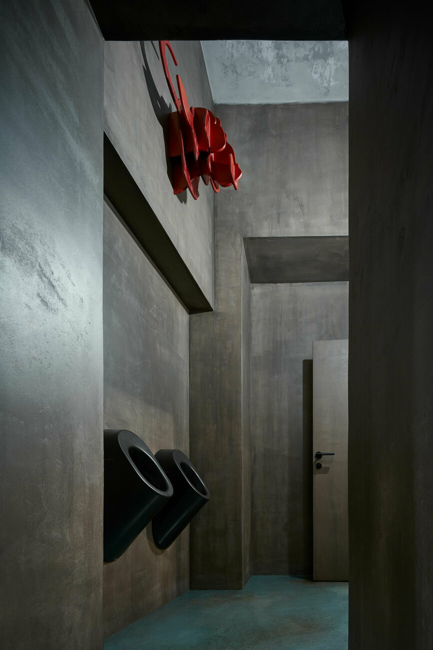 Fire, flame, heat, and coal are closely bound up with the identity of the Argentinian steak restaurant. After all, no fire means no goodies from the grill. This element, symbolic of energy, courage, and passion, was therefore chosen to form the heart of the kitchen, illuminating and heating the space at the same time, while likewise defining the atmosphere of the entire place. The food is simple yet delicious, the wine elegant and pleasing – as soon as they enter the premises, guests are comfortingly embraced by the warmth and energy of this very individually designed space. Here, design is not merely show and effect but conveys the passion and dedication with which the owner runs his restaurant. The bio-charcoal, which is produced in-house from organic waste from the kitchen, has been incorporated by the architects as the very essence of the new design: The new showpiece – a wall made of concrete blocks – resembles a display cabinet within which hover pieces of charcoal displayed like gems. The concept continues in the vault of the lounge at the rear, where a kind of baldachin made of floating charcoal pieces ingeniously sets the scene.