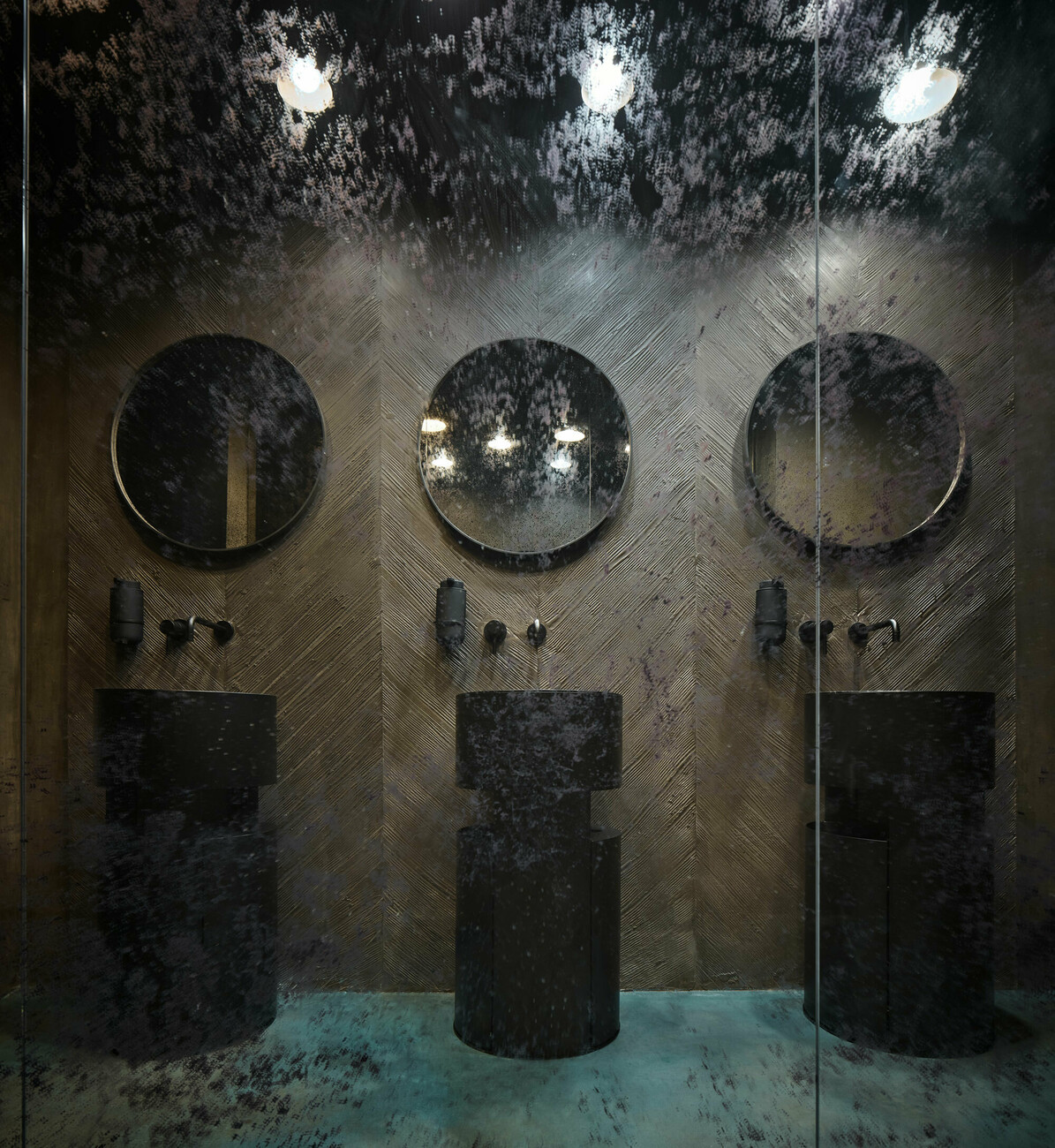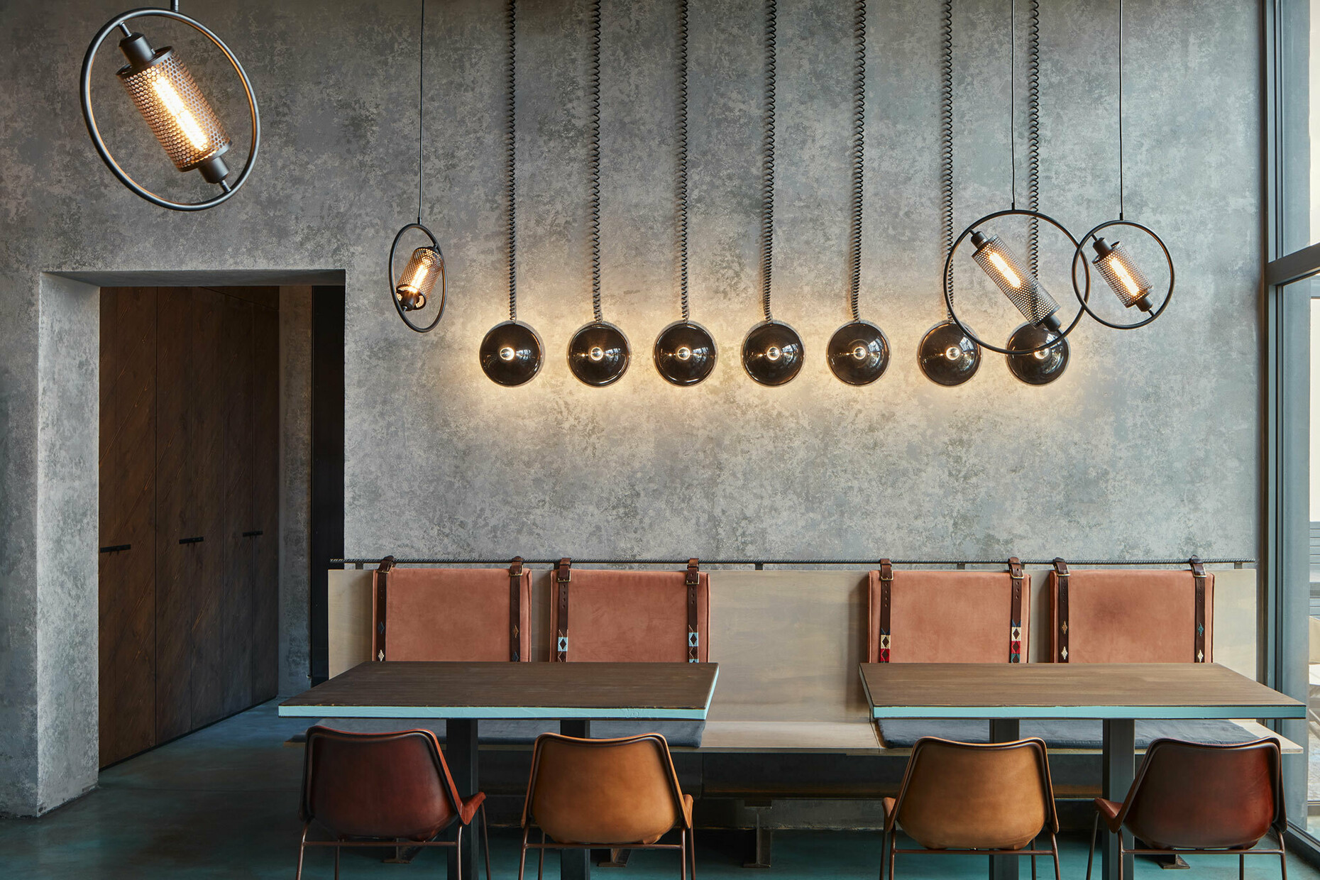 Although the interior is primarily made up of raw materials – namely steel and leather – that are combined with darker colors, Formafatal has nevertheless managed to ensure the atmosphere is by no means austere and cool, but rather warm and inviting. Individual design objects in a bright red color, the delicate execution of the exposed concrete walls, and the mirrors by Notre Monde and Industrial Antik lend the space its own character. Whether it’s down to the extravagant Chiswick Hoop pendant luminaires by Tudo & Co., the benches made specially for the restaurant, or the artful incorporation of the charcoal – the Gran Fierro is a place with its own unique atmosphere.