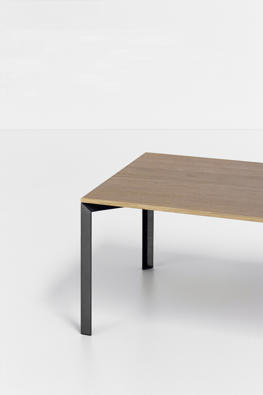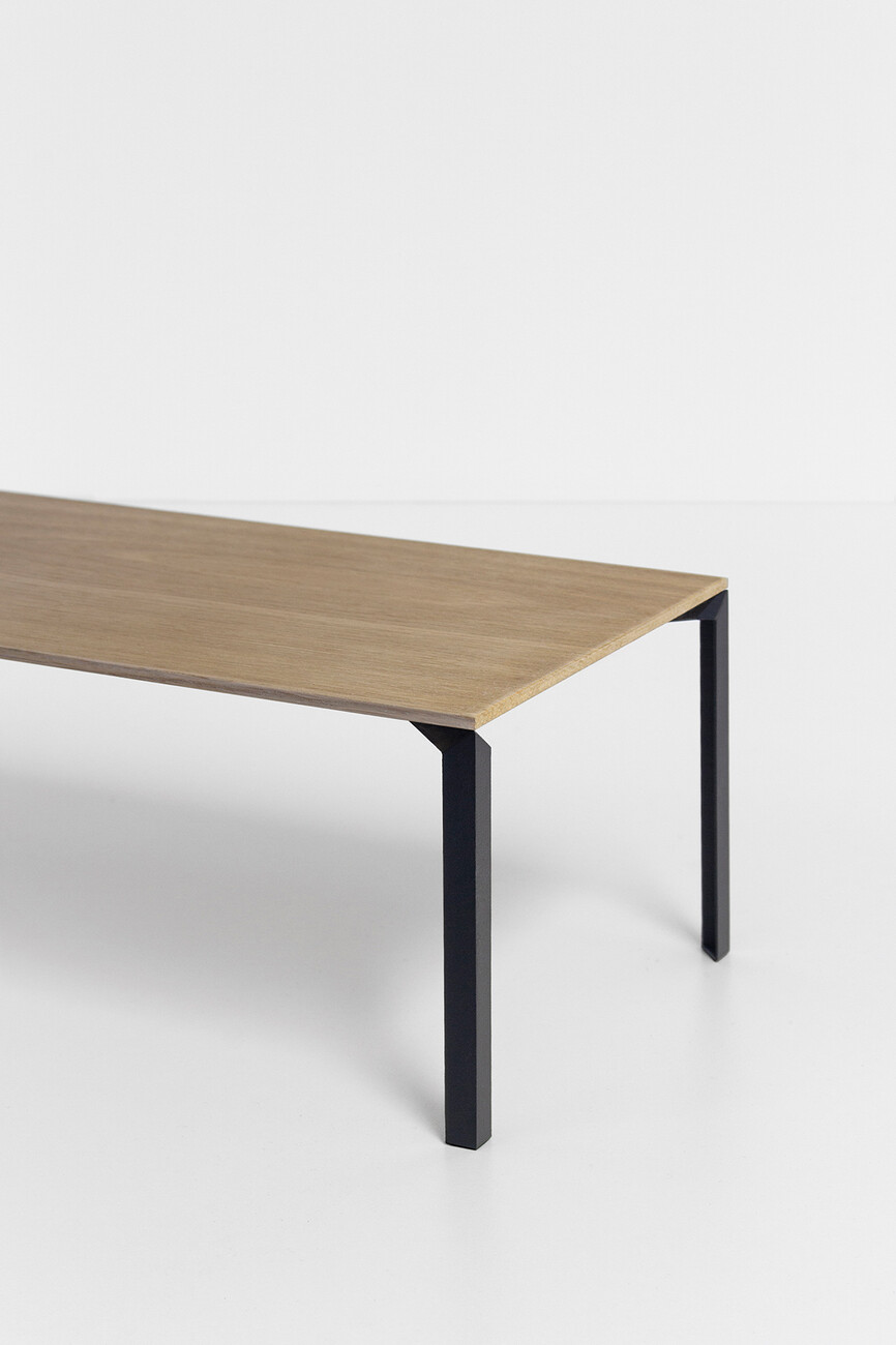 Guglielmo Poletti: Once again, the new piece is about precision and subtraction. The core aspects of the project are embodied in a single detail, around which all the work revolves: the joint between the leg and the table top, characterised by a contact reduced to an absolute minimum, based on the meeting of the respective vertices. The construction is achieved through a precise structural gesture – the combination of two L-shaped profiles, which are cut at 45° to be joined at 90°. The resulting geometry produces a sense of precarious balance. The configuration is very pure, and it must be accurate down to the last millimeter – if the edges are not perfectly lined up, you don’t get the desired effect. The stability is assured by a wonderful technical construction beneath the top, which keeps everything in place. For me, this project is the umpteenth demonstration that creating something simple and simultaneously powerful is a highly complex matter. Although I never set out to work like this on purpose, I ended up once more with a project that hinges on absolute precision. This seems to always be the decisive ingredient for my work to succeed.