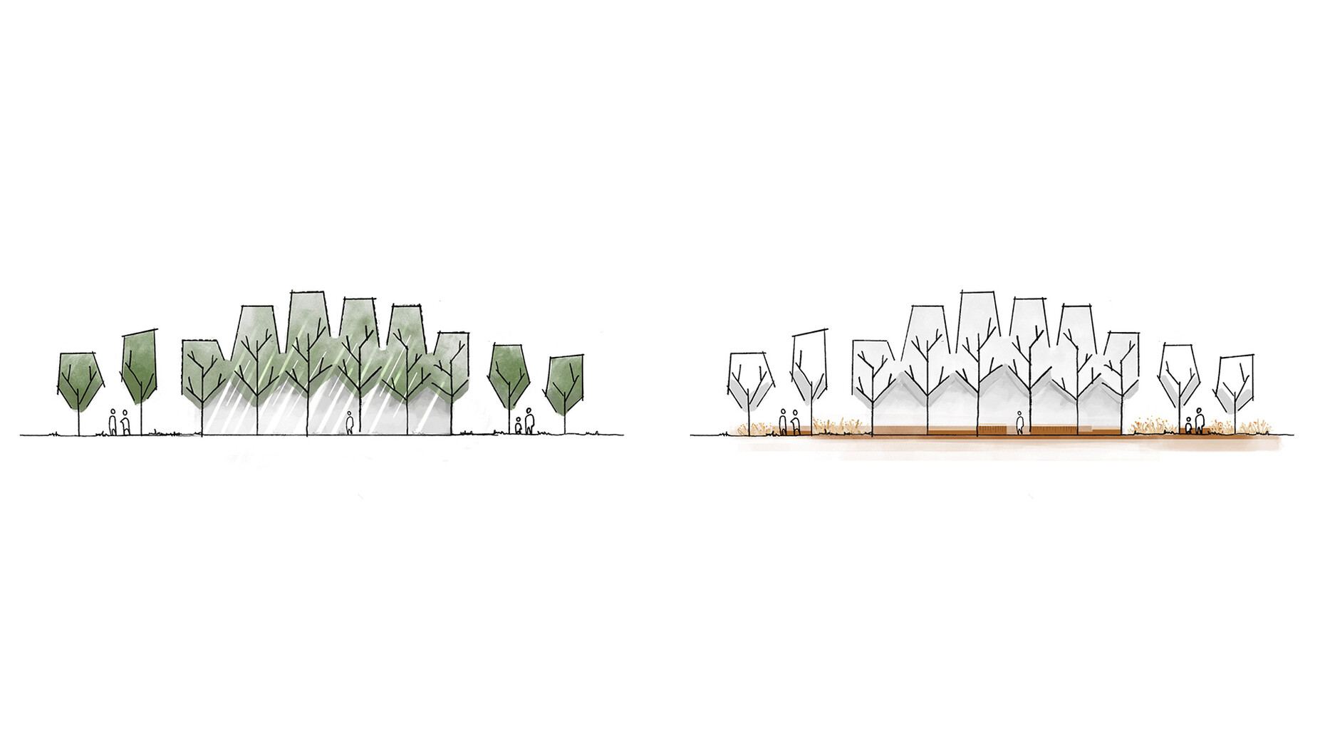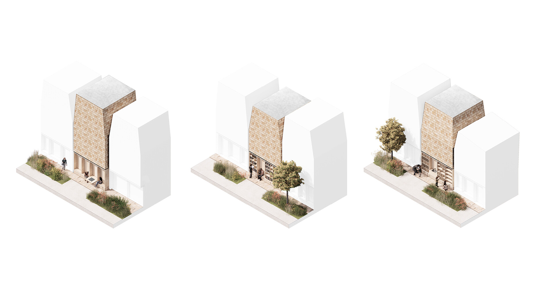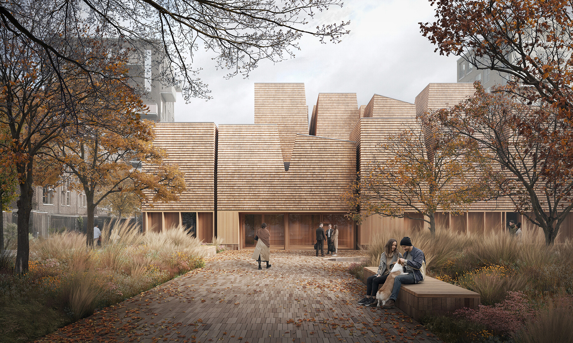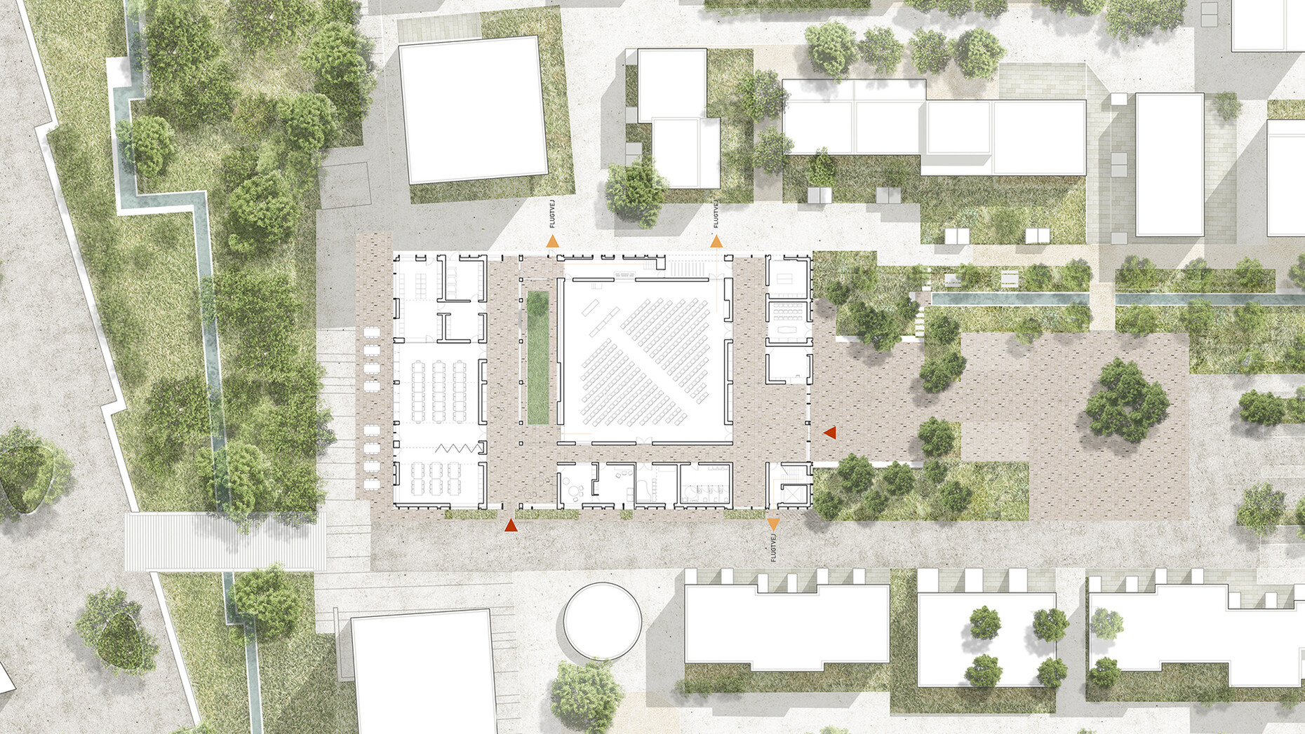 On the outside, the warm tones of the small wooden shingles dominate the appearance of the façades. They are made entirely from Canadian cedar tree remnants and take on a silver-grey tone over time. Where the façade does not consist of shop windows, it offers small seating niches, a cupboard for book exchanges, a small drinking fountain or even small tables for playing chess as an ‘urban shelf’. This is also intended to attract people and literally bring them closer to the building. The roof structure supports the desired expression. Instead of a single surface spanning the entire building, the house is visually broken up into individual cuboids by strong joints in the façades. These taper upwards in different directions, giving the structure a slightly organic feel without appearing overly playful. In a figurative sense, the individual bodies are meant to symbolise a community coming together – like people in a church or trees forming a forest. Towards the centre, this community becomes almost imperceptibly denser: above the large hall, 16 of these roof hoods sit like square honeycombs. At 13 metres, they are higher than the others and thus clearly mark the position of the hall, which is otherwise completely inside the building, from the outside.
