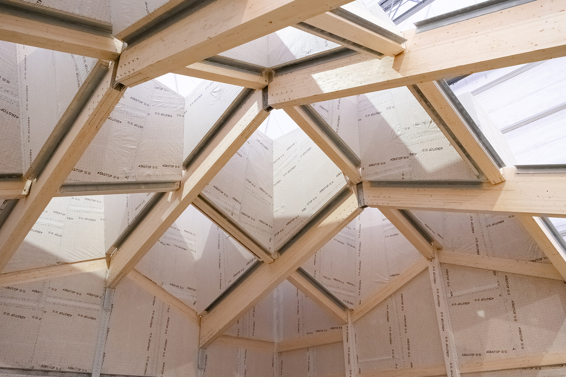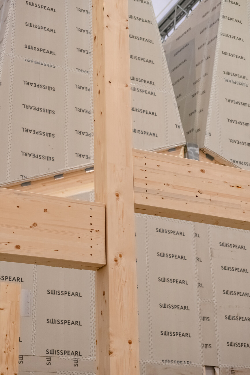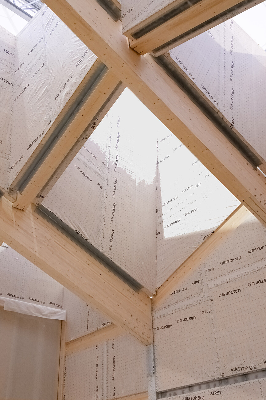 Each of the honeycombs above the hall contains a skylight through which filtered daylight falls. The space is thus intended to resemble a clearing in the forest, where the light casts ever-changing patterns on the floor throughout the day – a place of sensual contemplation that also connects with the landscapes in the nearby nature reserve, according to the architects at Henning Larsen. The light ceiling above the hall is the only place in the building where the structure had to be reinforced with steel beams and steel columns. Otherwise, the entire new church building is constructed as a skeleton structure made of glued laminated timber. The walls are being constructed as timber frame structures, and the ribbed ceilings are made of laminated veneer lumber. This results in significant CO2 savings compared to a conventional reinforced concrete building. I ask Greta Tiedje whether I can also see the design as a continuation of the centuries-old tradition of wooden churches in Scandinavia. Of course, she says, but it is also a contemporary interpretation of that history. ‘Tradition inspired the use of timber, warmth, and attention to detail, but the design creates a new kind of space –simultaneously sacred, social, and inclusive.’ But the sculptural roof construction, the usable shelf façade and the integrated landscape elements in the inner courtyard also demonstrate the contemporary continuation of tradition.