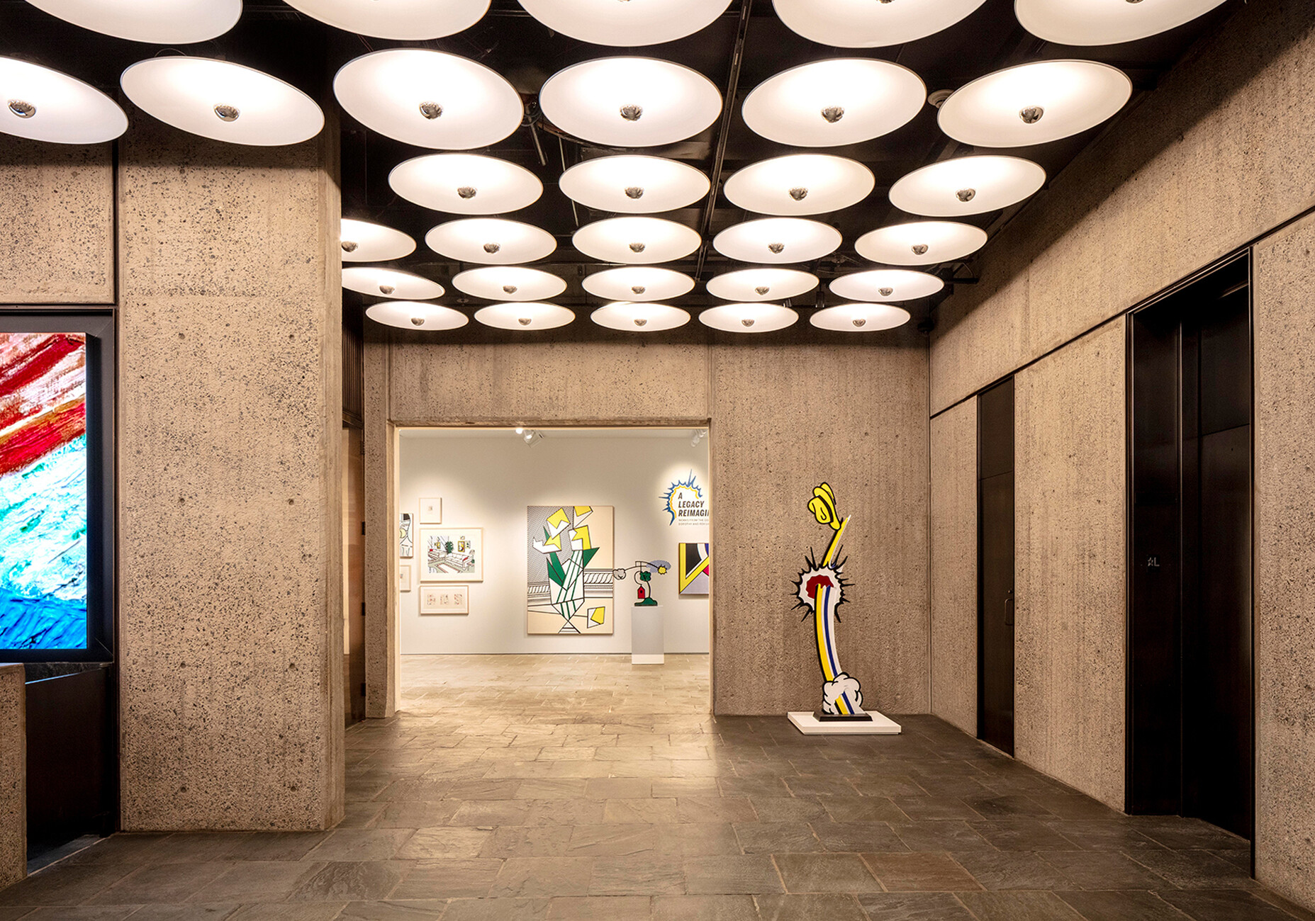The central lobby at "The Breuer" opens up to the cityscape with large glass surfaces. Breuer's striking, coordinated palette of materials has been retained, but individual functions have been carefully added. The original slate flooring throughout is complemented by fixtures, display cases and benches in dark mahogany and bronze. The rough walls with hammered concrete surfaces resemble natural stone. The striking ceiling lighting, consisting of light bulbs in white circular reflectors, has been converted to bespoke LEDs with a similar effect, based on Marcel Breuer's notes. Future exhibitions are announced in the new display cases, the reception and security desk are equipped with large LEDs, while the benches are originals by Marcel Breuer. ‘Our goal is to amplify Breuer’s artistic legacy, as well as the building’s material and historical significance, ensuring it functions as a premier exhibition and auction venue,’ summarises Wim Walschap, senior partner at Herzog & de Meuron and project manager for the renovation.