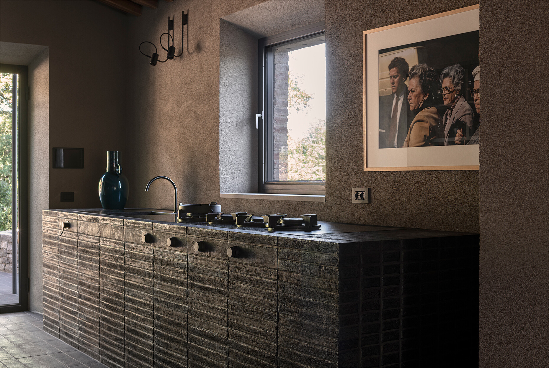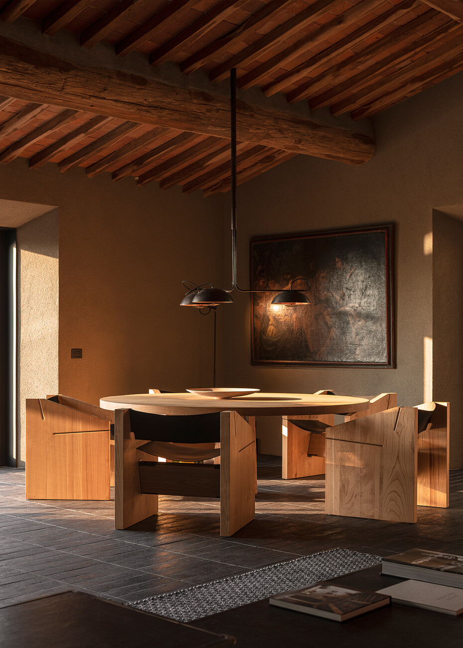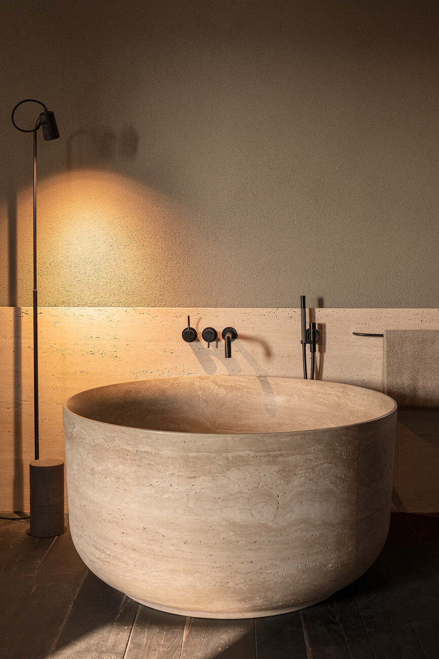 Tobias Petri has been familiar with the hilly landscape of the Chianti region since his childhood, having holidayed there countless times. For him, it was important to preserve local building traditions whilst nevertheless putting the team’s own spin on them at the same time. The new floor of the Casa Morelli is one example of this: Working with a brickworks in Impruneta, Petri developed a way of producing terracotta stones in anthracite instead of in red. Bricks from this material were used not only for all the flooring including the terrace, but also for construction of the kitchen units, the open fireplace and the outdoor kitchen. The showers are lined with wall tiles made of the same dark terracotta, which forms an exciting contrast with the wash basins and bathtubs, which were each created especially for this project from single pieces of travertine. For the furniture and lighting, Holzrausch was able to call upon the network of artists and designers it has befriended: A number of pieces of furniture were designed by the Austrian artist and craftsman Klaus Lichtenegger, who has lived in a neighboring village for many years himself, while the lights came from designers Jan Heinzelmann and Sami Ayadi at Studio OHA in Munich, who are both long-term collaborators of Konstantin Grcic. The building alterations according to the plans by Holzrausch give the quarrystone house an entirely new impression: Its once rustic appearance has given way to a discrete glamor, yet at the same time it has lost nothing of its authentic charm. Incidentally, anyone who wants to can see for themselves: Like many of its other projects, Holzrausch lets Casa Morelli as a holiday home.