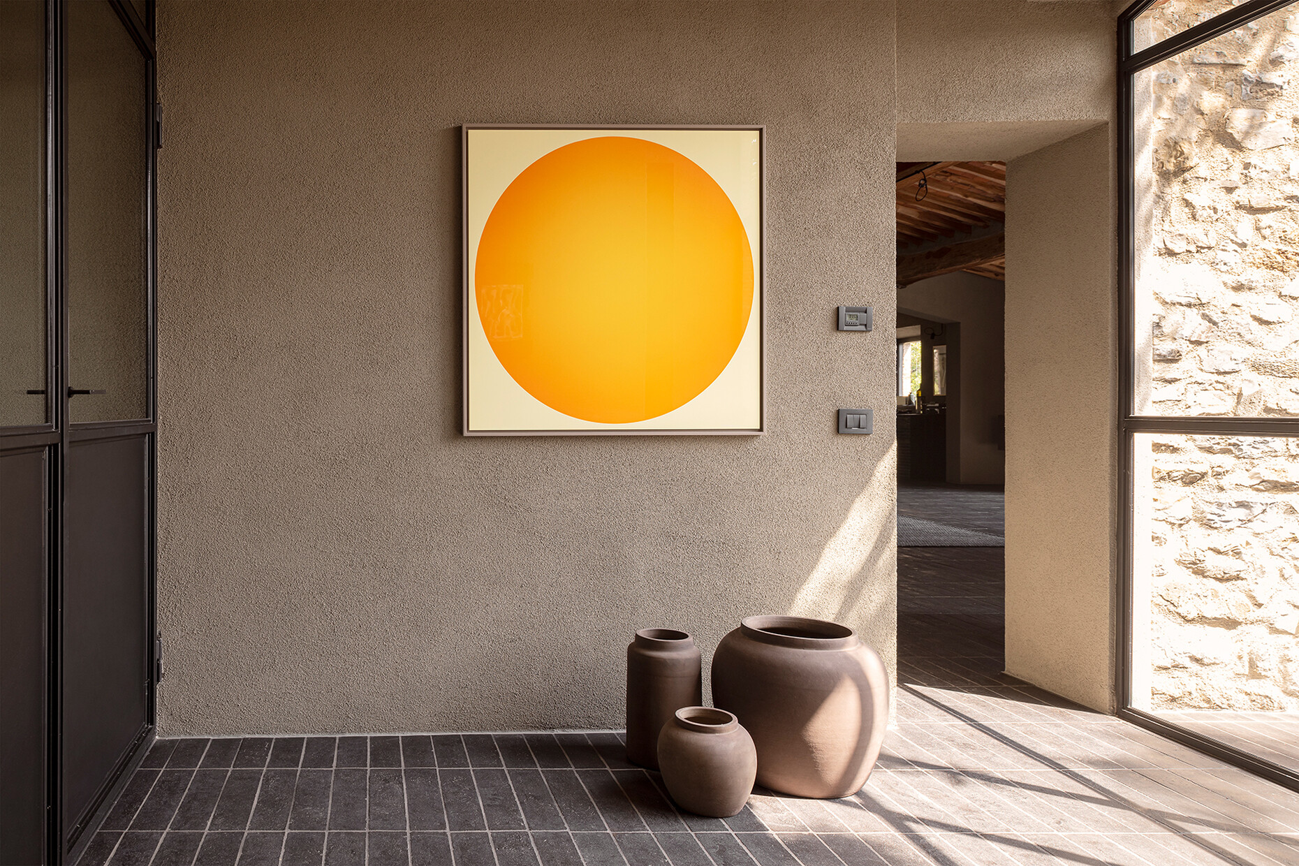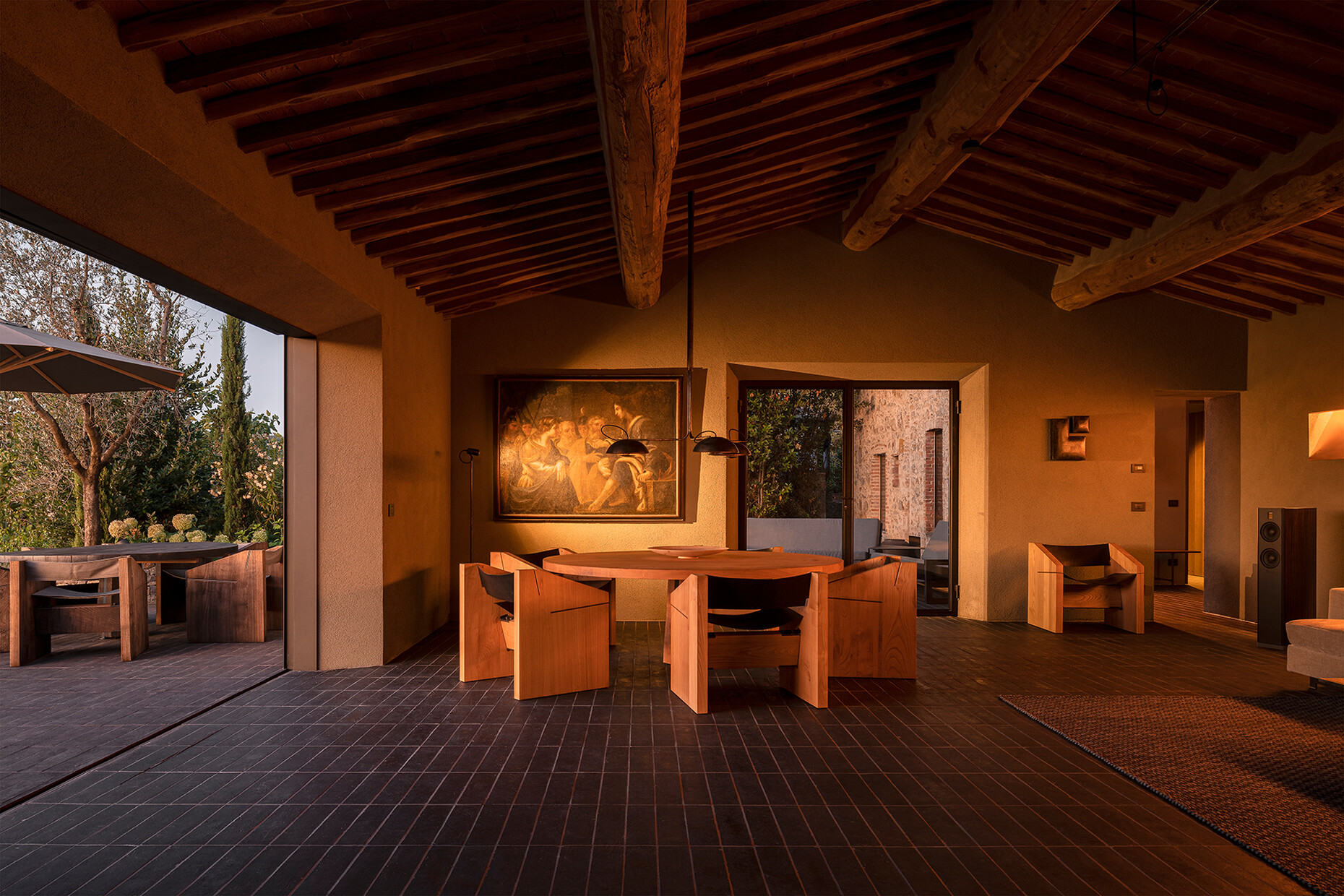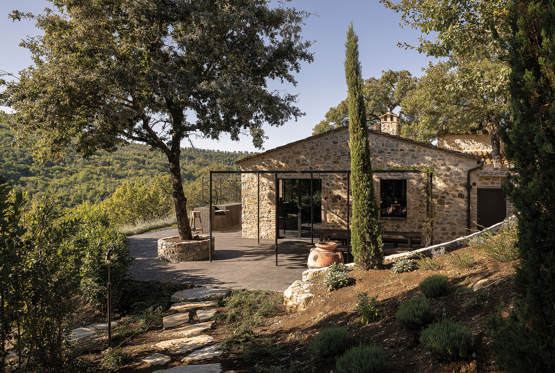 Tobias Petri has been familiar with the hilly landscape of the Chianti region since his childhood, having holidayed there countless times. For him, it was important to preserve local building traditions whilst nevertheless putting the team’s own spin on them at the same time. The new floor of the Casa Morelli is one example of this: Working with a brickworks in Impruneta, Petri developed a way of producing terracotta stones in anthracite instead of in red. Bricks from this material were used not only for all the flooring including the terrace, but also for construction of the kitchen units, the open fireplace and the outdoor kitchen. The showers are lined with wall tiles made of the same dark terracotta, which forms an exciting contrast with the wash basins and bathtubs, which were each created especially for this project from single pieces of travertine. For the furniture and lighting, Holzrausch was able to call upon the network of artists and designers it has befriended: A number of pieces of furniture were designed by the Austrian artist and craftsman Klaus Lichtenegger, who has lived in a neighboring village for many years himself, while the lights came from designers Jan Heinzelmann and Sami Ayadi at Studio OHA in Munich, who are both long-term collaborators of Konstantin Grcic. The building alterations according to the plans by Holzrausch give the quarrystone house an entirely new impression: Its once rustic appearance has given way to a discrete glamor, yet at the same time it has lost nothing of its authentic charm. Incidentally, anyone who wants to can see for themselves: Like many of its other projects, Holzrausch lets Casa Morelli as a holiday home.