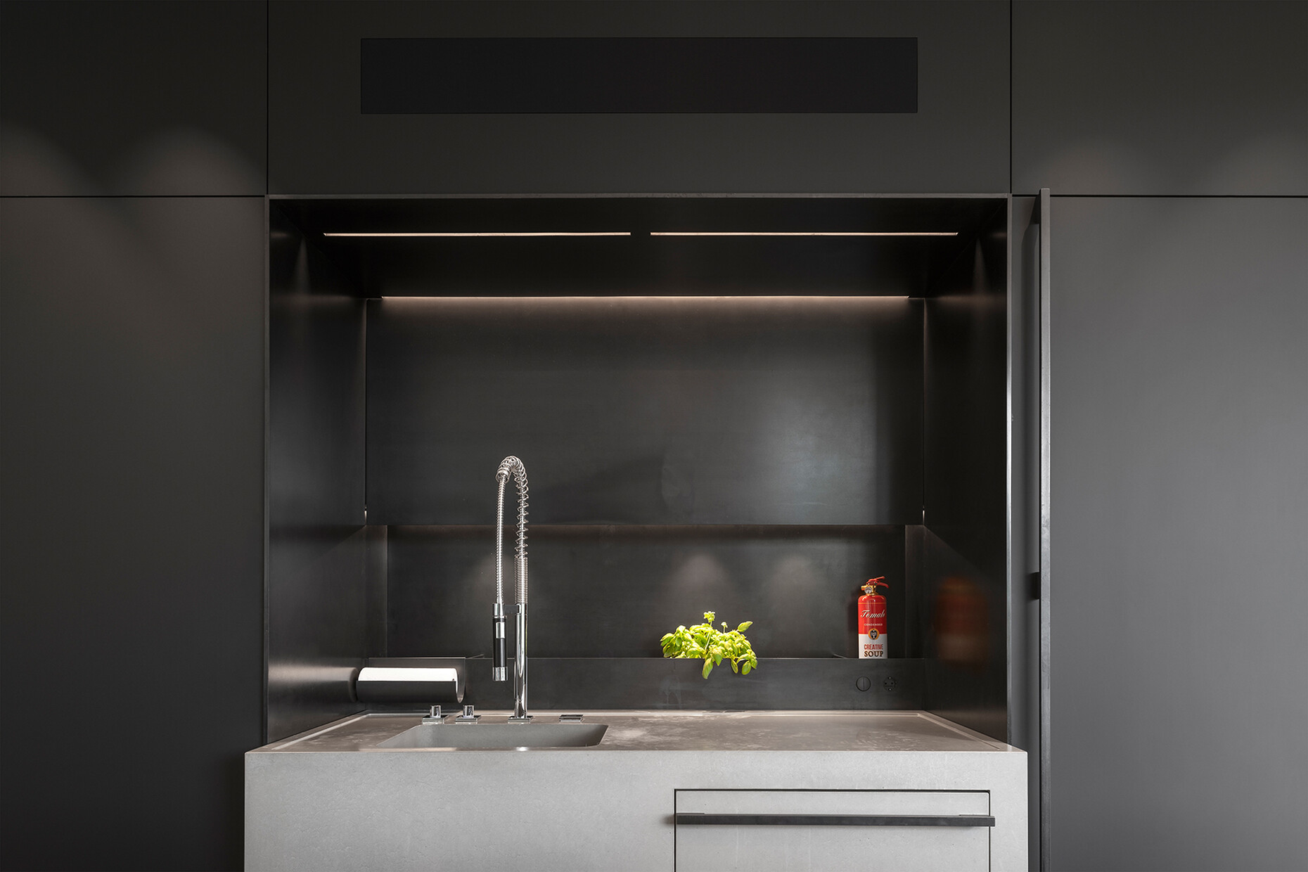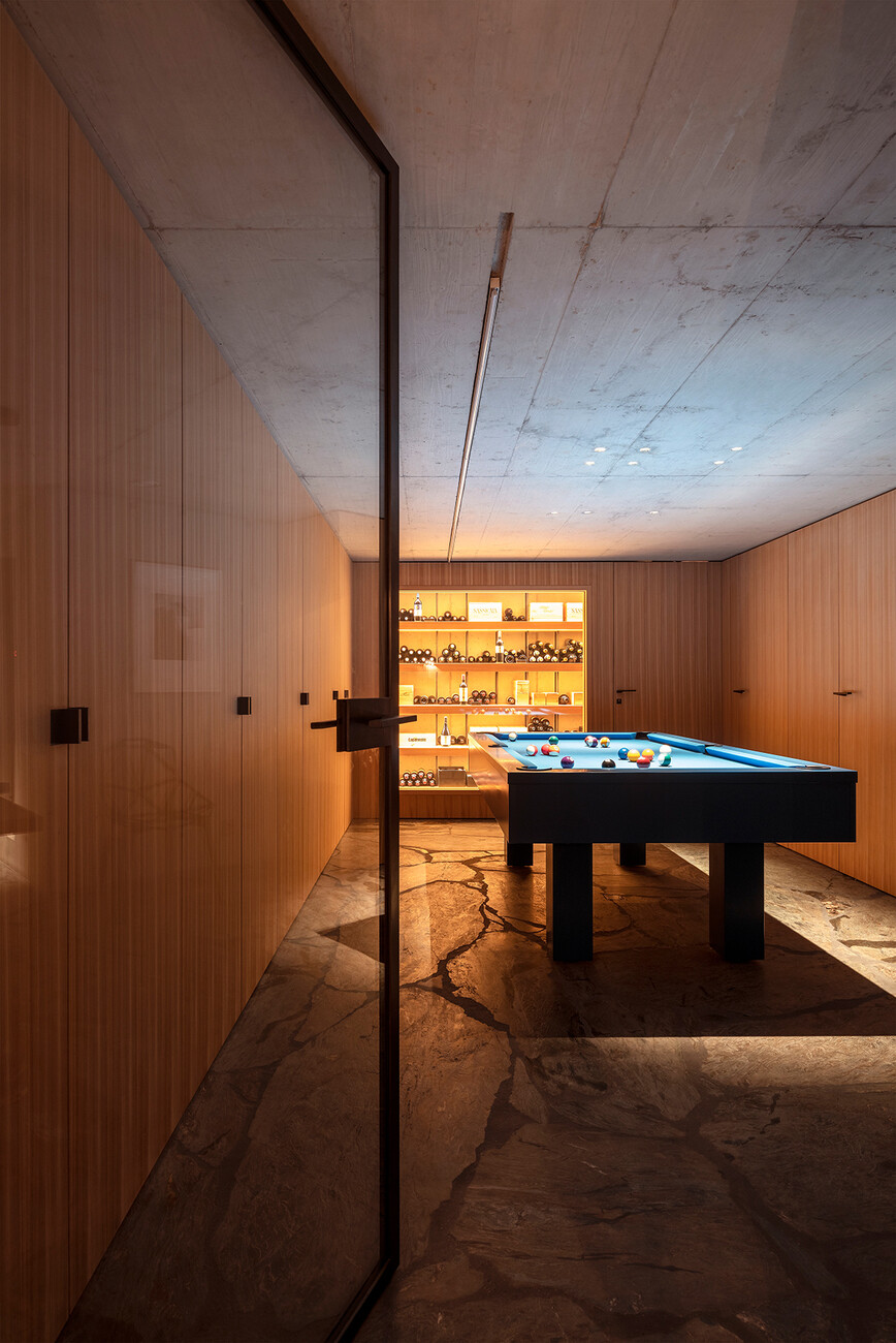 In the interior, Holzrausch used Swiss pine, the fine structure of which forms a sharp contrast with the concrete walls: “We deliberately refrained from using exposed concrete,” explains Petri, “since we wanted to show the traces of the formwork.” Even the irregular natural stone floor is only roughly carved and is not laid smooth. Like the work surfaces in the kitchen, it was made from stones that were brought to light during the excavations for the building’s foundations. Although the Turmhaus in the Zillertal and the apartment on Fisher Island may share the same reduced formal language and quality of execution, in aesthetic terms they are worlds apart: While the apartment in Miami is reminiscent of the timeless modern interior design of Ludwig Mies van der Rohe, the new-build in Austria is avantgarde. What the two designs share is the stylistic confidence with which they were designed – alongside high-quality craftsmanship, it’s the company’s secret to success.