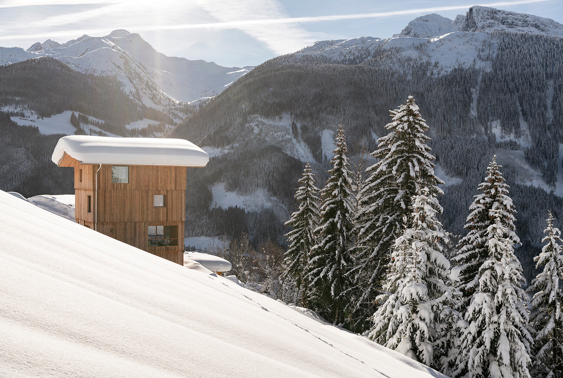 One project Tobias Petri tailored entirely to his own needs and tastes is the Turmhaus, which he built with the help of Grünecker Reichelt Architekten for himself and his family to enjoy in the Zillertal Alps. In contrast to most of the projects for clients, where the focus is on luxurious craftsmanship, the Turmhaus showcases the designers’ enthusiasm for natural materials, in this case the combination of wood and raw concrete. The building in the Zillertal consists entirely of these two materials: A three-story concrete plinth forms a base for three levels built of timber, while on the outside the building is clad entirely in larch wood. It was flame-treated twice to ensure no protective coatings were required for the wood, but also to enable it to fit better into the landscape. “We didn’t want a light-colored house, but rather one that matched the hay barns around it that had been burnt dark by the sun over the decades and centuries,” explains Tobias Petri.