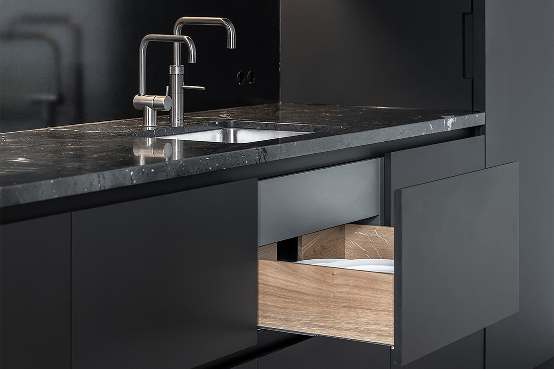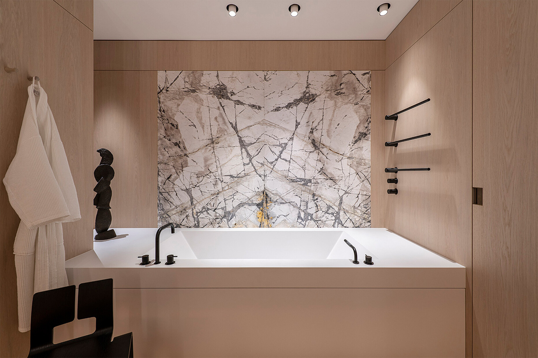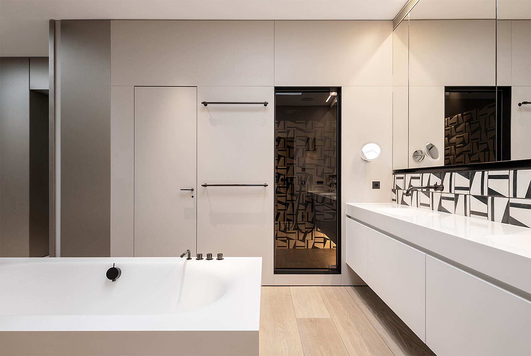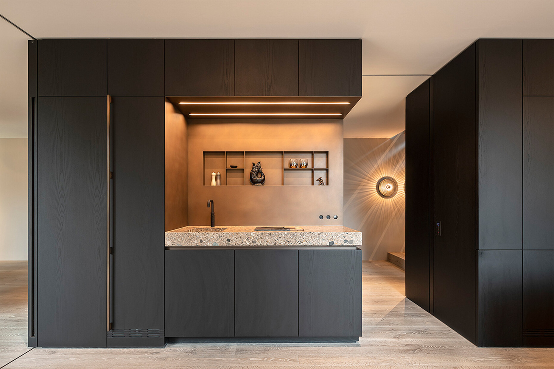 “We have a very broad approach and love the fact that our work is so diverse,” says Sven Petzold, who established Holzrausch together with Tobias Petri a good 20 years ago. All their projects share a holistic approach that starts with a close analysis of the existing situation. “We take our cue from the architectural idea and adapt it to the situation, everything is individually designed, planned and produced,” says Petzold. However, the name “Holzrausch” is to be seen more as a label since Tobias Petri and Sven Petzold might both be qualified master carpenters but the range of material, they work with is not restricted to wood by any means. Glass, stone and metals are just as much part of the portfolio also with regard to their own identity and the respective effect on the atmosphere of the room. How does the surface alter over time? Does it develop a patina? Can the interior fittings be made completely of one material or might a highly varied combination be feasible? Are specific accents conducive to producing a consistent overall appearance or is a clear design statement needed? The Holzrausch team consults with clients to answer these questions, considers what materials are necessary on account of the architecture, selects large-format patterns that the clients can peruse at their leisure. “We like to actively involve the clients in the process, explain our choice of materials and their properties, let their wishes and ideas flow into the process. It is up to us, after all, to ensure that they feel happy with the final result,” says Petzold. Based on the principle of “a single source” they sometimes design the complete interior of a building from the flooring and rendering through to the door handles.